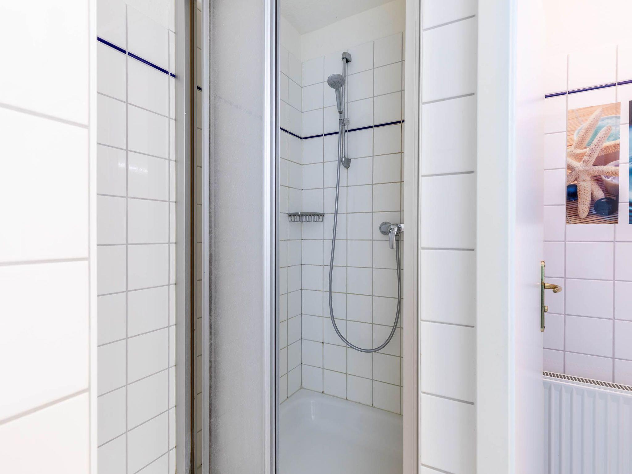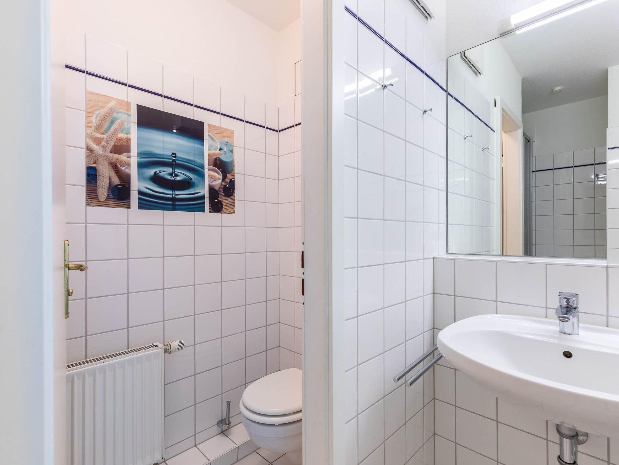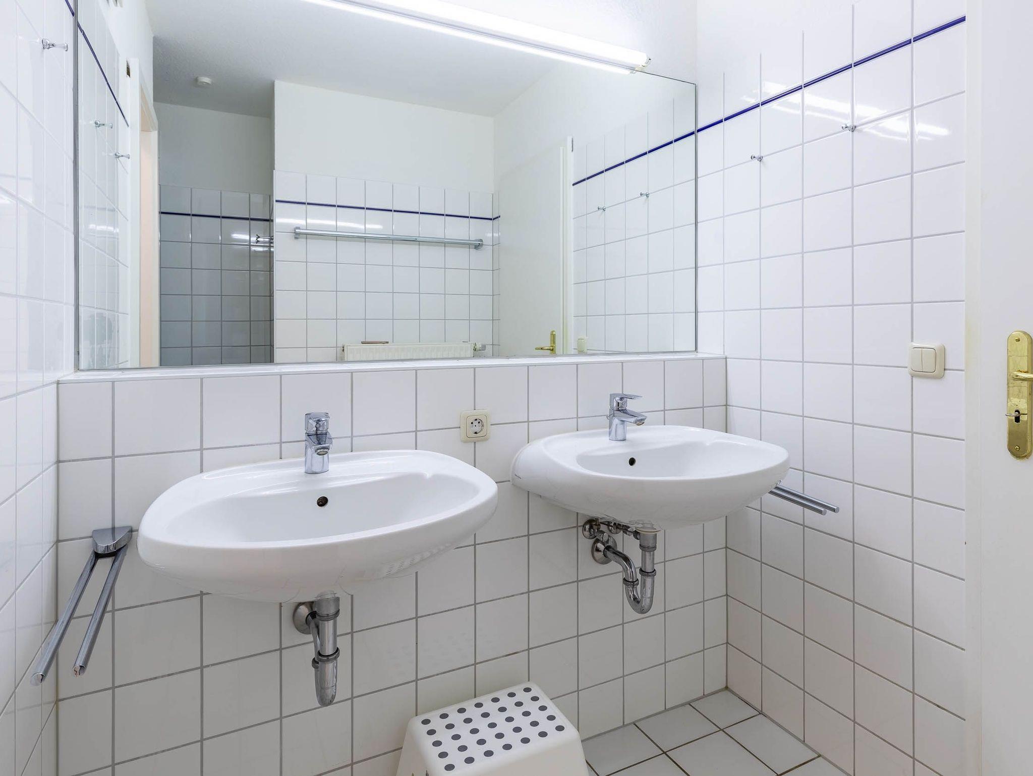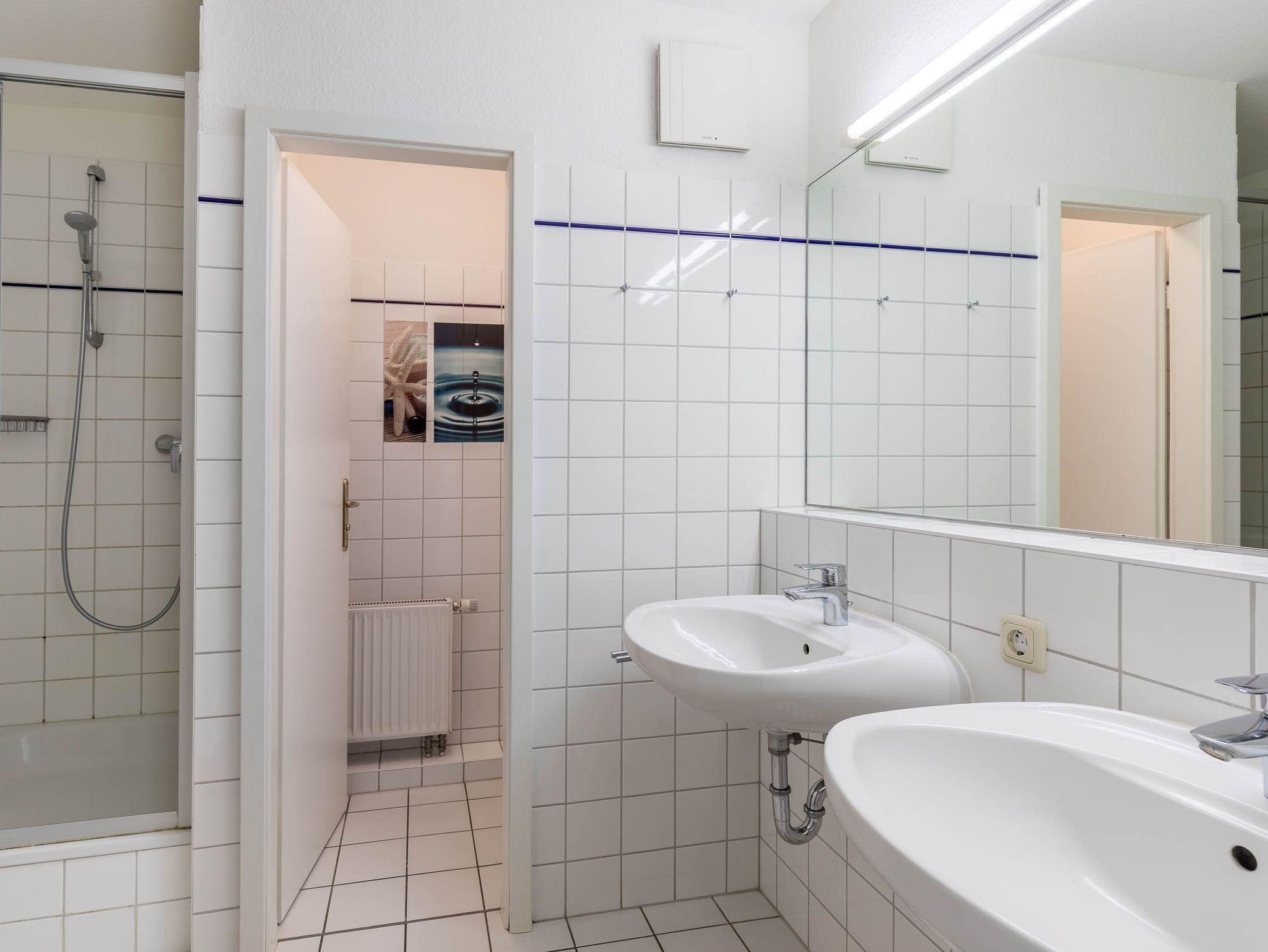 Starten Sie den Tag im hellen, gefliesten Duschbad mit Dusche und WC und zwei Waschbecken. Das WC ist getrennt vom Waschbereich.