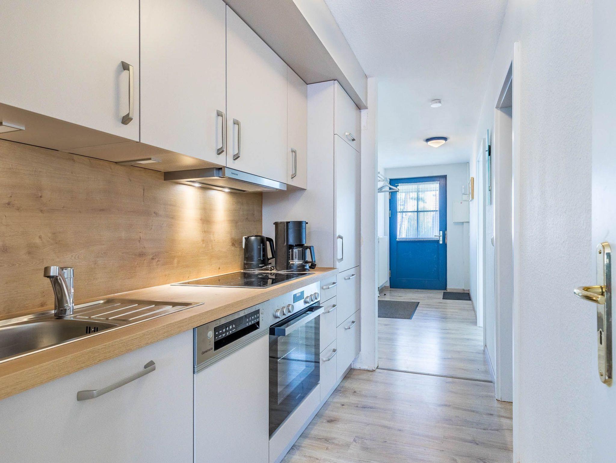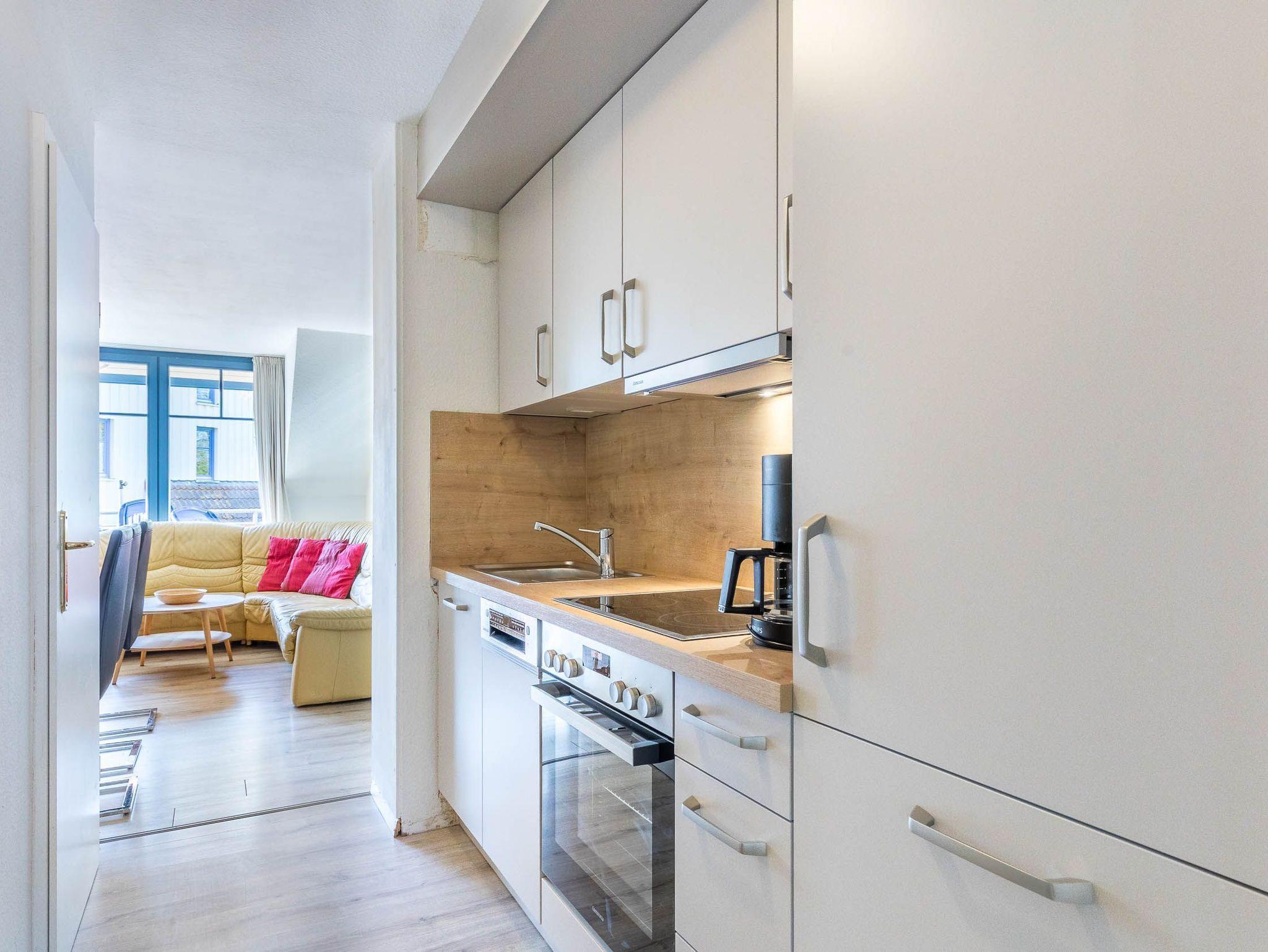 Die Küchenzeile ist gut ausgestattet. So finden Sie einen Backofen mit Herdplatten, Mikrowelle, Spülmaschine, Toaster, Wasserkocher und ebenso eine Kaffeemaschine. Gemeinsame Mahlzeiten nehmen Sie am Esstisch ein, der mit vier Schwingstühlen bestückt ist. Vom Essbereich aus blicken Sie direkt auf den Balkon mit Gartenmöbeln.