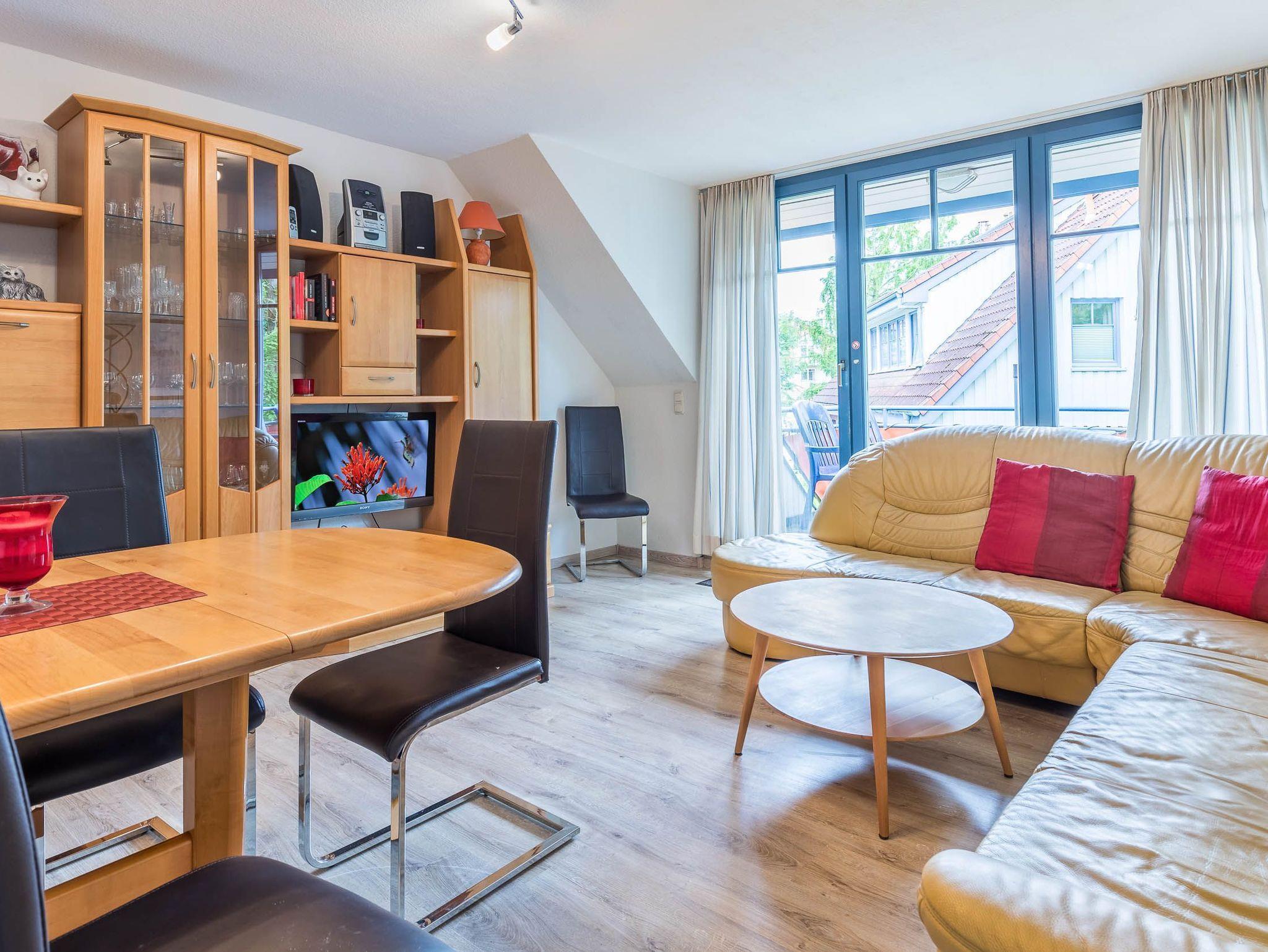 Die Ferienwohnung verfügt über einen verbundenen Wohn- und Essbereich mit integrierter Küchenzeile. Der Wohnbereich mit großer Sofalandschaft ist hell und gemütlich möbliert. Für Ihre Multimediaunterhaltung sorgen ein SAT-TV und eine kleine Musikanlage.