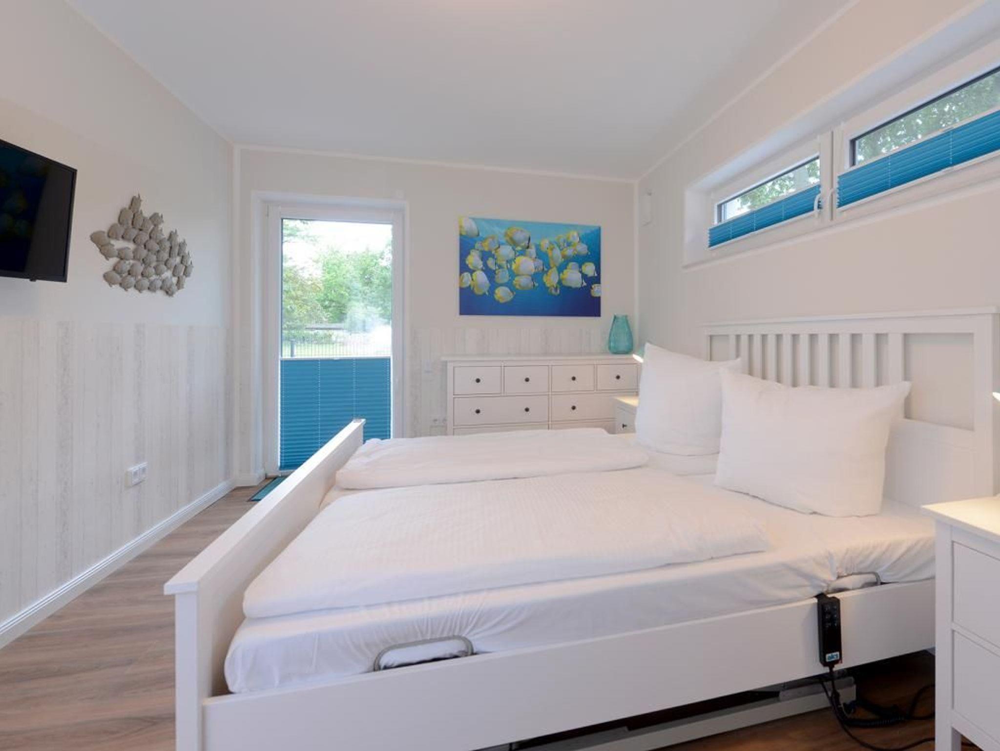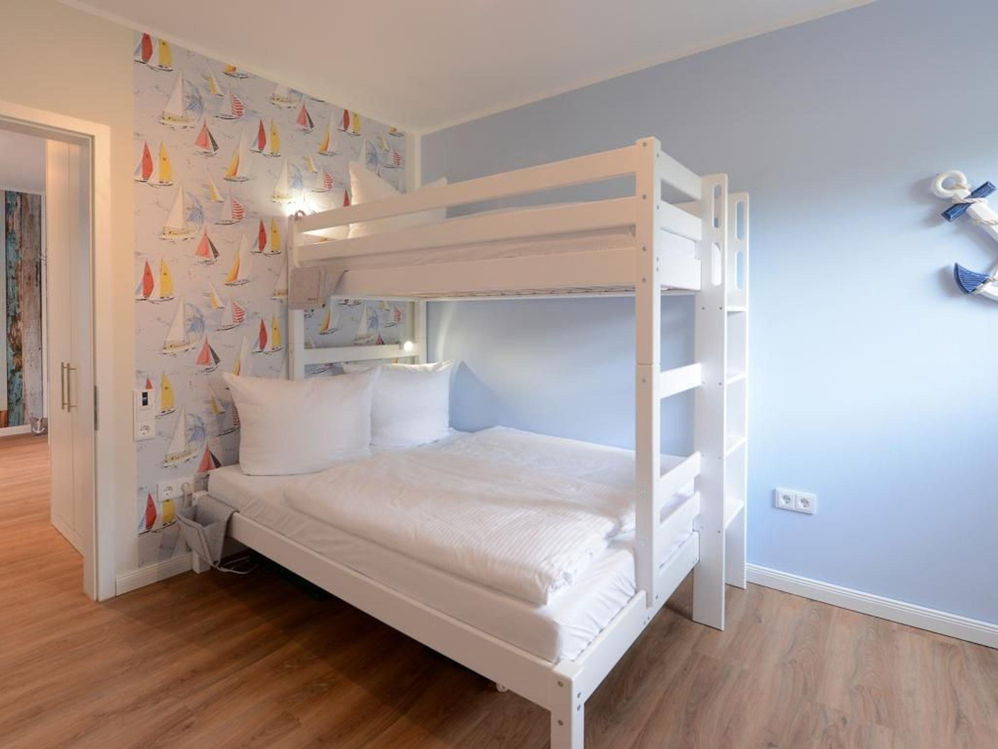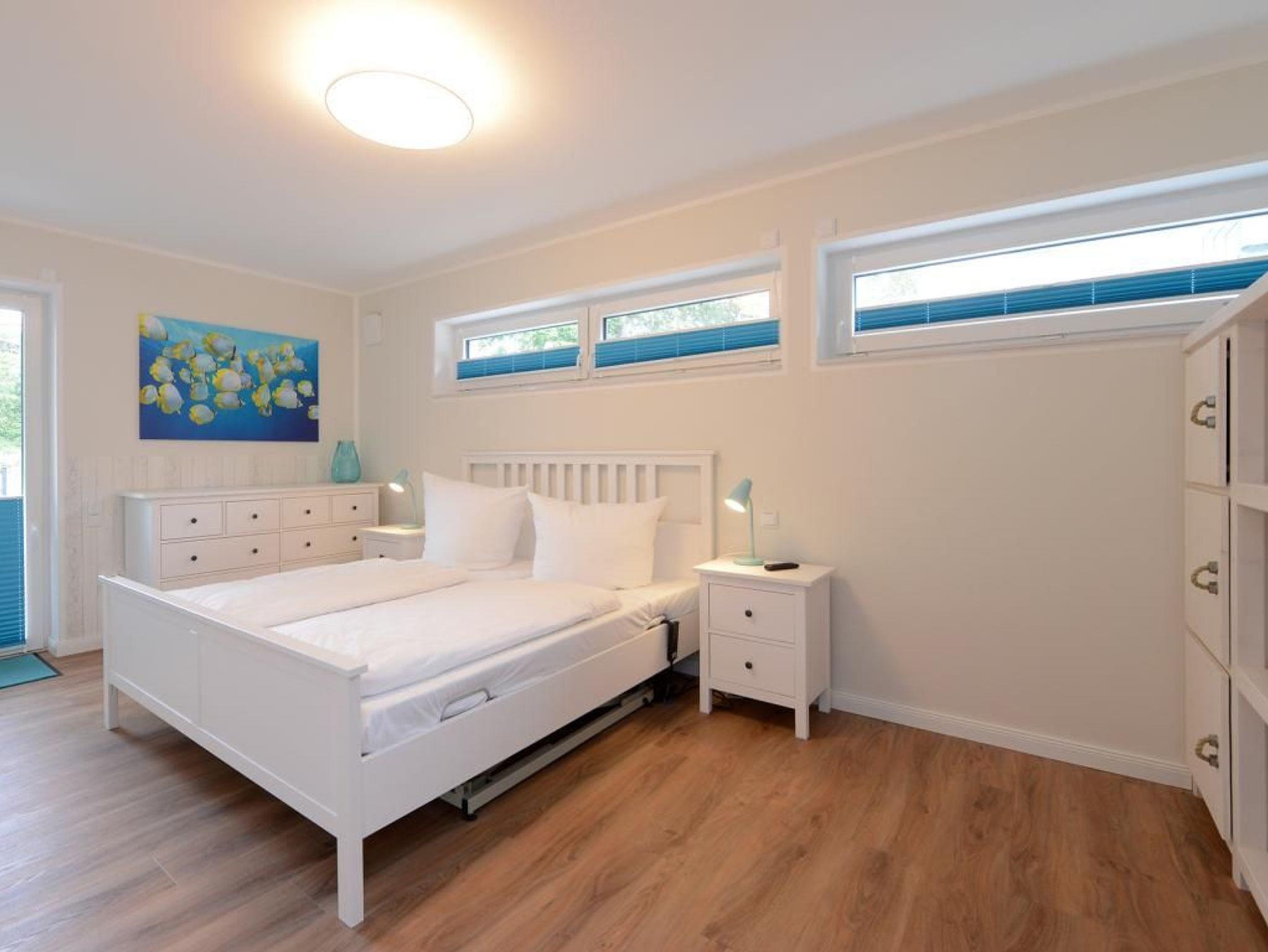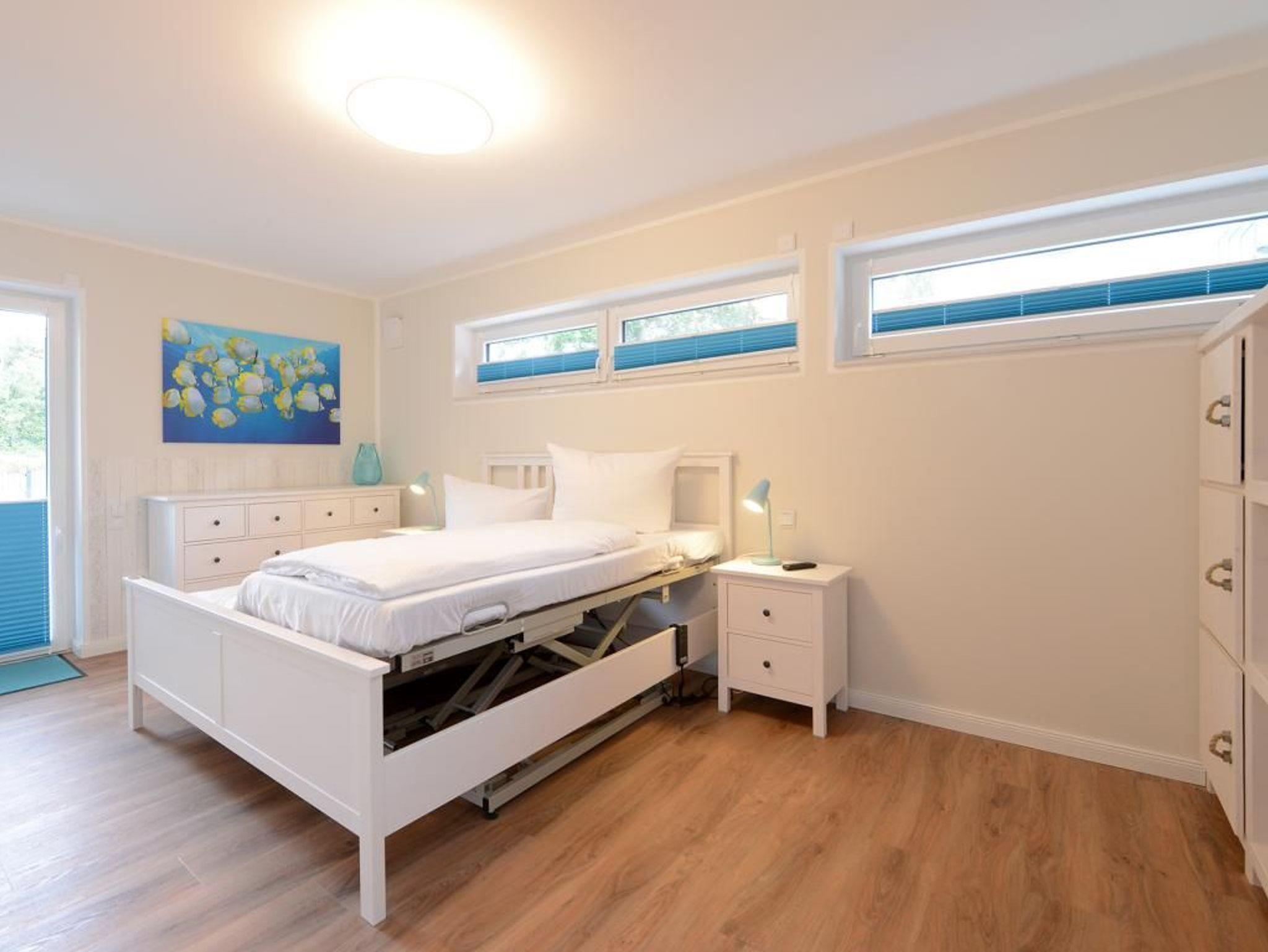 Das barrierefreie Appartement im Erdgeschoss bietet auf 81 qm sehr komfortablen Wohnraum für bis zu 4 Personen und eignet sich ideal für einen entspannten Urlaub in strandnaher Lage. Zwei möblierte Terrassen, ein großzügiger Wohn- und Essbereich, eine voll ausgestattete Küche sowie zwei separate Schlafzimmer schaffen beste Voraussetzungen für erholsame Ferientage. Der helle Wohnbereich mit bodentiefen Fenstern, gemütlichem Sofa und Essplatz geht fließend in die moderne Küche mit Induktionsherd, Backofen, Geschirrspüler und umfangreicher Ausstattung über. WLAN, ein internetfähiger Fernseher und eine Musikanlage sorgen für zeitgemäßen Komfort. Der Wohn-/Küchenbereich lässt sich durch eine Schiebetür vom restlichen Wohntrakt trennen. Beide Schlafzimmer sind hochwertig sowie mit Fernseher eingerichtet. Eines verfügt über ein Doppelbett mit einseitiger Hubfunktion und elektrisch verstellbarer Liegefläche sowie Terrassenzugang, das zweite über ein Katamaran Bett (untere Matratze 1,40 x 2,00 m, obere Matratze 0,90 x 2,00 m) und eignet sich ideal für bis zu drei Kinder. Bei Anreise sind bezogene Betten für zwei Personen inklusive. Das moderne, rollstuhlgerechte Tageslichtbad ist mit ebenerdiger Dusche, unterfahrbarem Waschbecken (Höhe 74,5 cm) sowie einem WC mit Sitzhöhe 48 cm und Haltegriff in 86 cm Höhe ausgestattet. Fußbodenheizung und Klimatisierung sorgen ganzjährig für angenehme Temperaturen. Elektrische Verschattung, Insektenschutz sowie ein extrabreiter Tiefgaragenstellplatz gegen Gebühr (max. Höhe 1,95 m, max. Länge 5,30 m) und eine Fahrradabstellmöglichkeit für mitgebrachte Fahrräder runden das Angebot ab. Ein komfortables Feriendomizil für Gäste, die Barrierefreiheit, Erholung und die Nähe zum Meer ? nur 50 Meter- schätzen. Nichtraucher. Keine Haustiere.