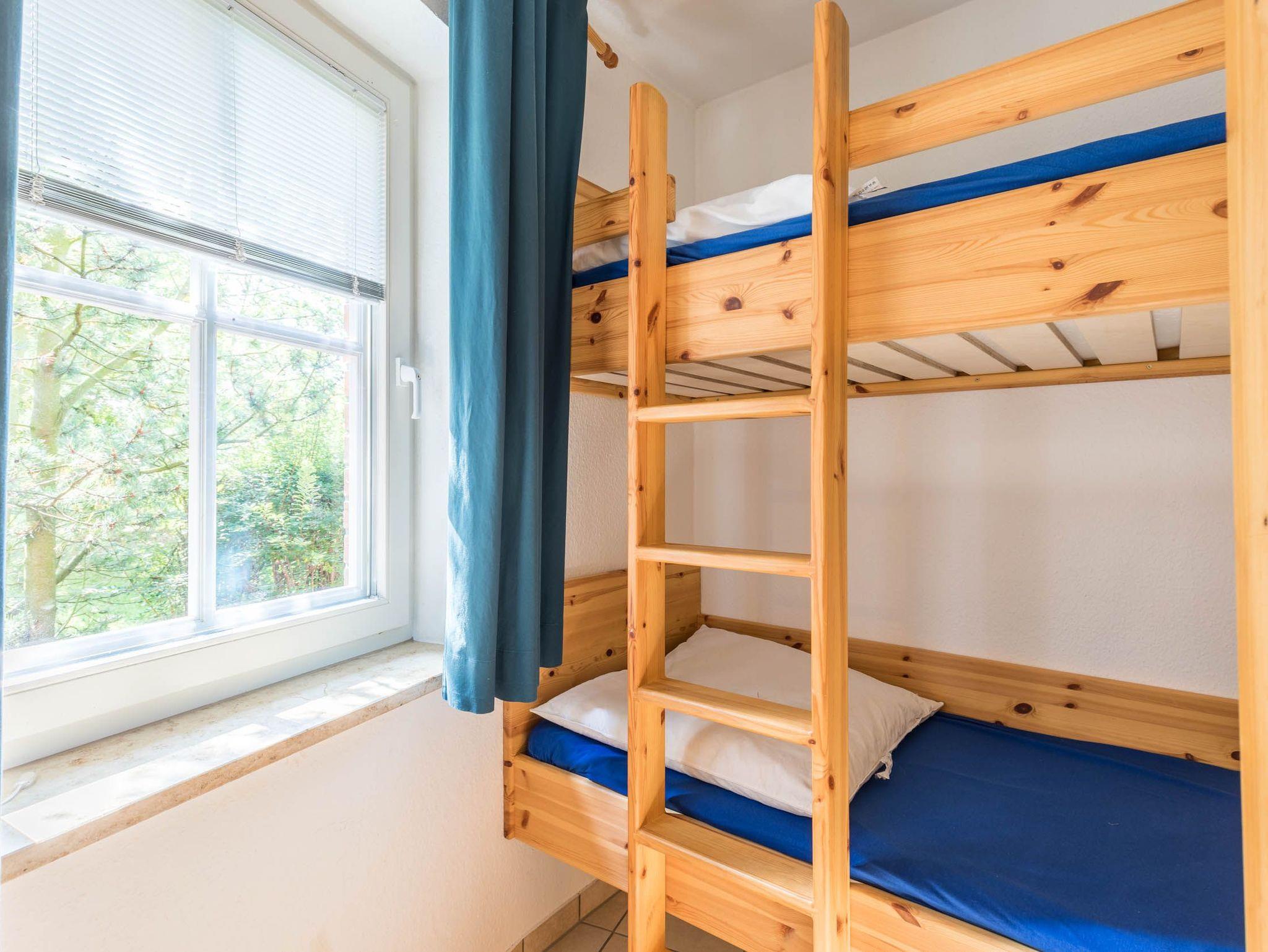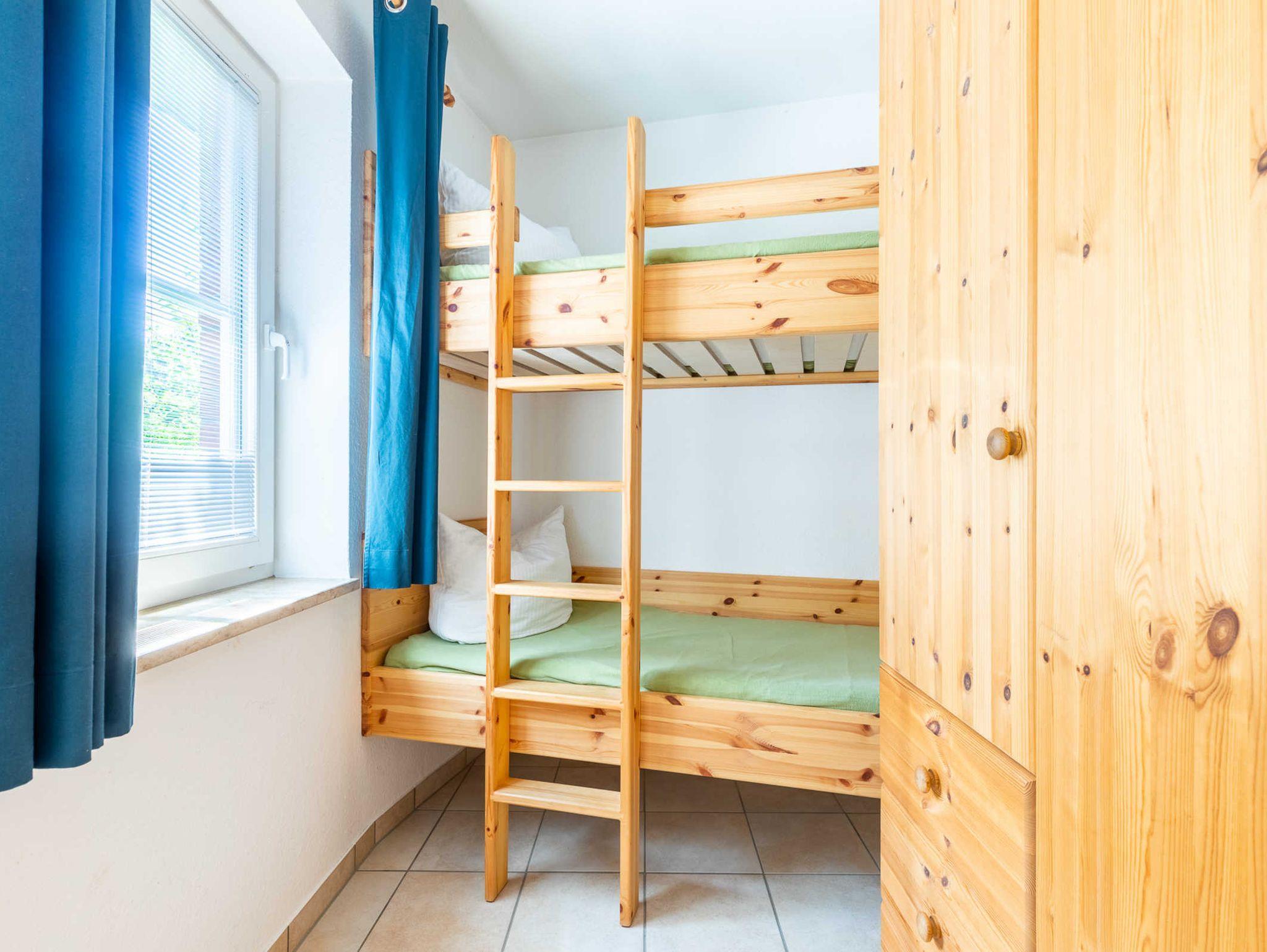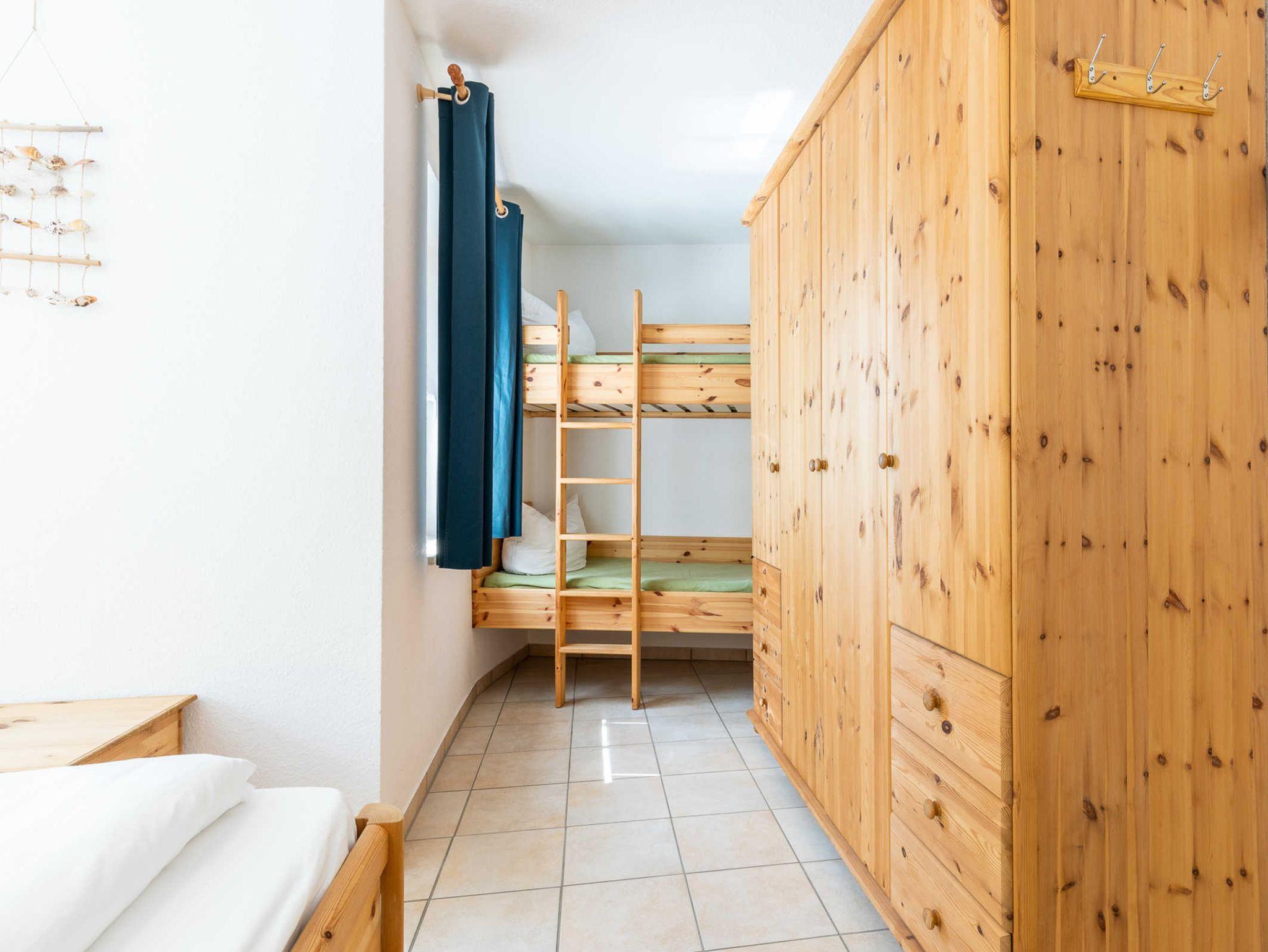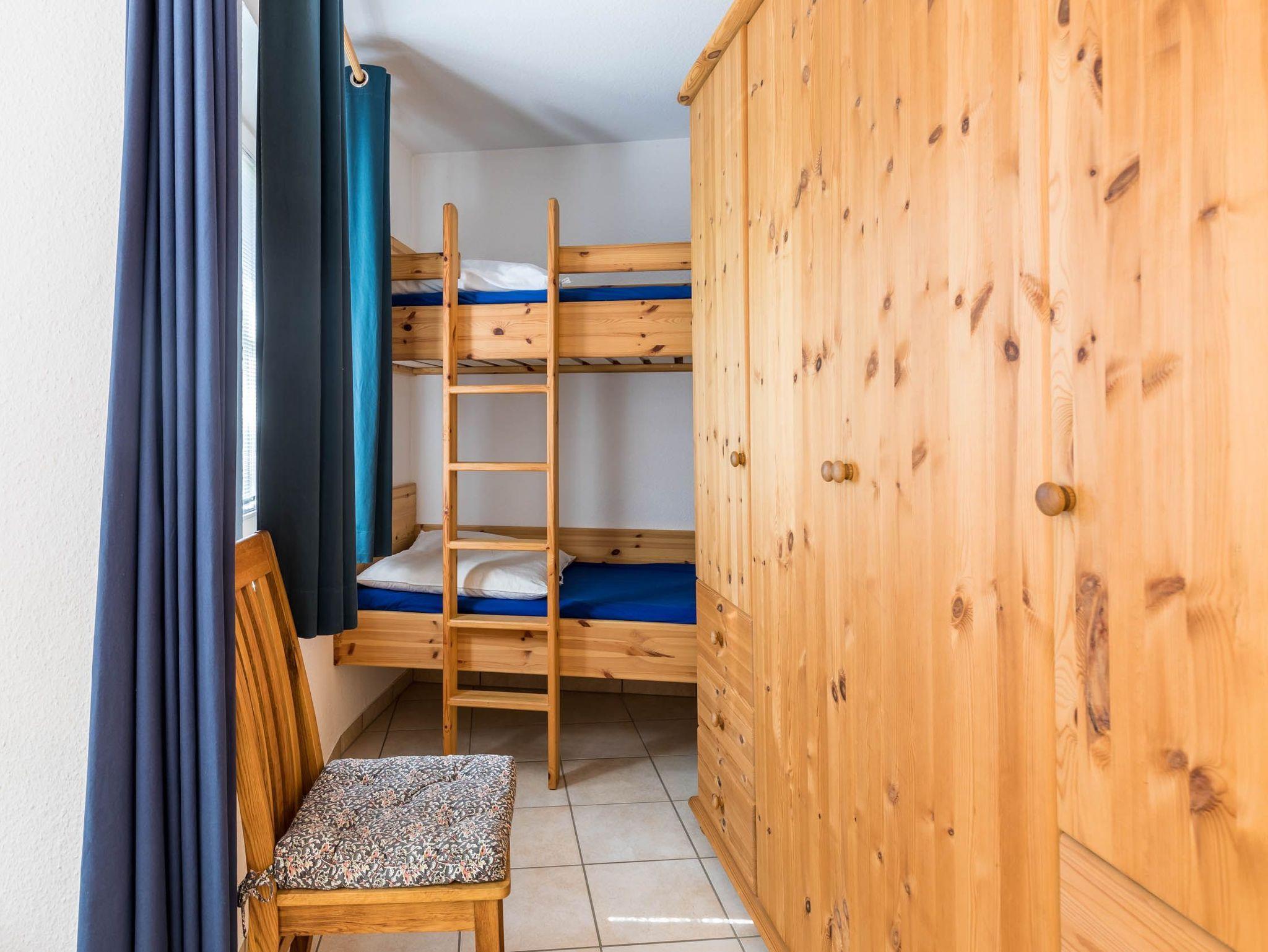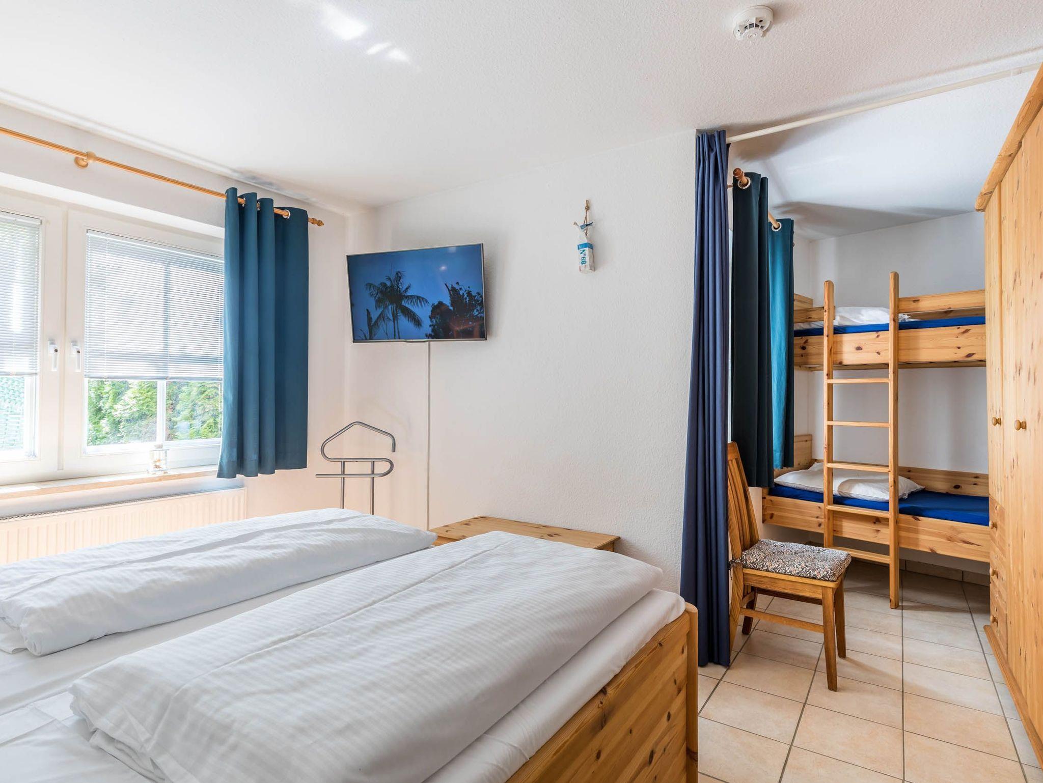 Im Schlafzimmer stehen sowohl ein Doppelbett mit TV als auch ein Etagenbett (aufgrund der Maße nur für Kinder geeignet) zur Verfügung. Ebenso bietet der Kleiderschrank reichlich Ablagemöglichkeiten.