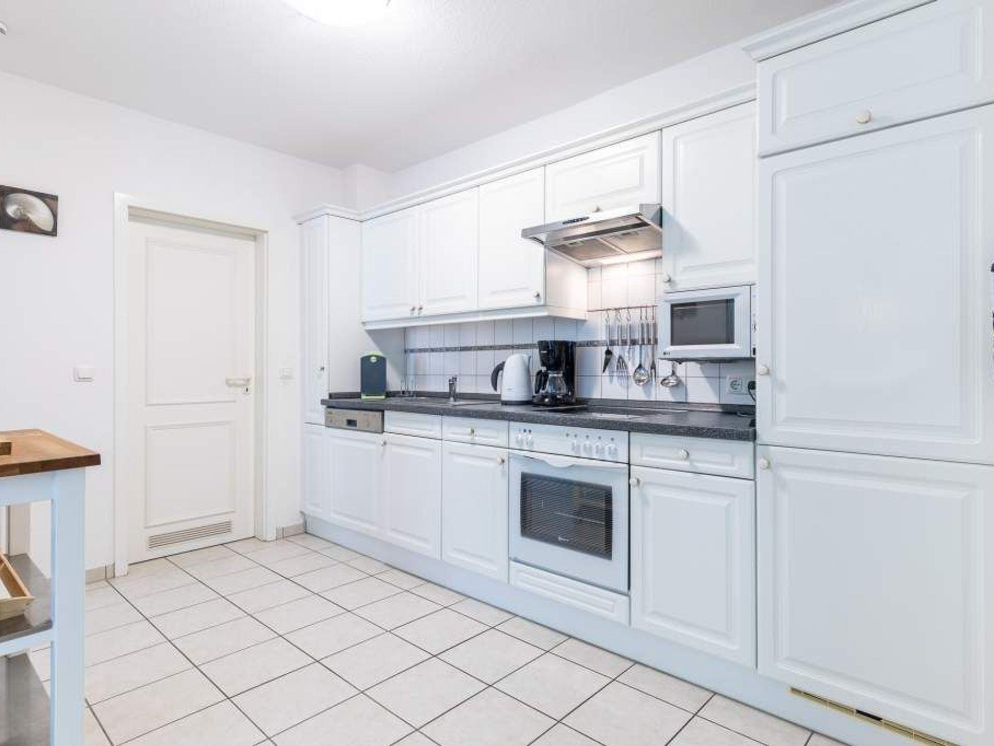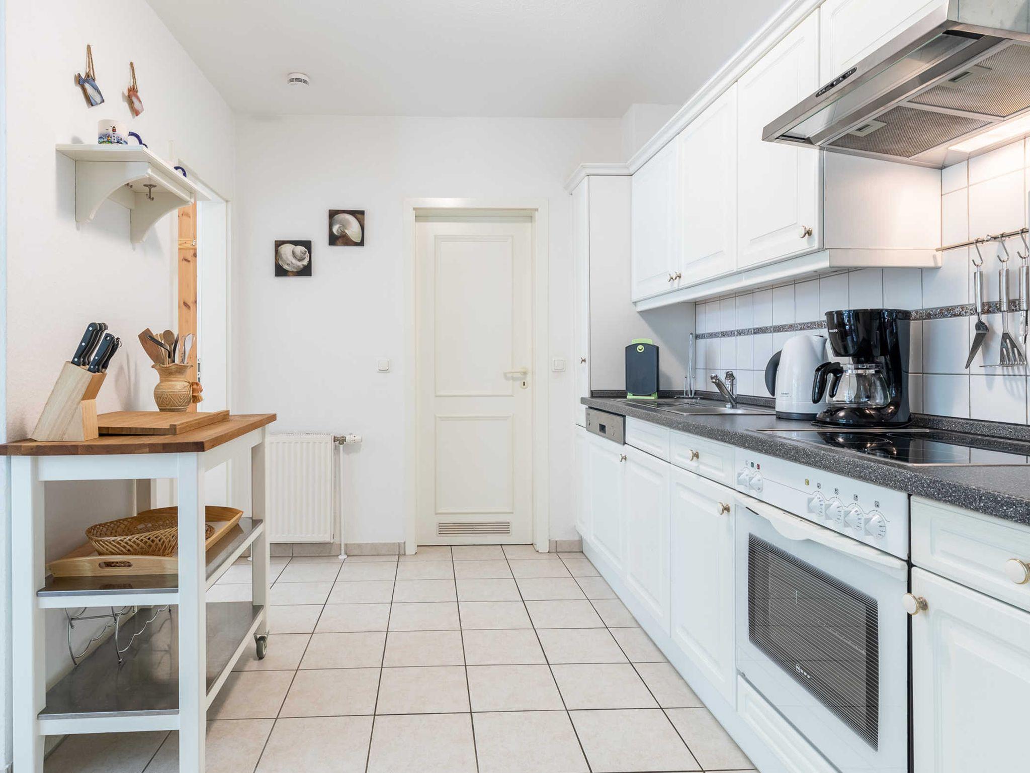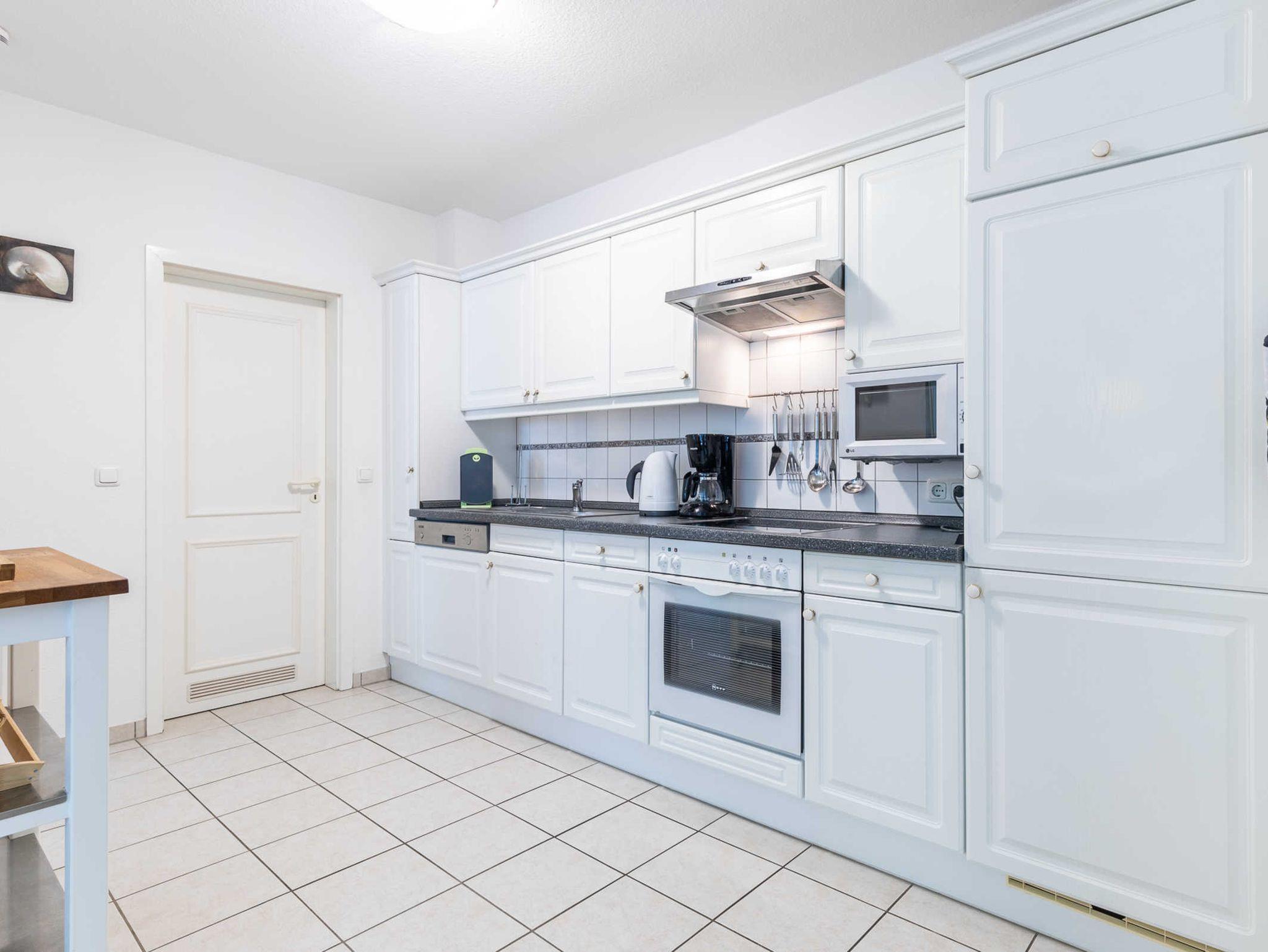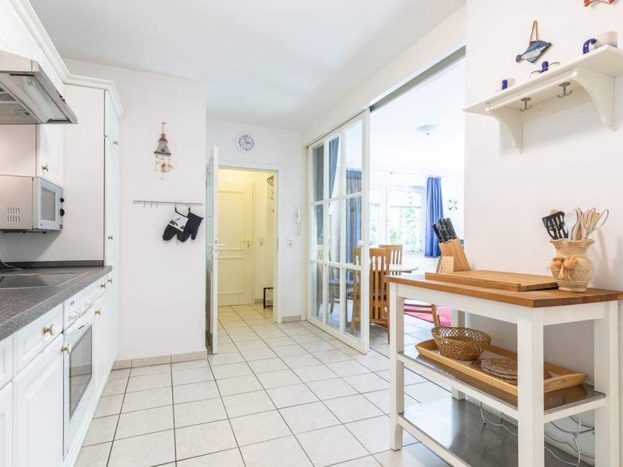 Die Nichtraucherwohnung ist für Familien mit Kindern und für Senioren, die etwas ruhiger im Urlaub wohnen möchten, gut geeignet. Eine große Markise schützt bei Bedarf vor Sonne und Regen. Ein Reisebettchen für unseren kleinsten Urlauber steht zur kostenlosen Nutzung bereit. Machen Sie es sich im Strandkorb auf der 35m² großen Eckterrasse bequem und genießen Sie die herrliche Ostseeluft oder den tollen Ausblick. Zwei Stellplätze hintereinander stehen den Gästen zur Verfügung. Eine Waschmaschine kann im allgemeinen Waschraum im Keller gegen eine geringe Gebühr genutzt werden.