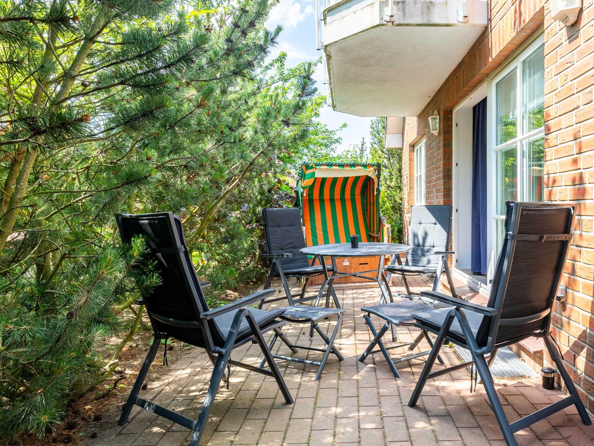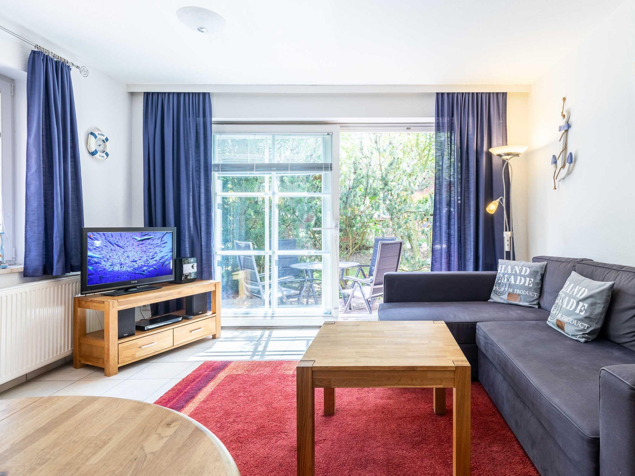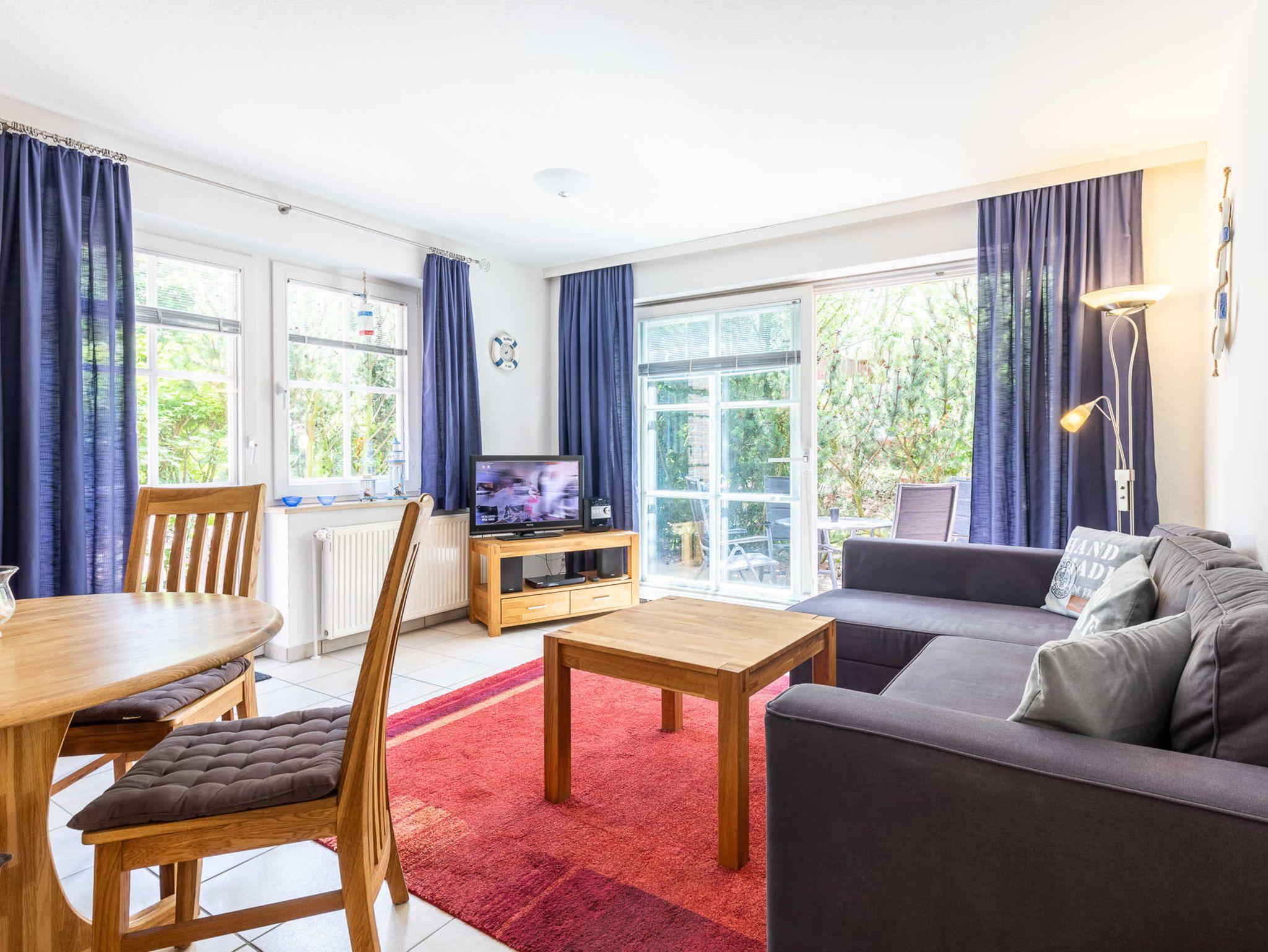 Die Nichtraucherwohnung ist für Familien mit Kindern und für Senioren, die etwas ruhiger im Urlaub wohnen möchten, gut geeignet. Eine große Markise schützt bei Bedarf vor Sonne und Regen. Ein Reisebettchen für unseren kleinsten Urlauber steht zur kostenlosen Nutzung bereit. Machen Sie es sich im Strandkorb auf der 35m² großen Eckterrasse bequem und genießen Sie die herrliche Ostseeluft oder den tollen Ausblick. Zwei Stellplätze hintereinander stehen den Gästen zur Verfügung. Eine Waschmaschine kann im allgemeinen Waschraum im Keller gegen eine geringe Gebühr genutzt werden.