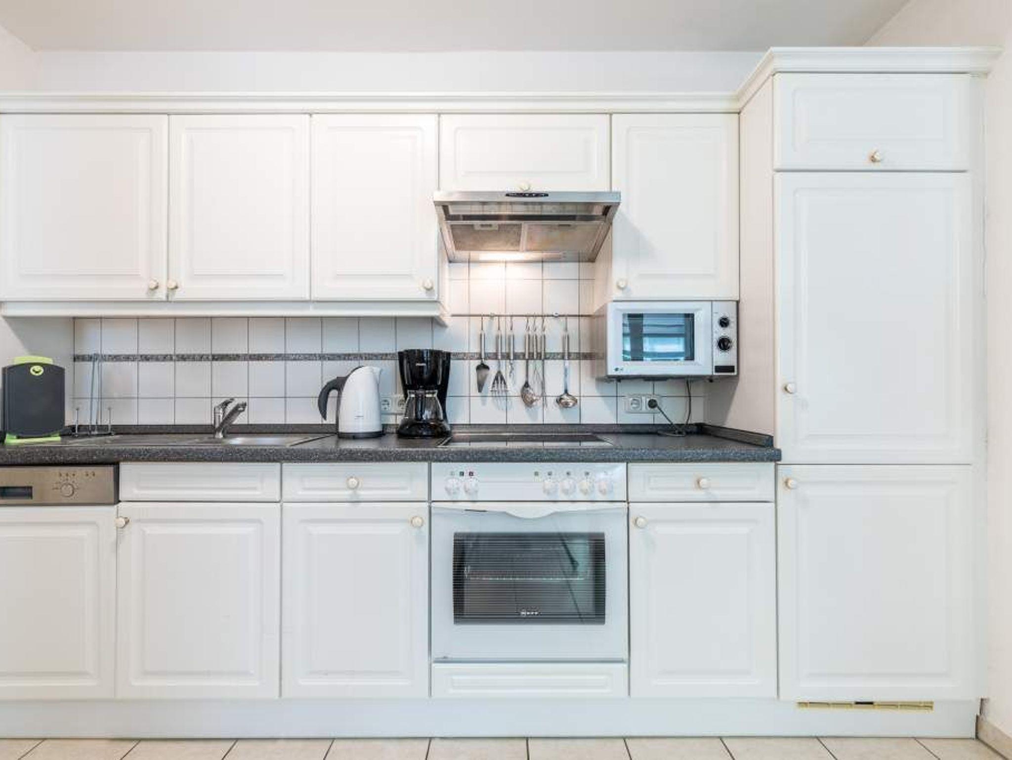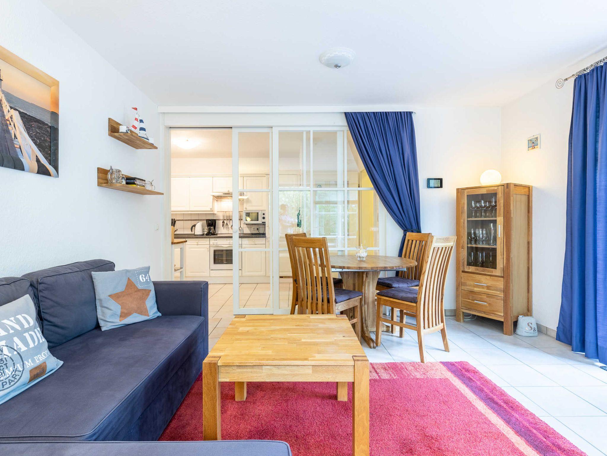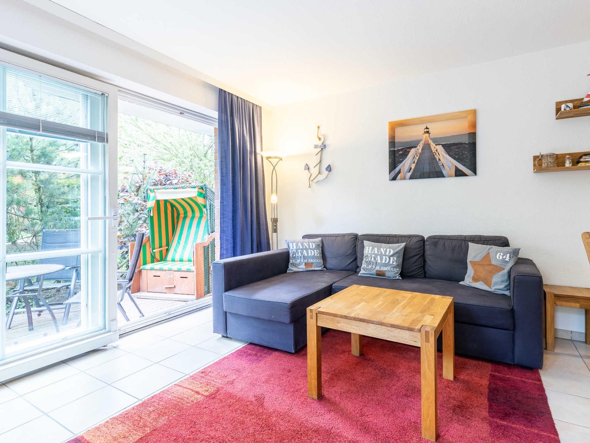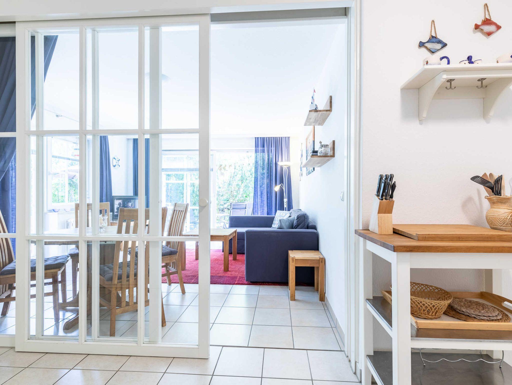 Die Nichtraucherwohnung ist für Familien mit Kindern und für Senioren, die etwas ruhiger im Urlaub wohnen möchten, gut geeignet. Eine große Markise schützt bei Bedarf vor Sonne und Regen. Ein Reisebettchen für unseren kleinsten Urlauber steht zur kostenlosen Nutzung bereit. Machen Sie es sich im Strandkorb auf der 35m² großen Eckterrasse bequem und genießen Sie die herrliche Ostseeluft oder den tollen Ausblick. Zwei Stellplätze hintereinander stehen den Gästen zur Verfügung. Eine Waschmaschine kann im allgemeinen Waschraum im Keller gegen eine geringe Gebühr genutzt werden.