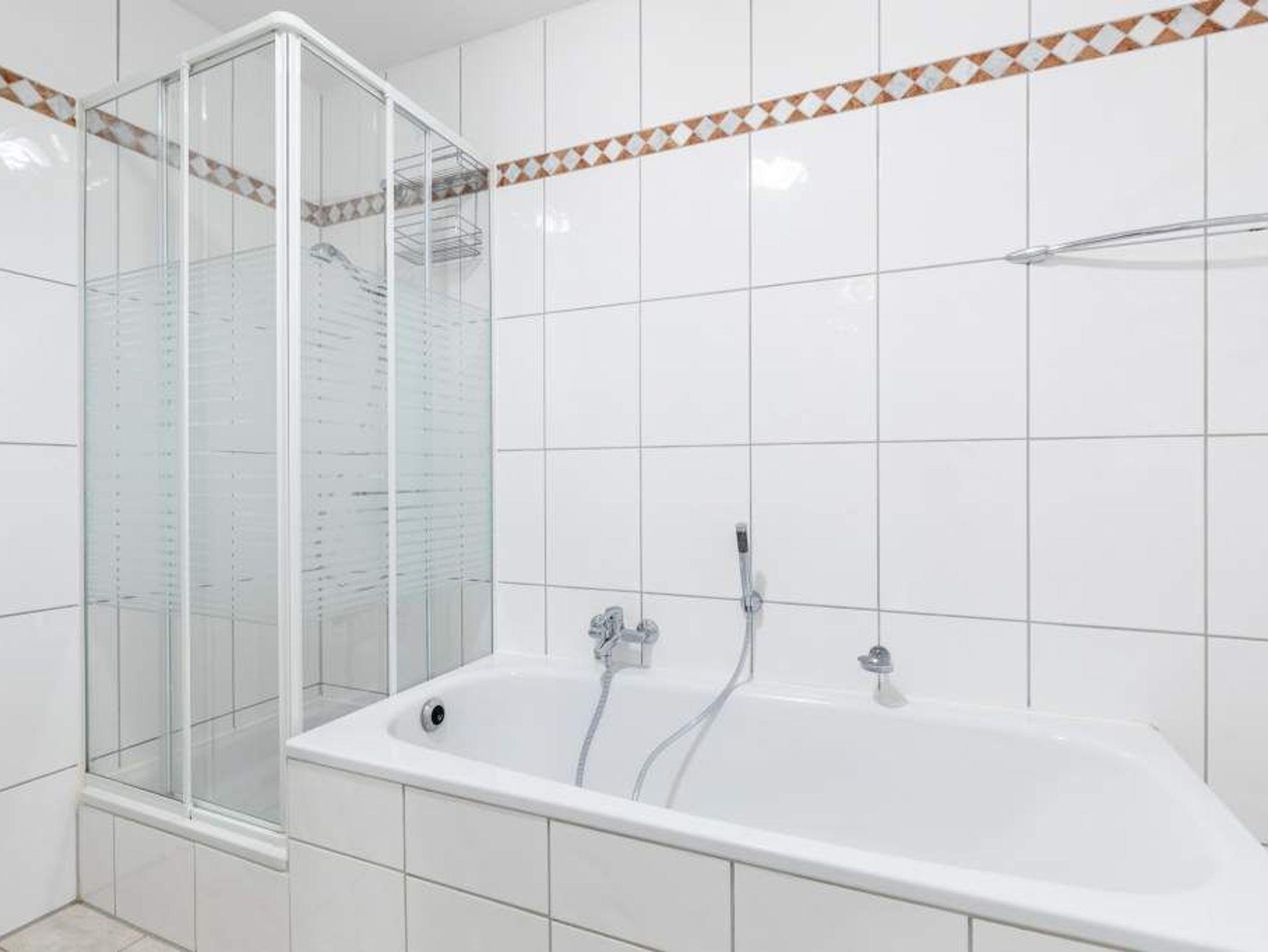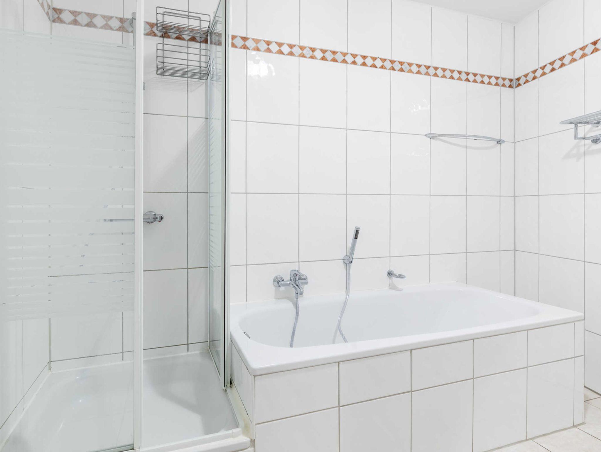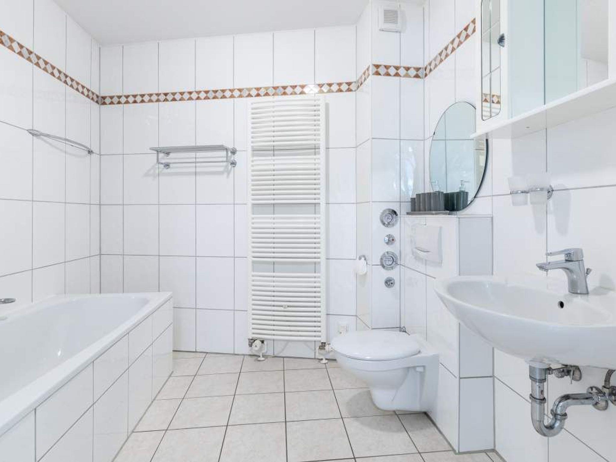 Das Badezimmer bietet eine Badewanne, separater Dusche und WC. Ein großer Handtuchhalter mit integrierter Heizung trocknet schnell Ihre Frotteeware und hält sie bei Bedarf schön warm.