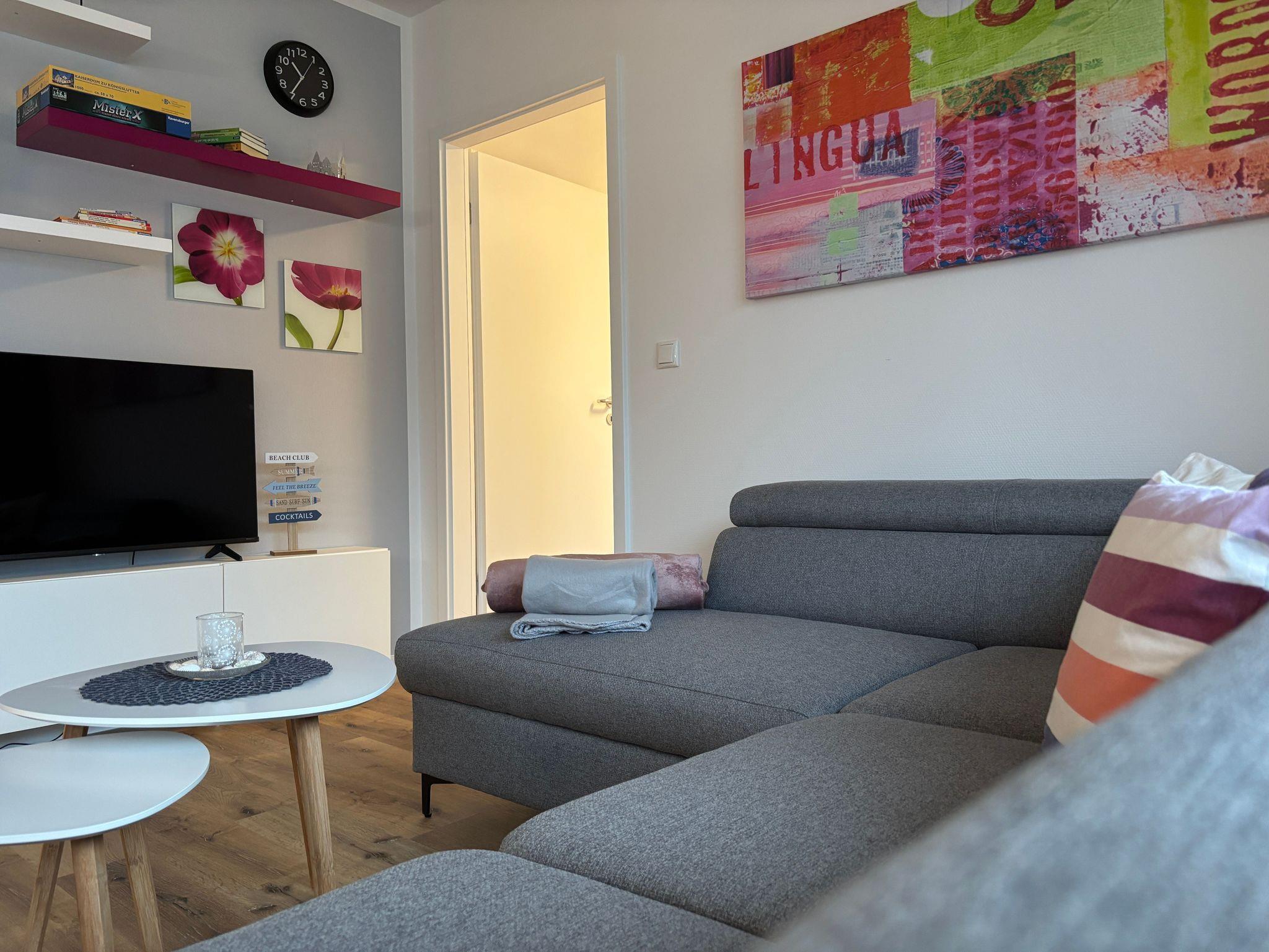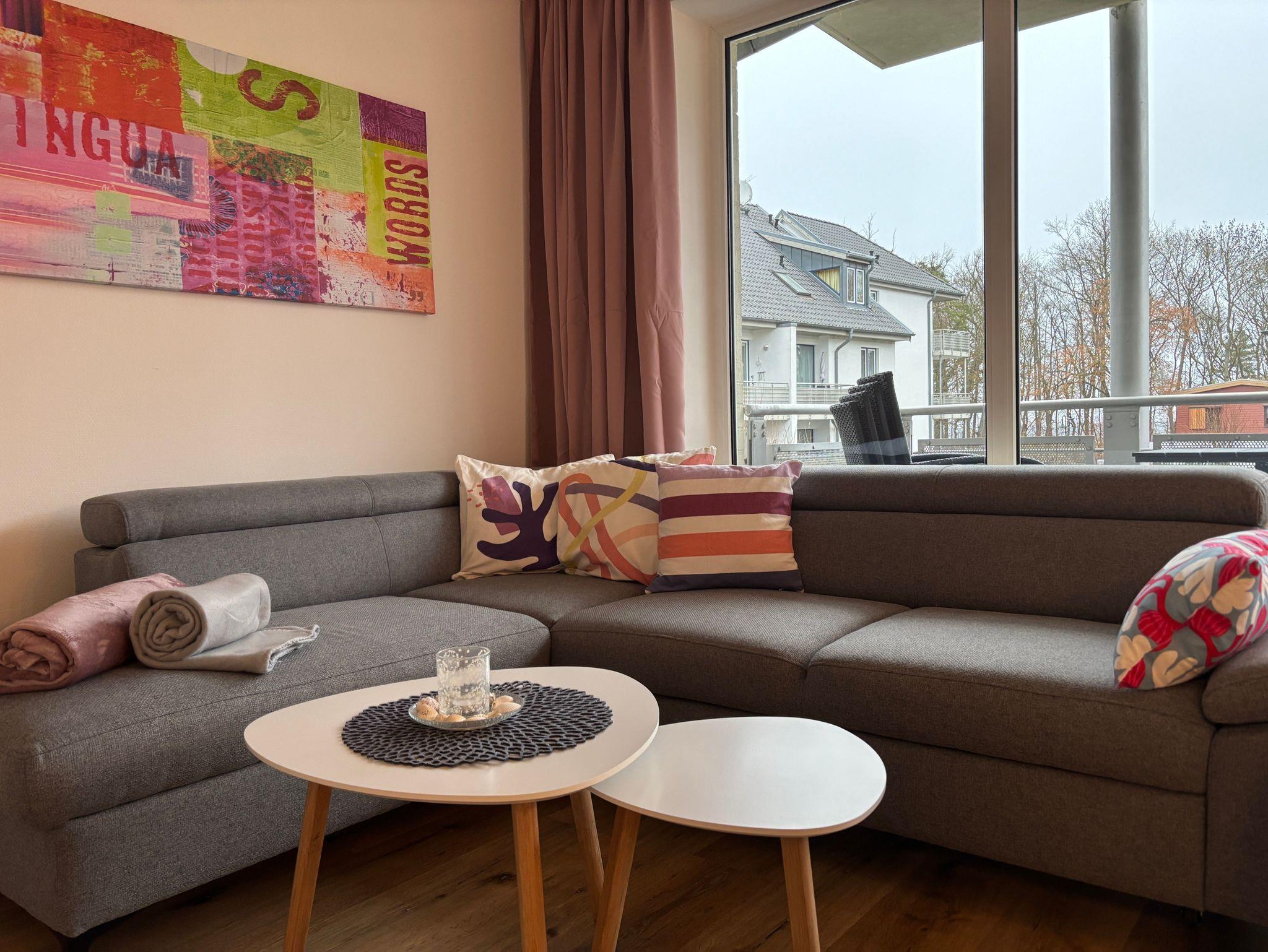 Im Wohnbereich erwartet Sie eine gemütliche Eckcouch mit Schlaffunktion und ein großer Flachbildschirm. Vom Wohnzimmer haben Sie direkten Zugang zum großen Balkon mit Meerblick (im Sommer durch die Bäume der Strandpromenade beeinträchtigt).