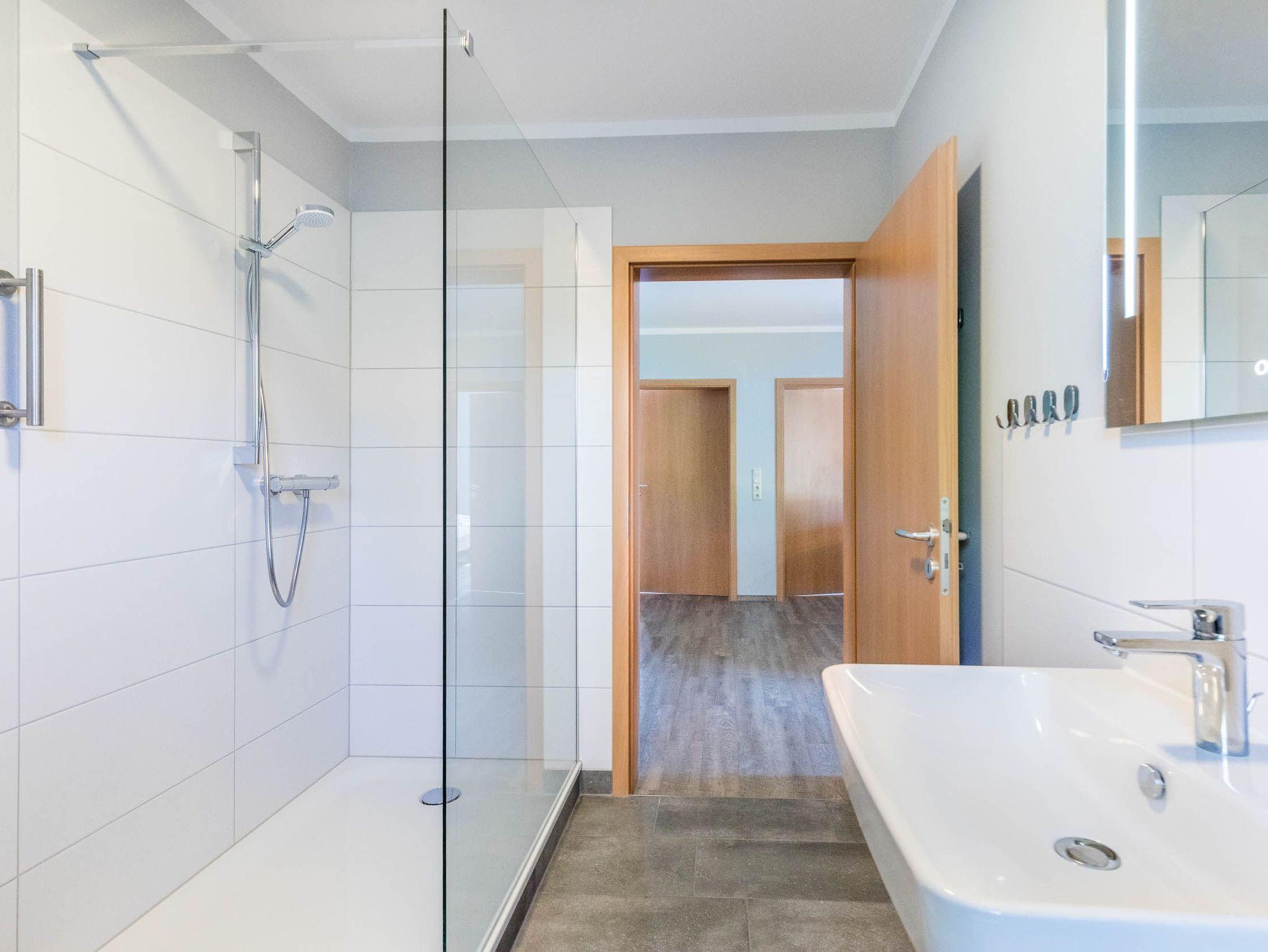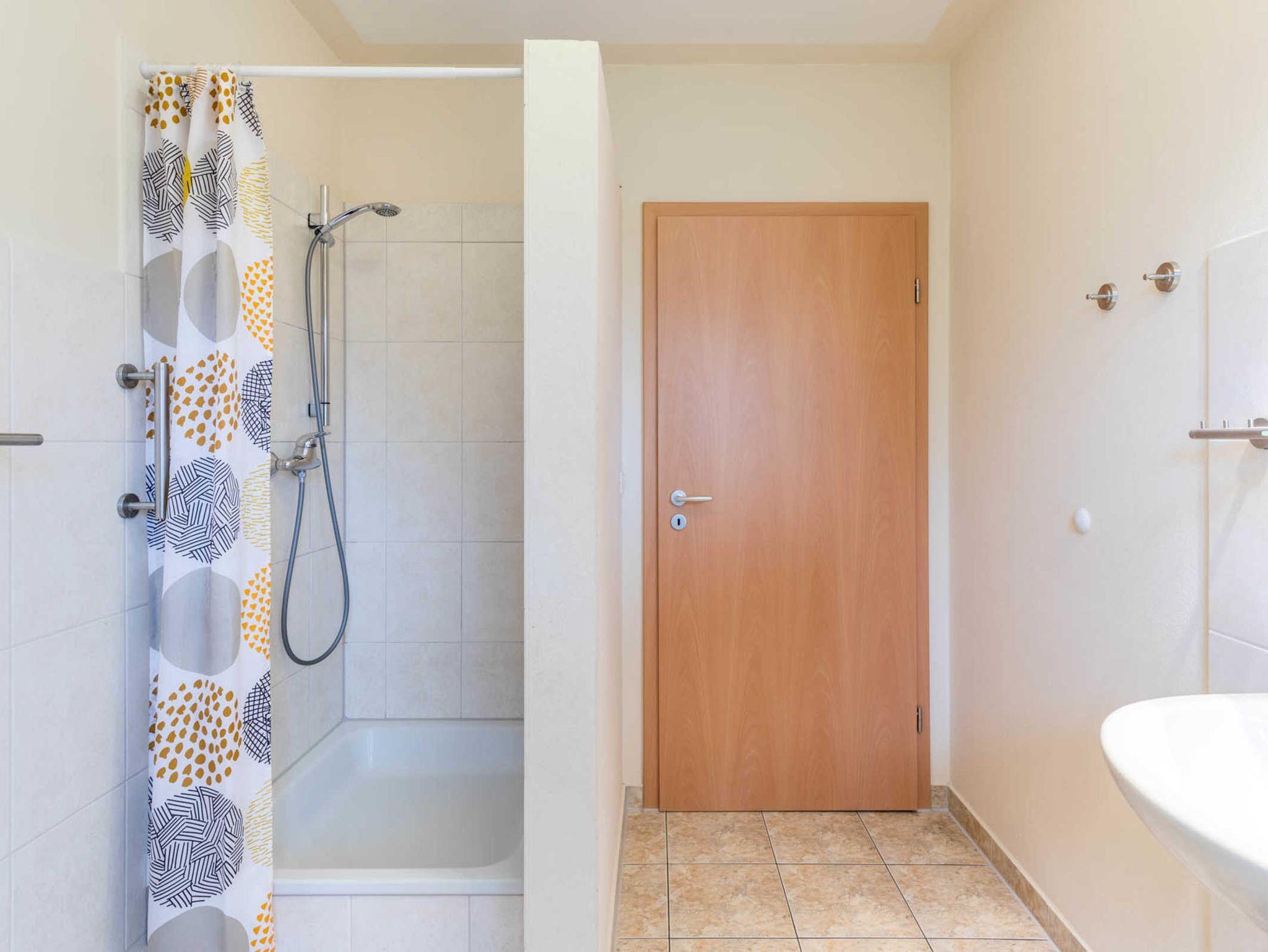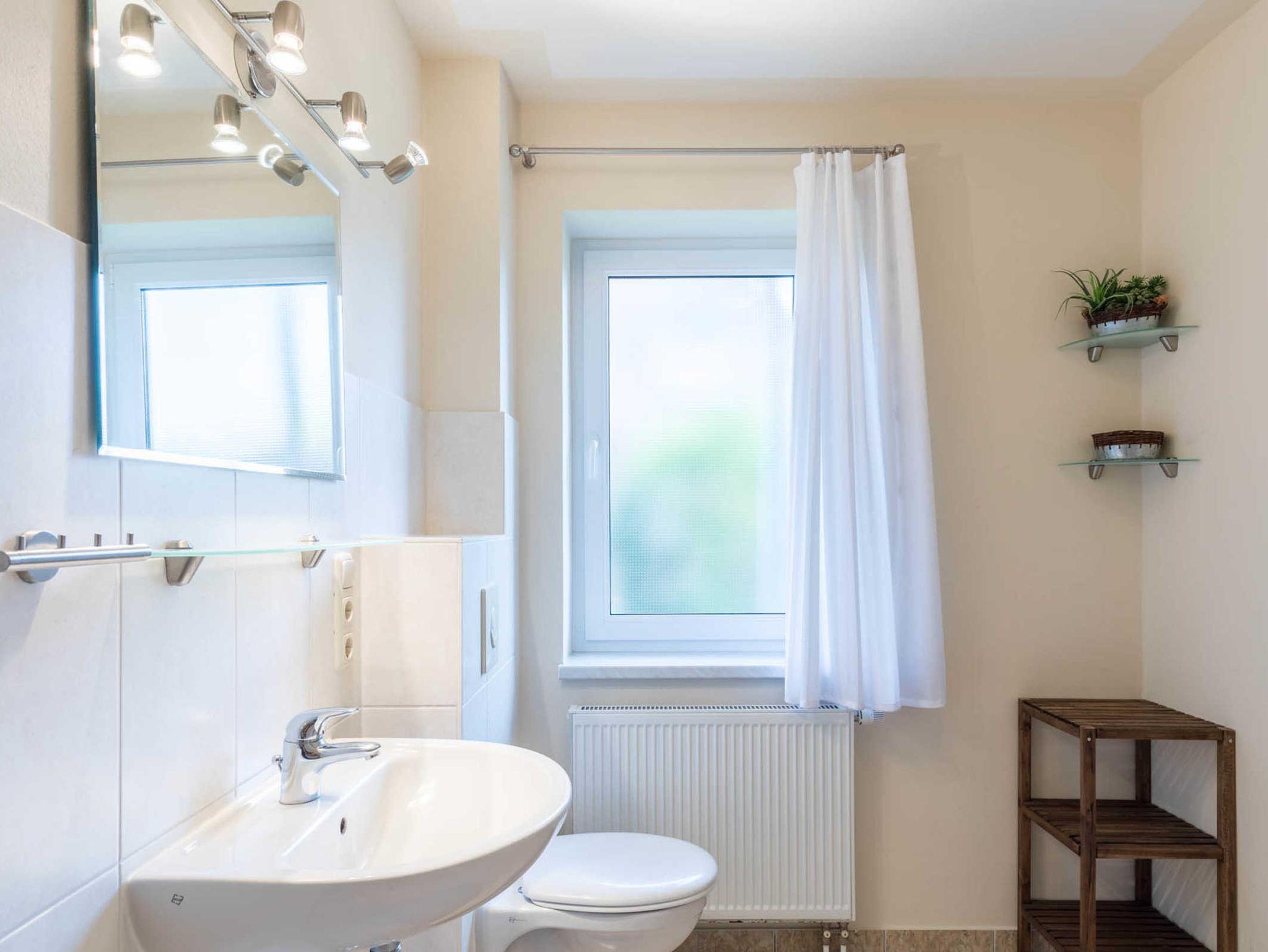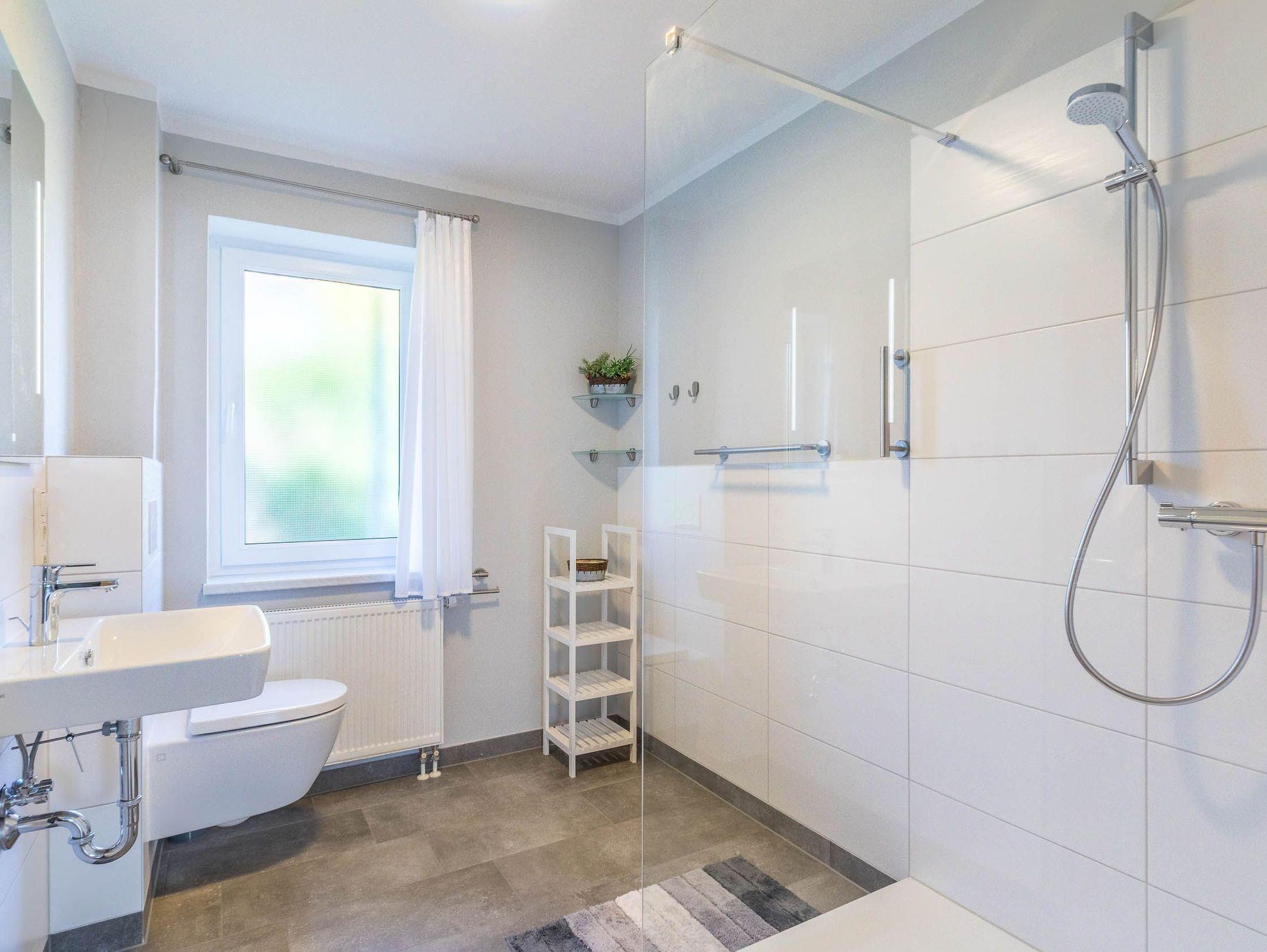 Das moderne Bad ist mit Dusche und WC ausgestattet. Ein Fenster spendet zusätzliches Tageslicht und erleichtert das Lüften nach dem Duschen. Hier gibt es auch einen Duschstuhl.