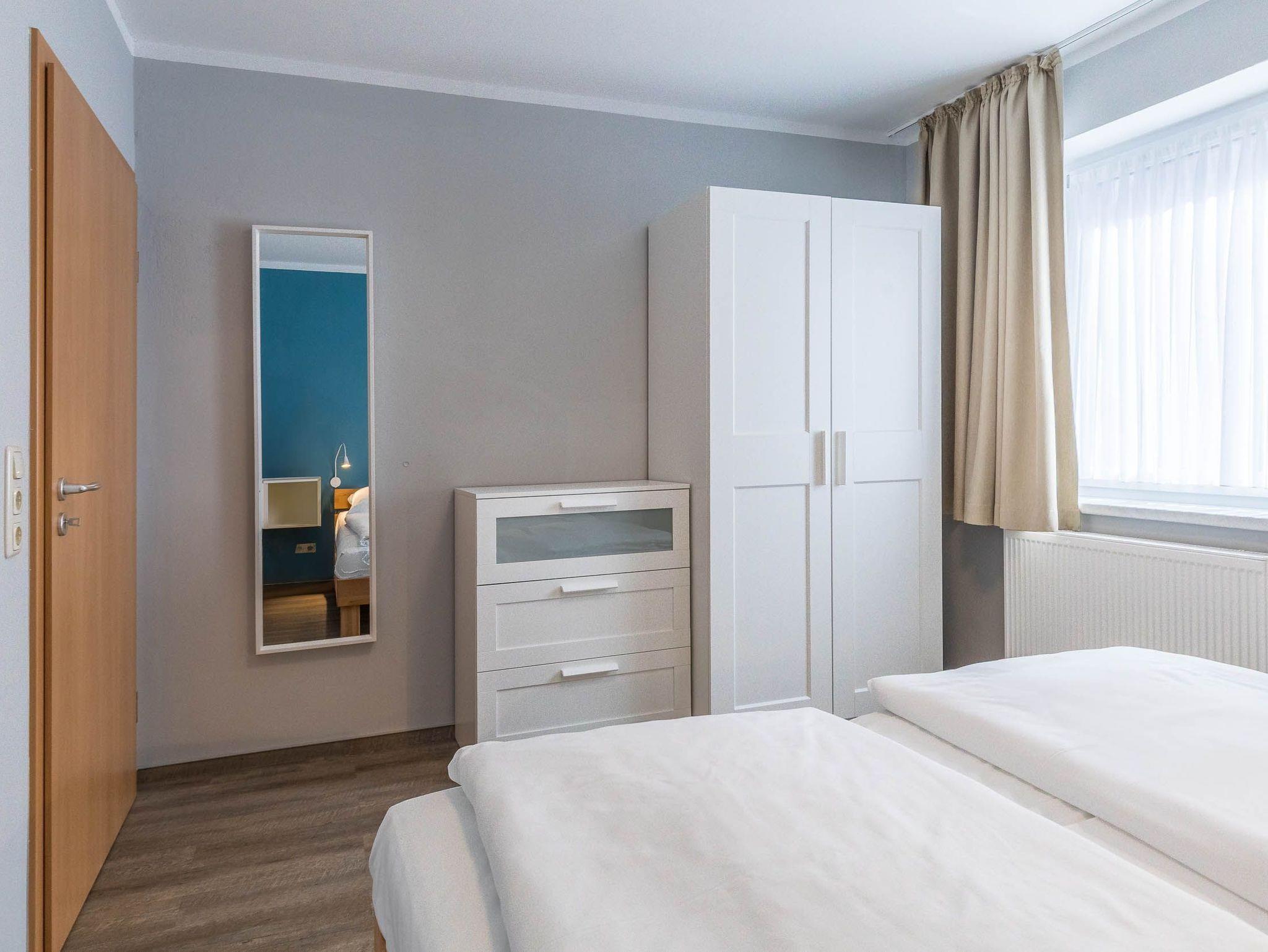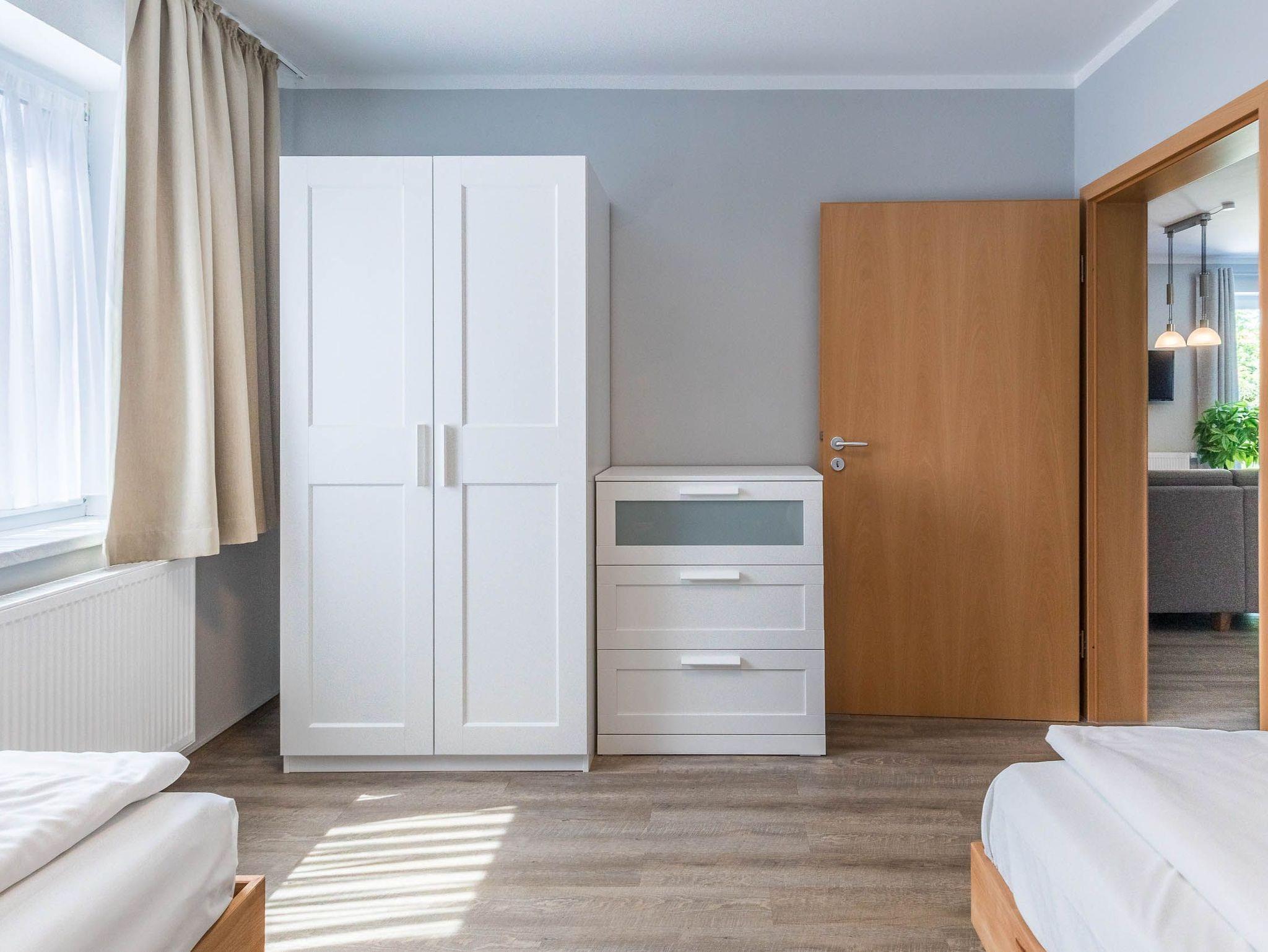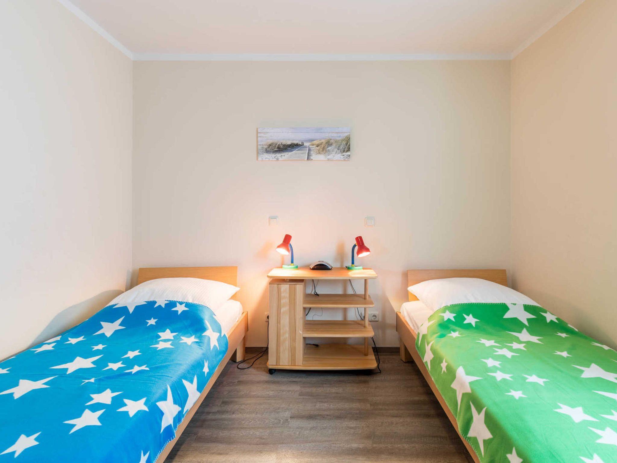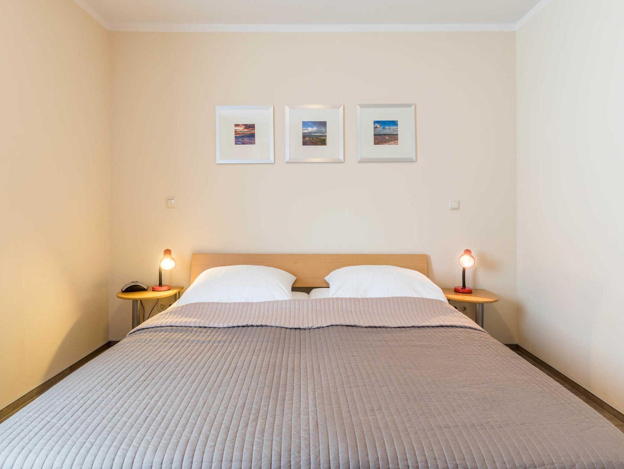 Im Schlafzimmer sorgt ein bequemes Doppelbett für erholsamen Schlaf. Im Gäste-/ Kinderzimmer befinden sich zwei Einzelbetten. Beide Schlafräume verfügen weiterhin über einen Kleiderschrank für Ihre Garderobe. Ein Kinderreisebettchen lässt sich ebenfalls in beiden Zimmern problemlos aufstellen.