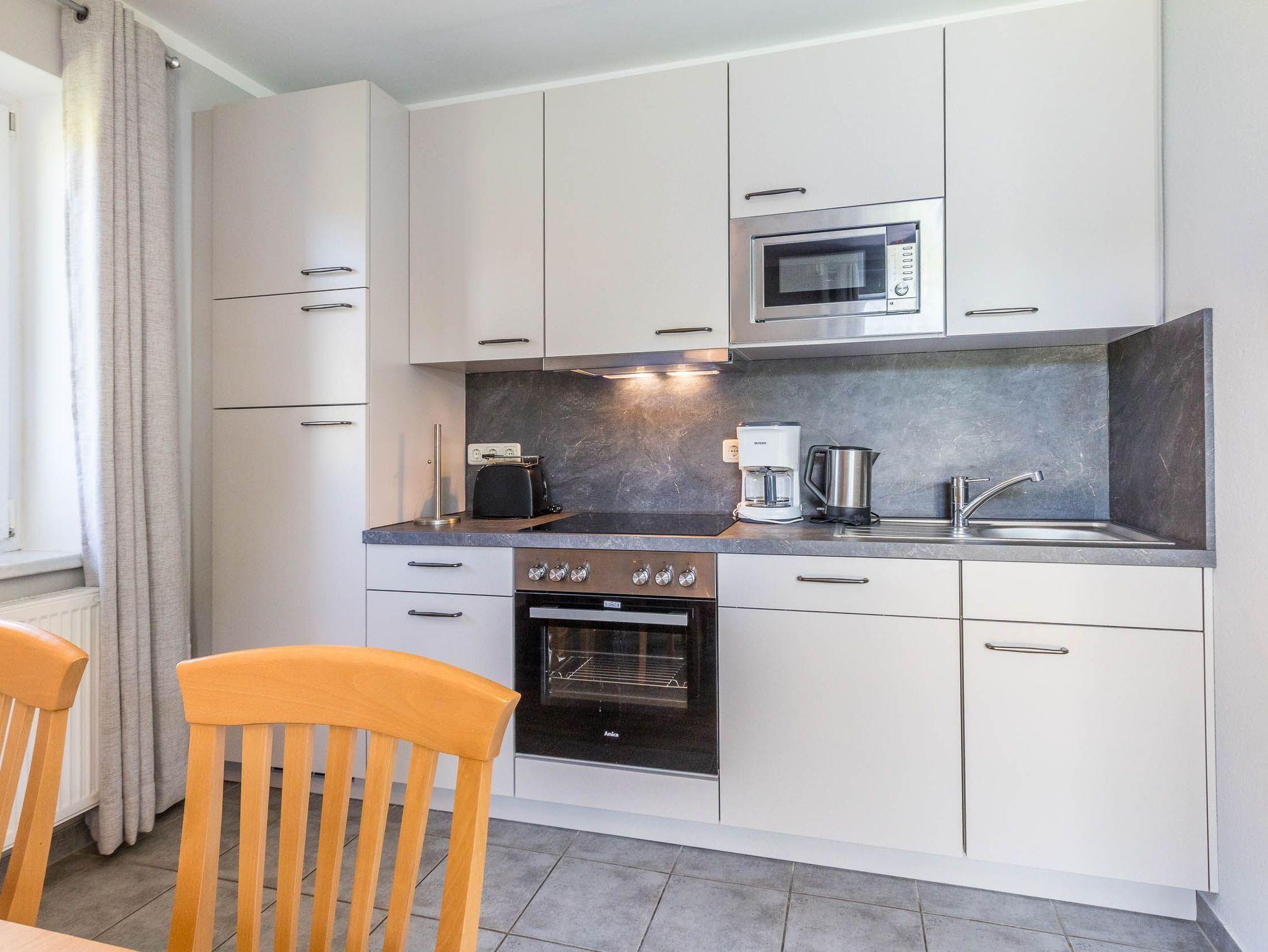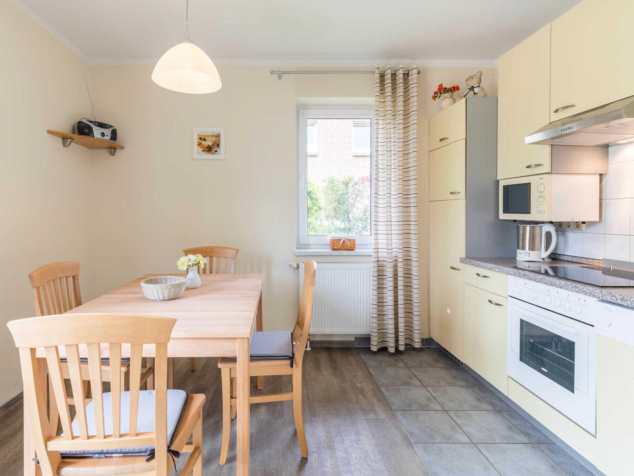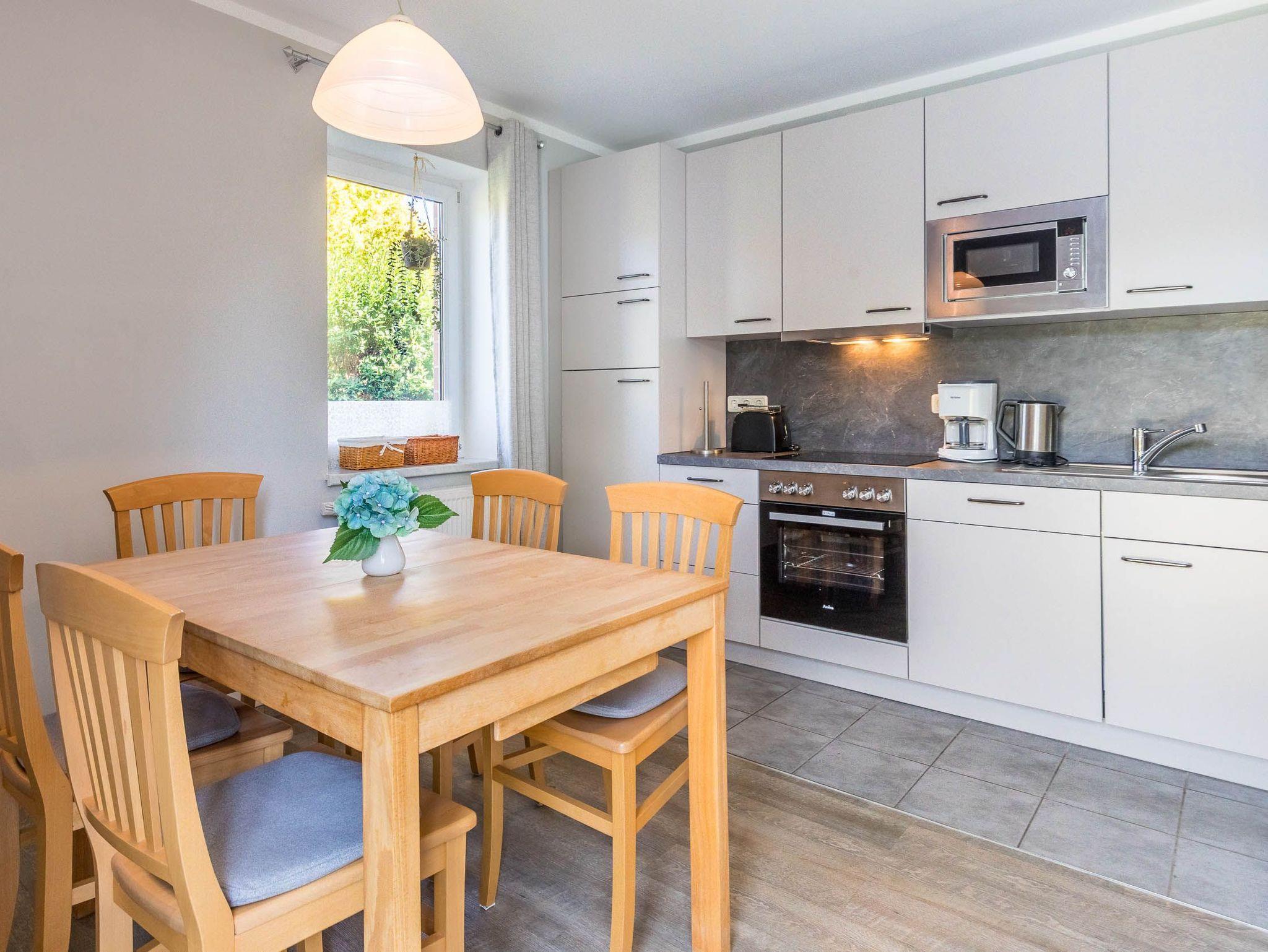 Die offene Küche verfügt über einen Geschirrspüler, Mikrowelle, Kaffeemaschine, Toaster und vielem mehr. Die Essecke lädt zum gemeinsamen Abendessen, Spieleabend o.ä. ein.