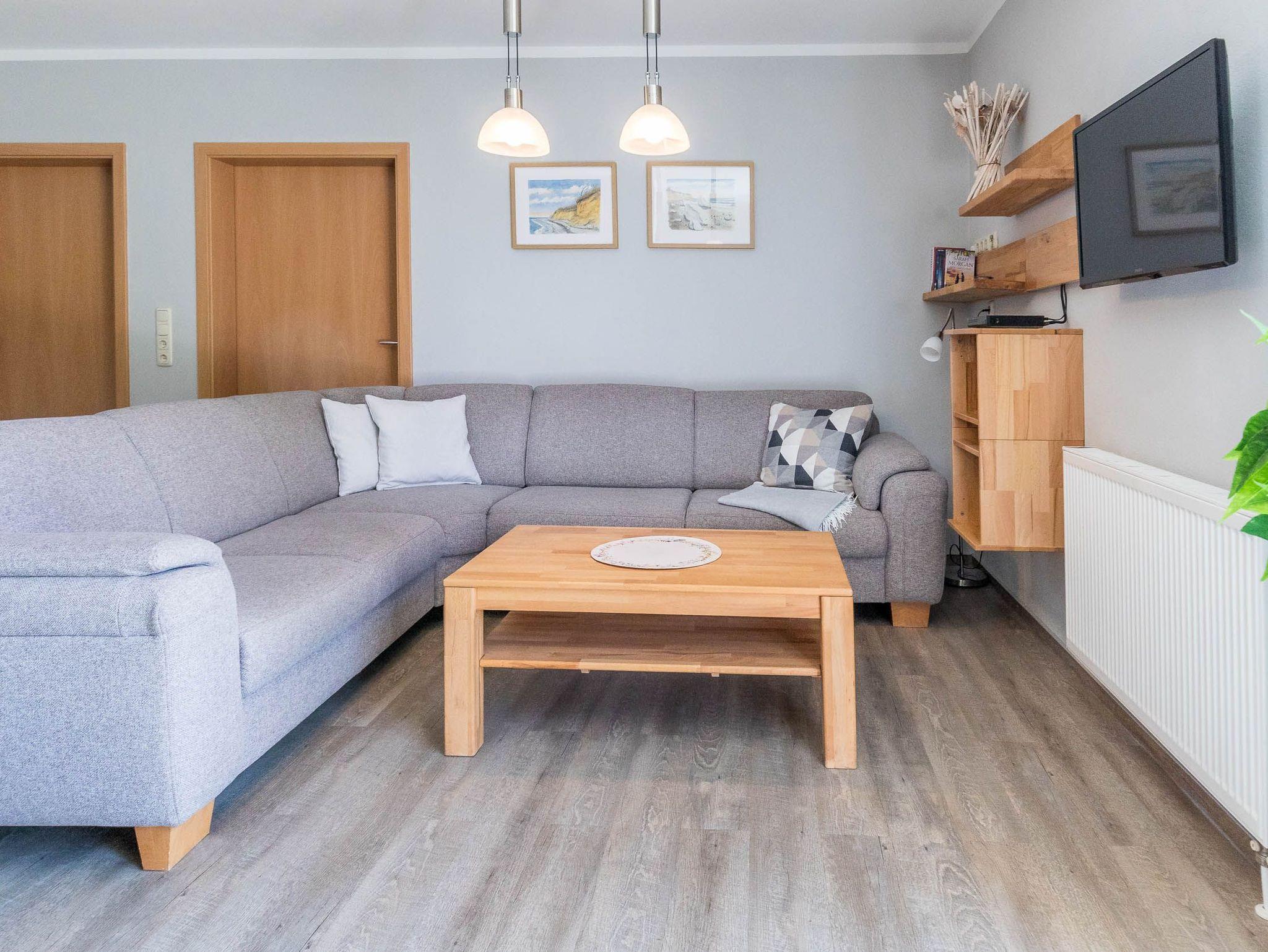 Das gemütliche große Ecksofa lädt zum Entspannen ein. Zur Unterhaltung stehen Ihnen ein moderner Flatscreen-TV und ein Radio zur Verfügung.