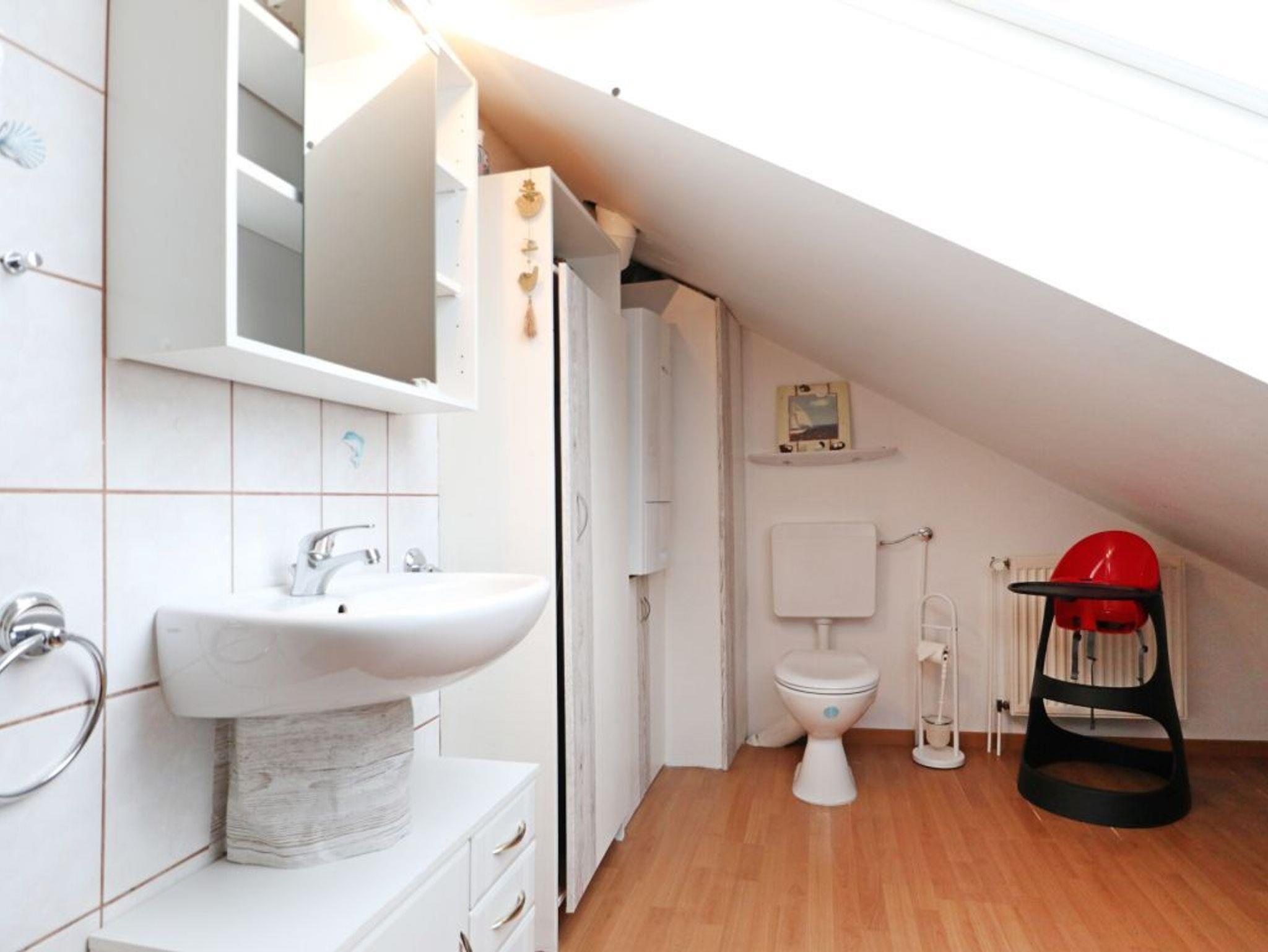 Im Erdgeschoss befinden sich ein Schlafzimmer mit Doppelbett und Kleiderschrank sowie ein Duschbad, Waschtisch, WC und Waschmaschinen Nutzung. Über eine Treppe gelangen Sie ins Obergeschoss mit einem weiteren Schlafzimmer mit Doppelbett, Kleiderschrank, 2. Fernseher. Ein Gäste-WC ist ebenso vorhanden. Familienfreundlich mit Kinderhochstuhl, Kinderbett, Spielzeug, Bollerwagen.