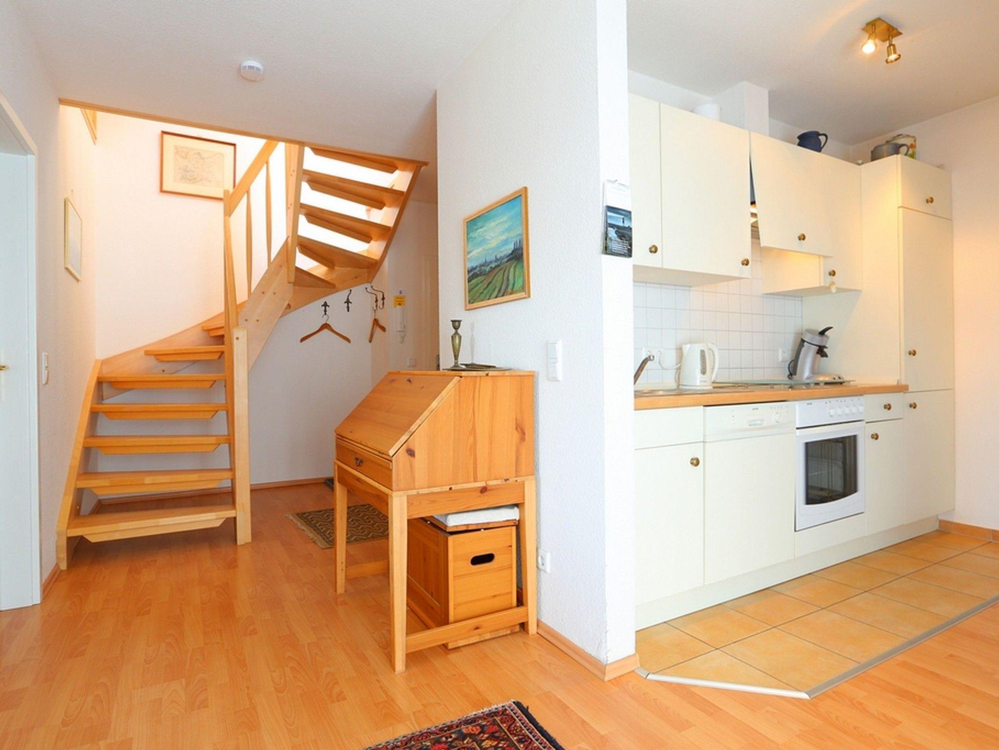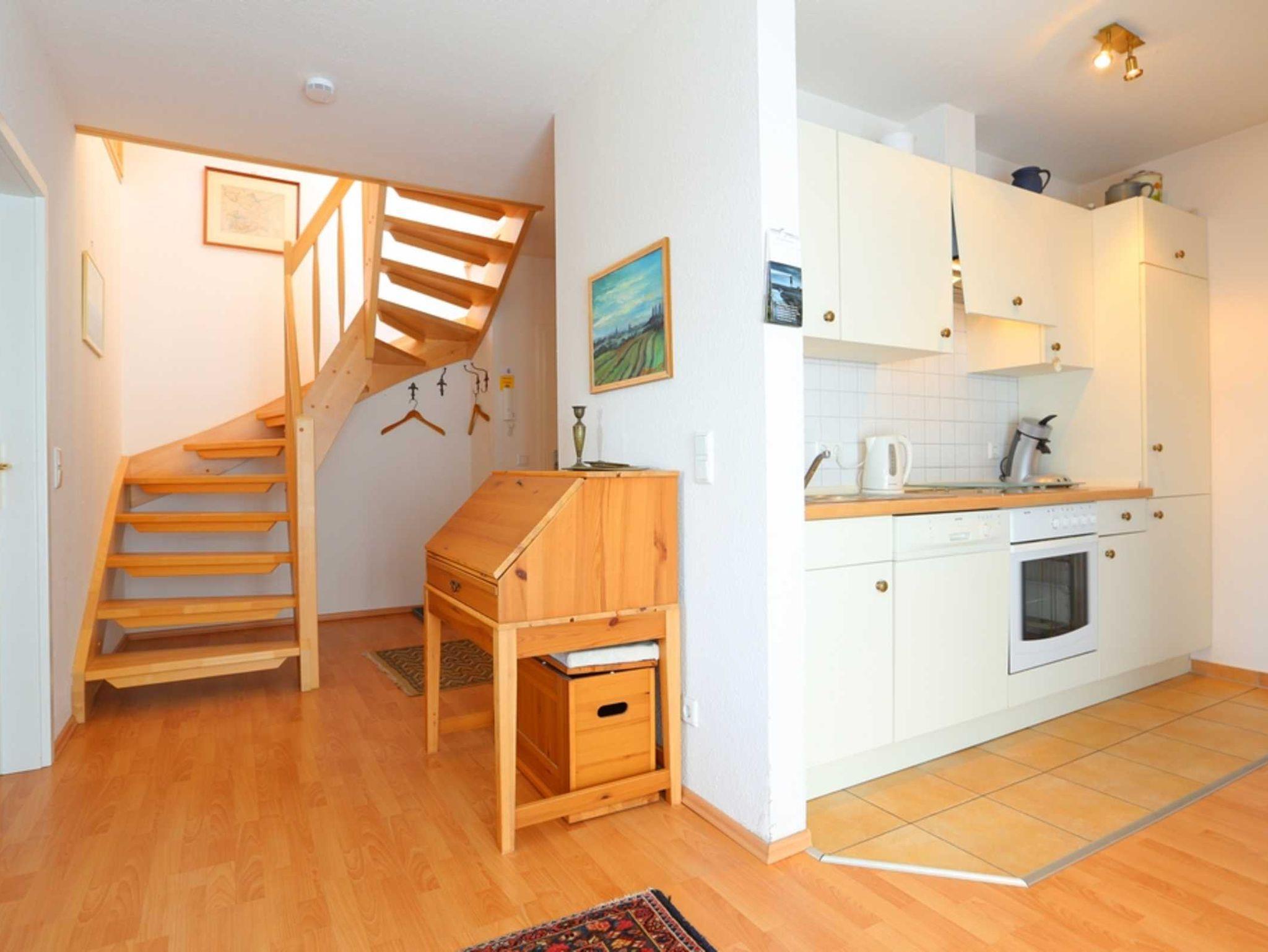 Diese geschmackvoll eingerichtete Wohnung begrüßt Sie in der unteren Wohnebene mit einem Wohnbereich mit maritimen Flair. So finden Sie Sie hier eine farblich abgestimmte Couchgarnitur mit SAT-TV auf der einen Seite des Raumes, während auf der anderen Seite eine sehr gut ausgestattete Wohnküche mit gemütlicher Essecke auf Sie wartet.
