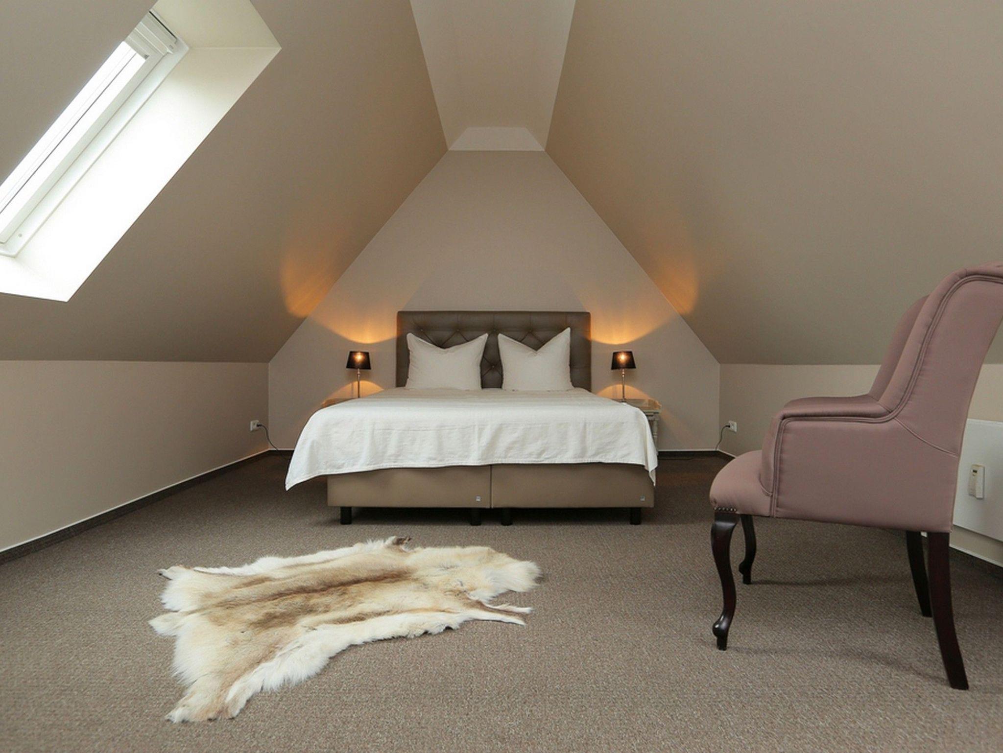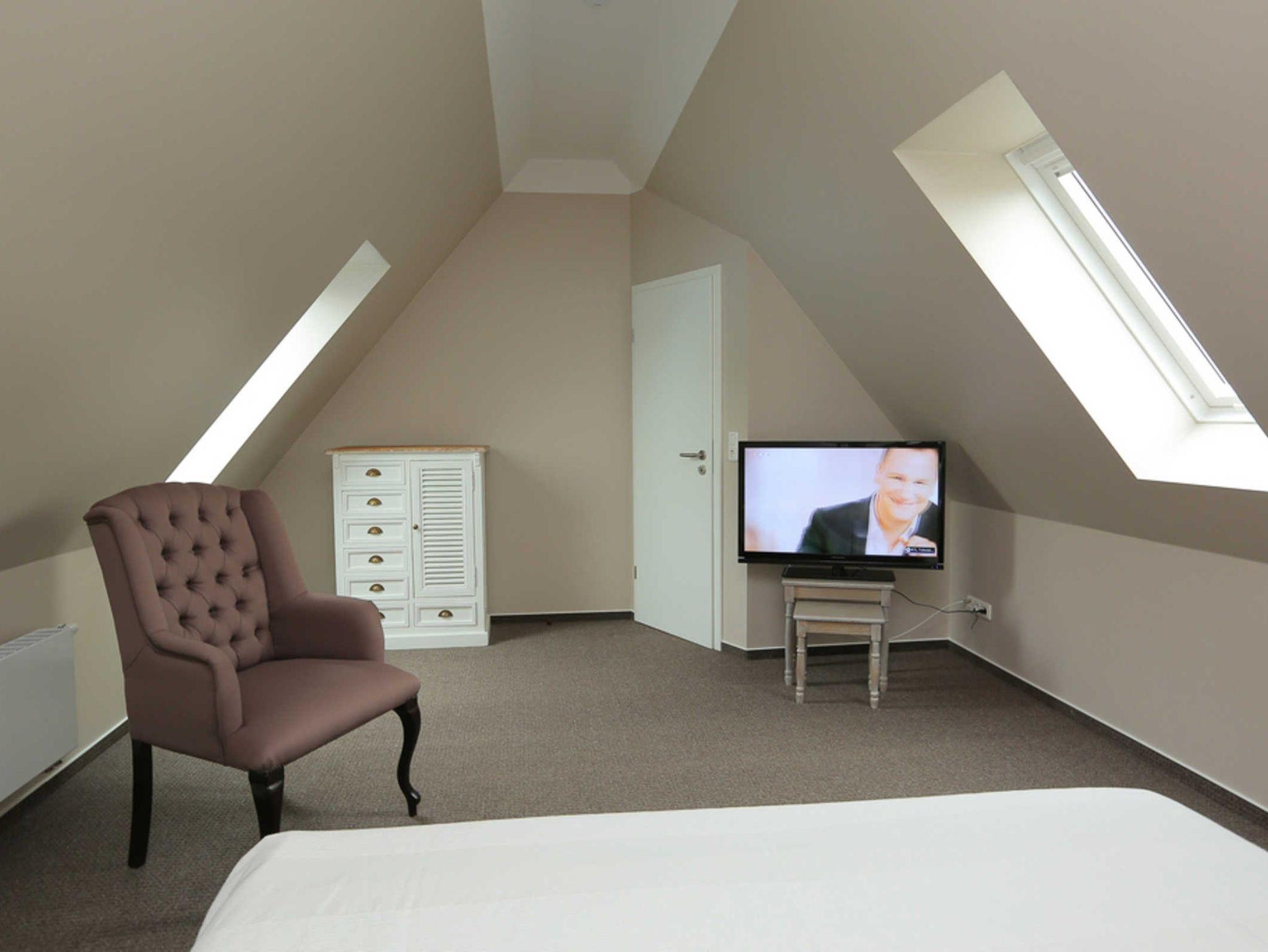 Das zweite Schlafzimmer befindet sich dann in 2. Ebene, im Dachgeschoss. Dieses Schlafzimmer ist ebenfalls, wie das Wohnzimmer, mit TV ausgestattet. Für Ihre Garderobe finden Sie hier eine Kommode. Auch hier sorgt ein bequemes Boxspringbett für wohligen Schlaf.