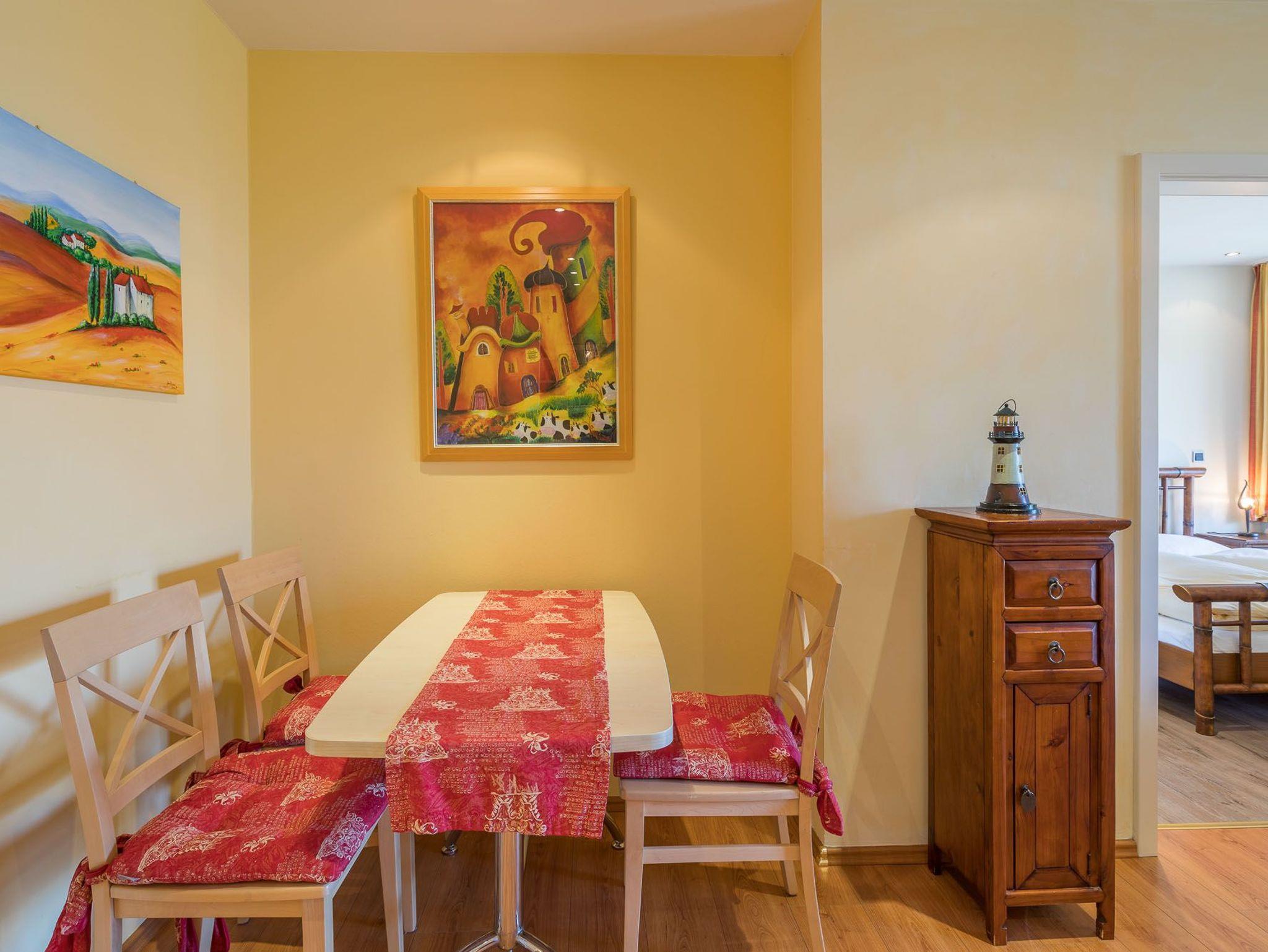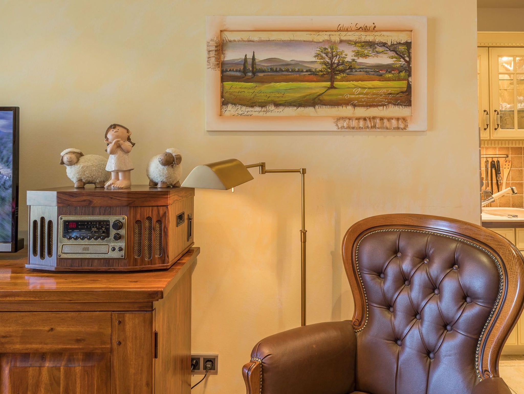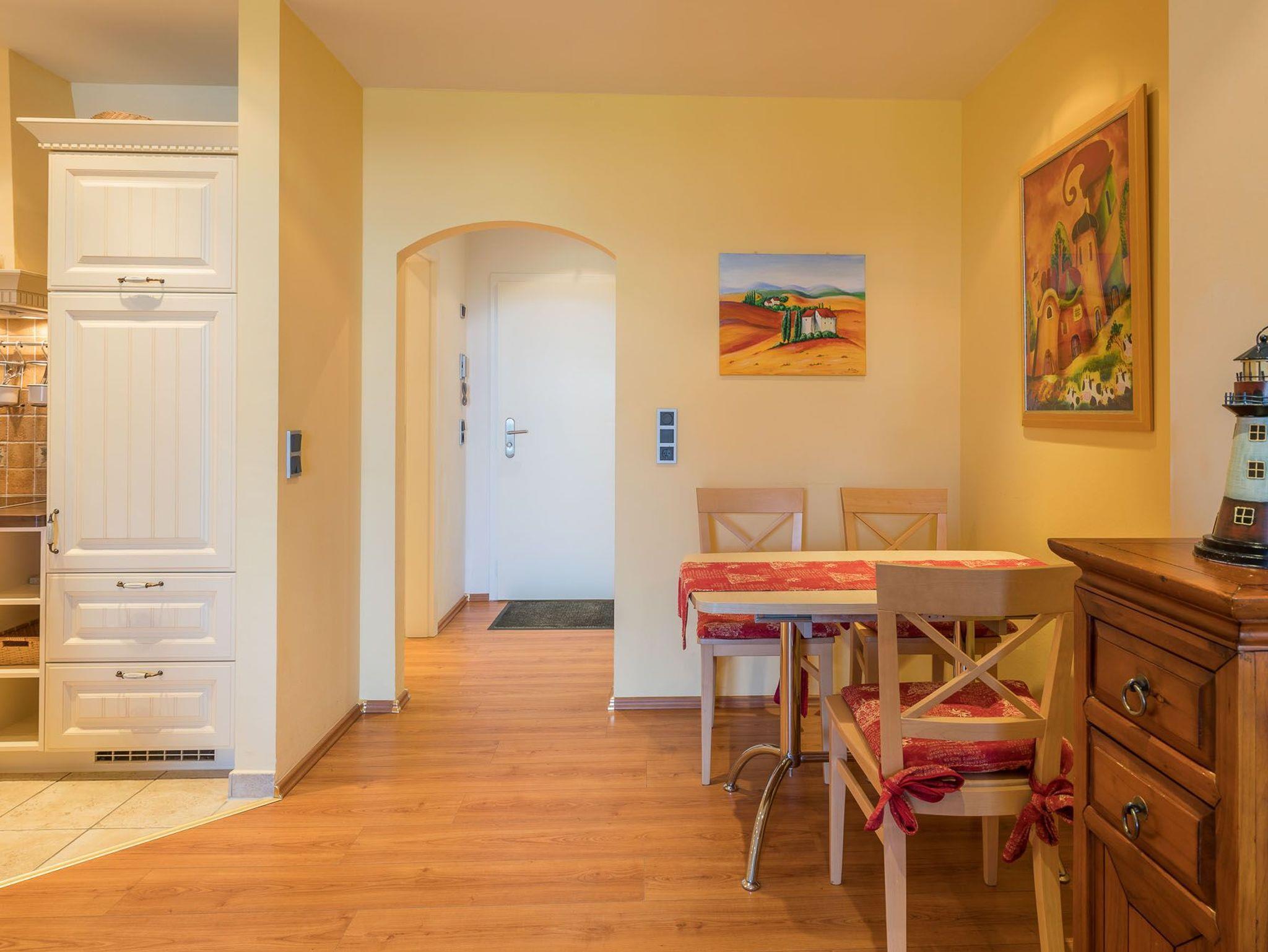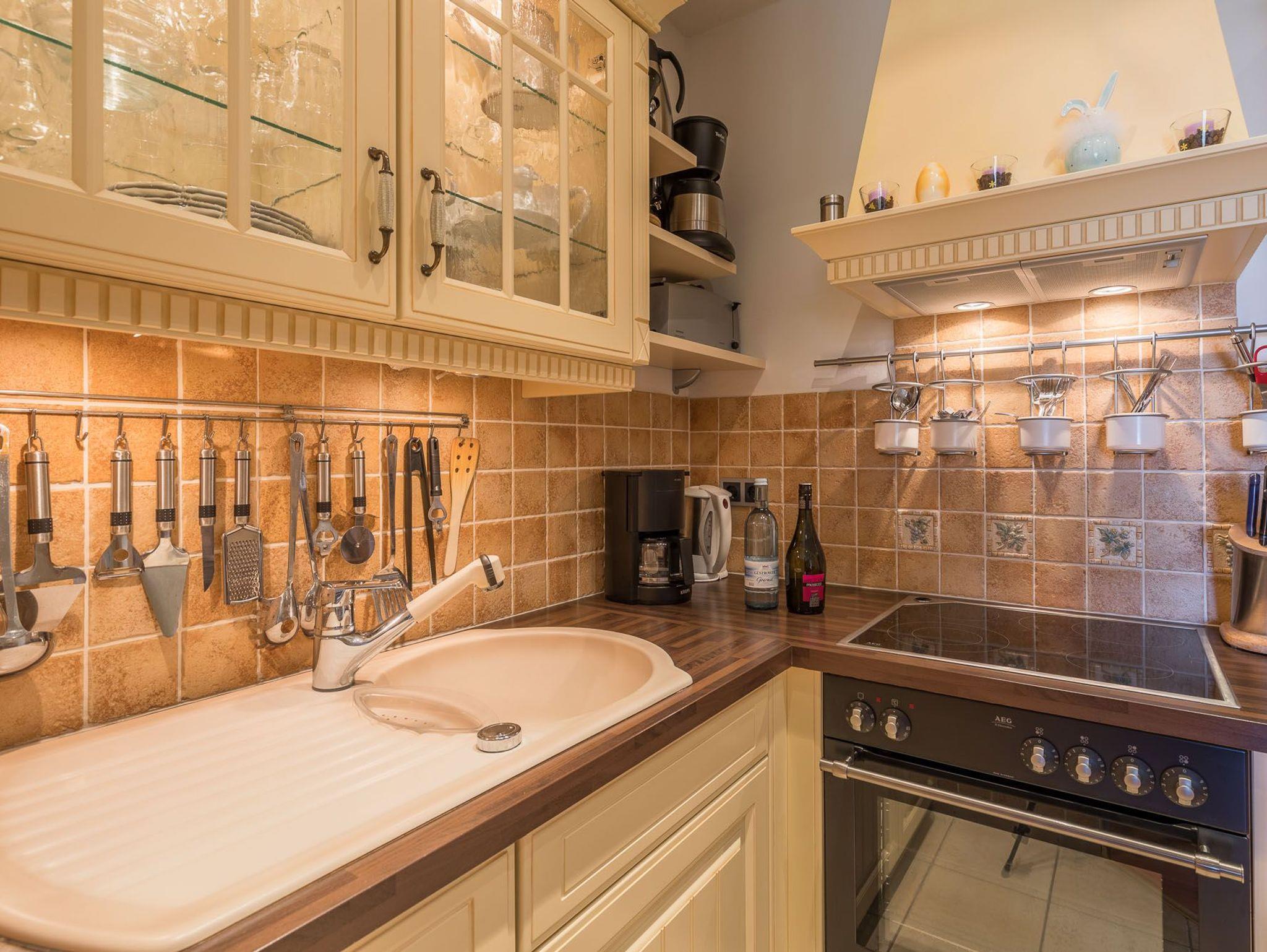 Zur Küchenausstattung der Ferienwohnung gehören ein Backofen, ein Cerankochfeld und ein Kühlschrank mit Gefrierfach. Die Küche ist eine offene Küchenzeile. Die Unterkunft ist eine Nichtraucherwohnung. Mit dem vorhandenen WLAN-Anschluss gehen Sie ins Internet. Der Flachbild-TV im Wohnzimmer sorgt für Unterhaltung.