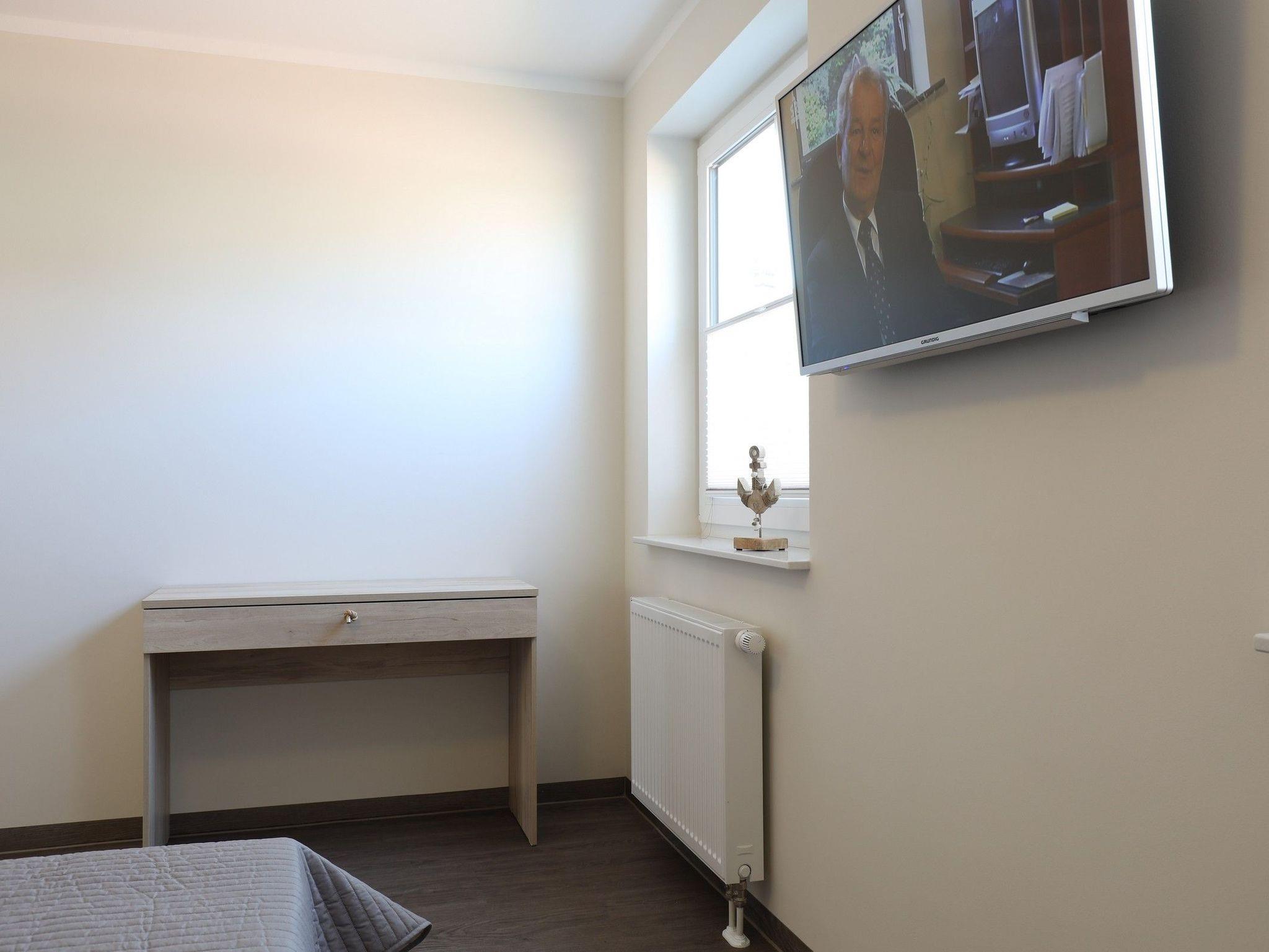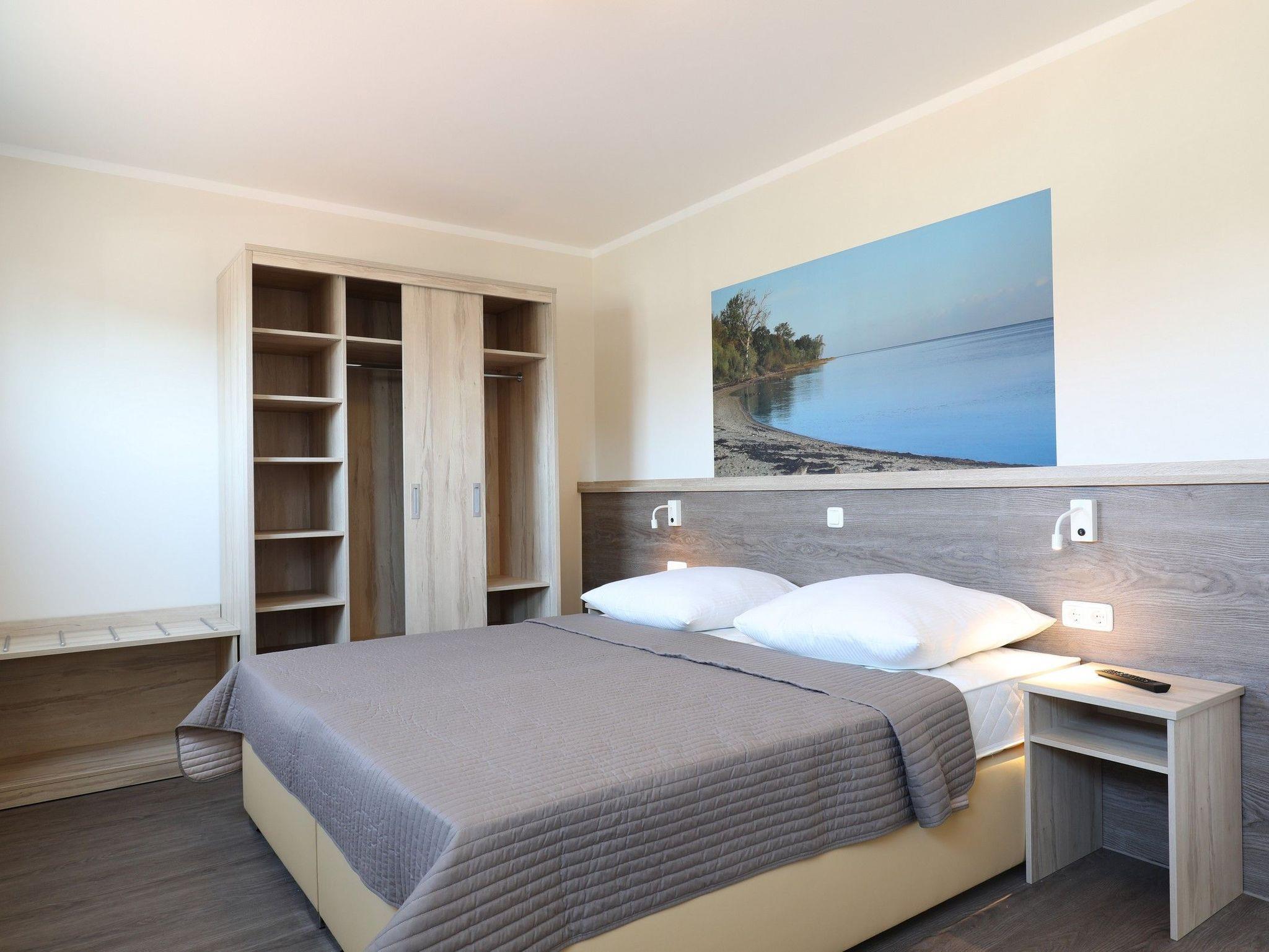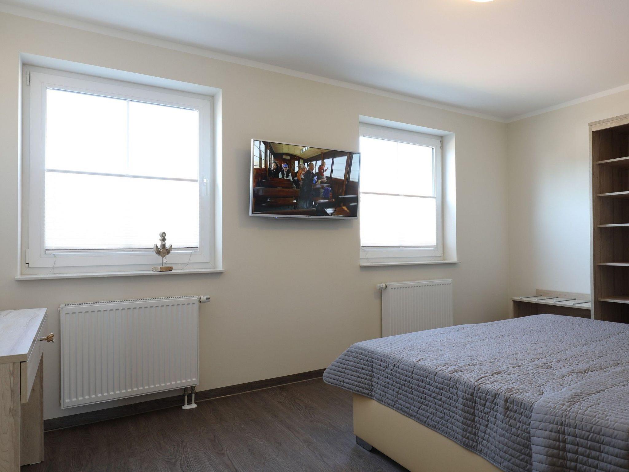 Das Schlafzimmer ist mit einem Doppelbett und einem geräumigen Kleiderschrank ausgestattet. Auch das Schlafzimmer verfügt über einen Flatscreen-TV.