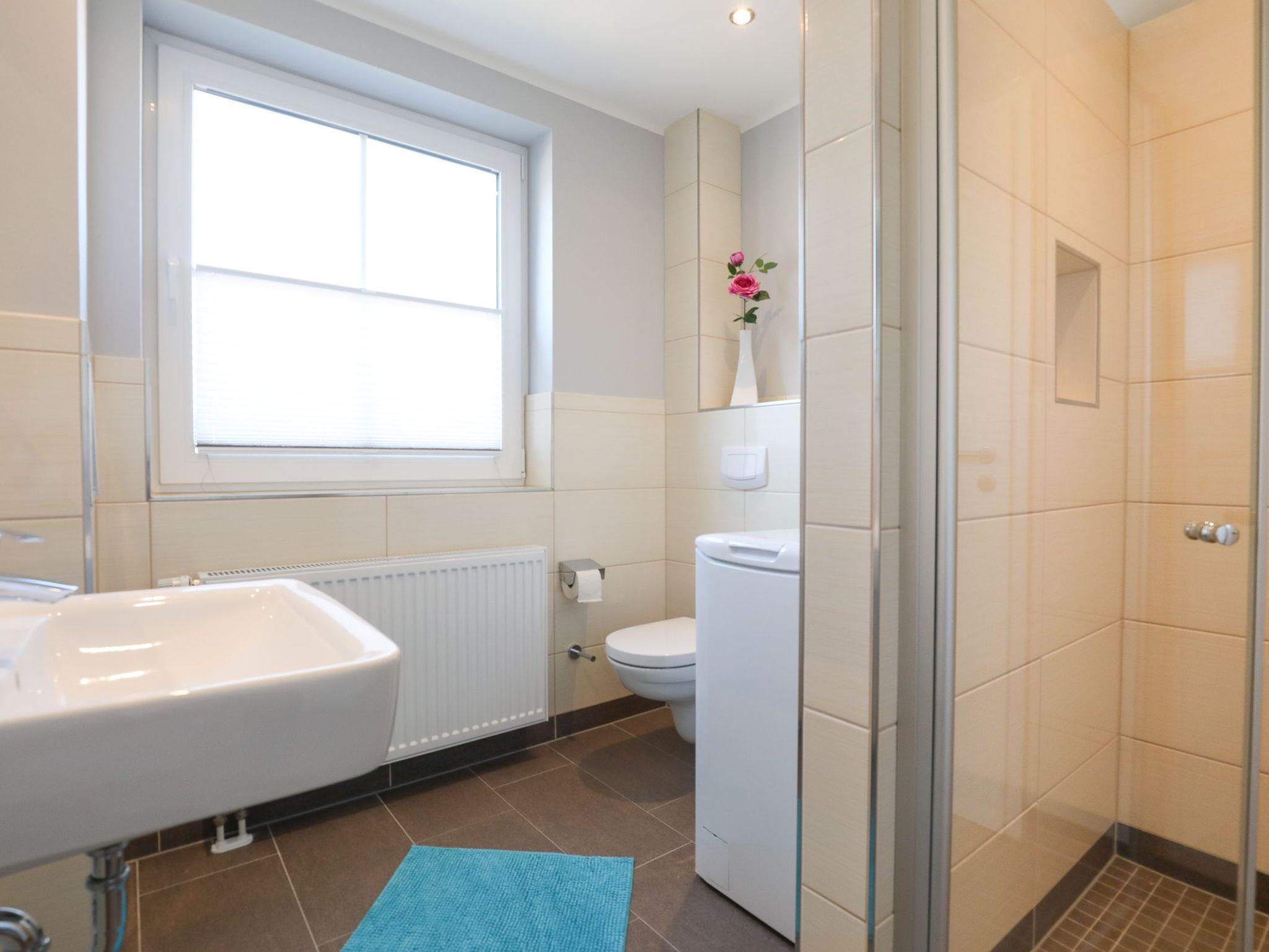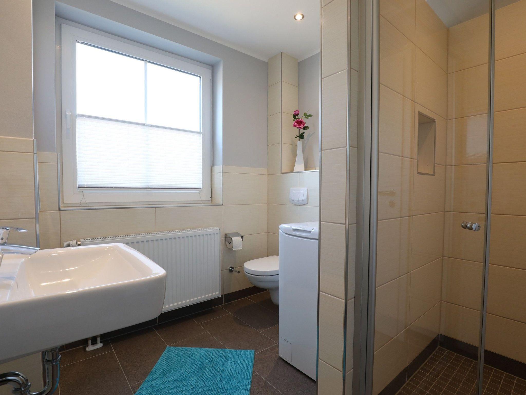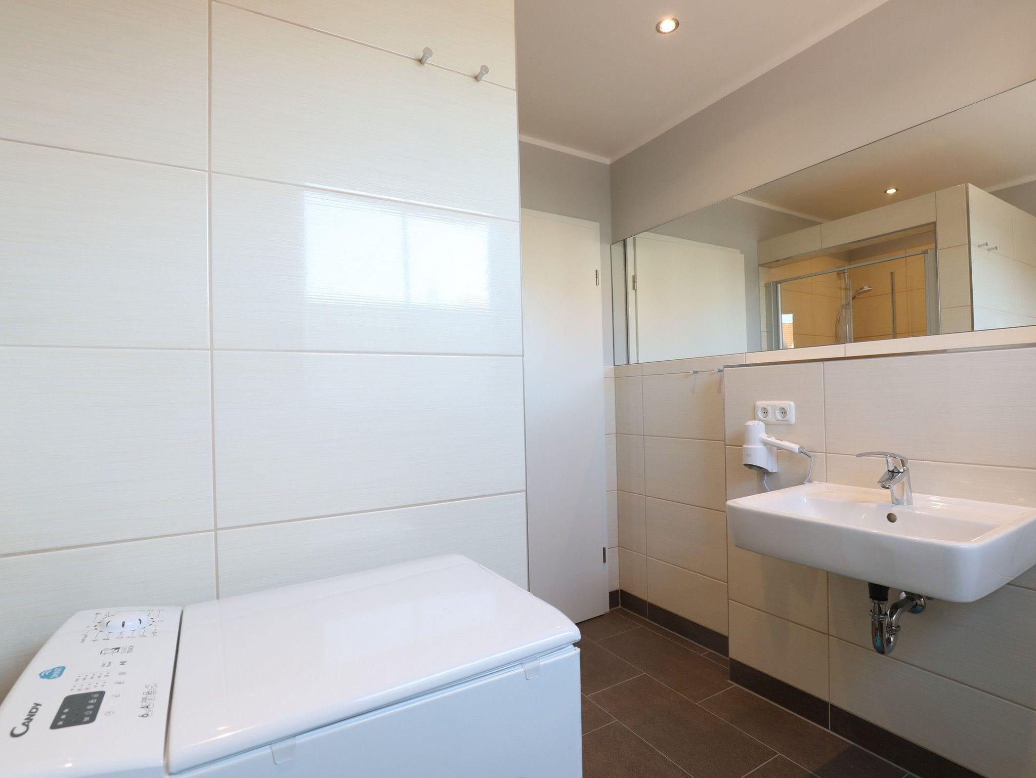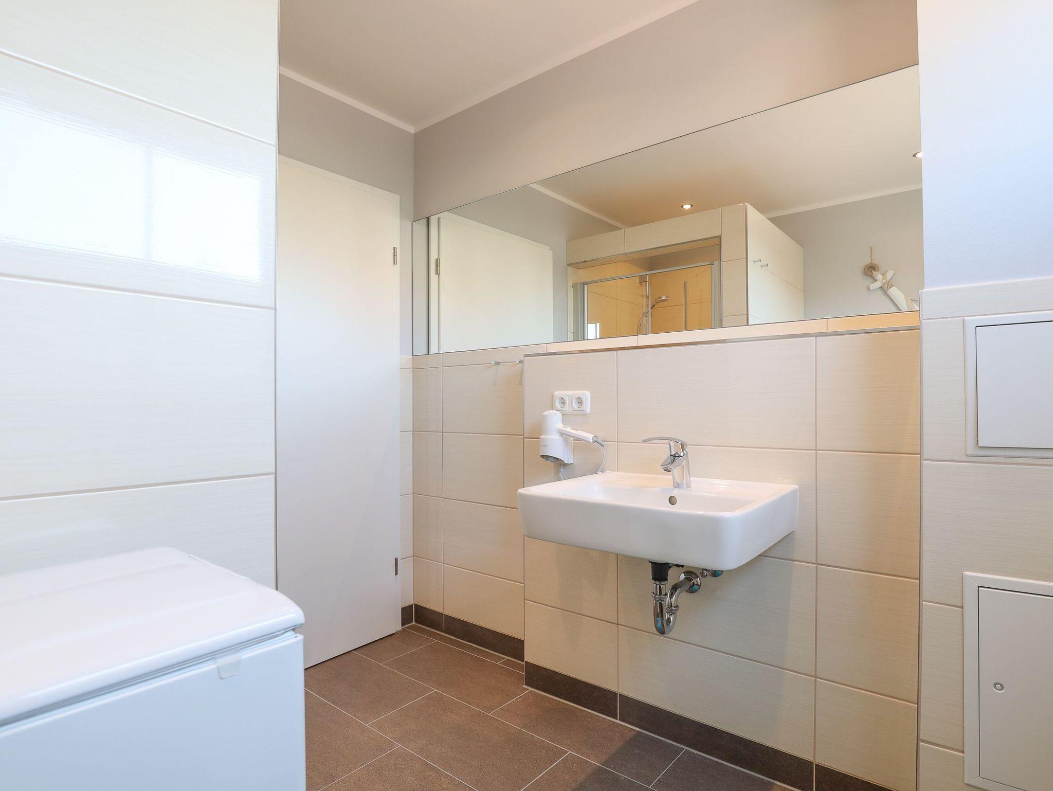 Ein großes Bad mit Tageslicht bietet eine barrierefreie Dusche, Waschbecken, WC und auch eine Waschmaschine.
