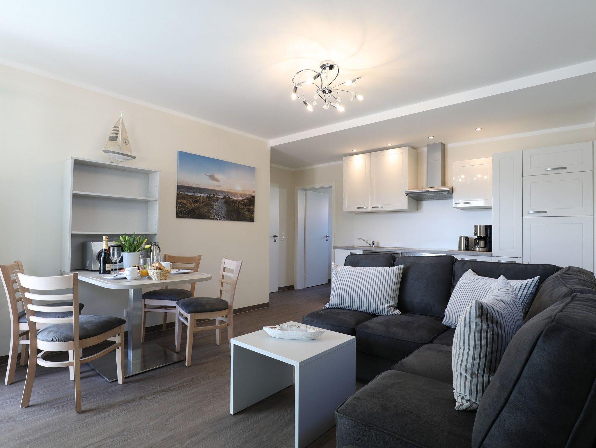 Im offenen Wohn- und Essbereich mit integrierter Küchenzeile und Zugang zum möblierten, überdachten Südost-Balkon lässt es sich herrlich wohlfühlen. Hier können Sie den Abend entspannt bei einem Glas Wein ausklingen lassen.