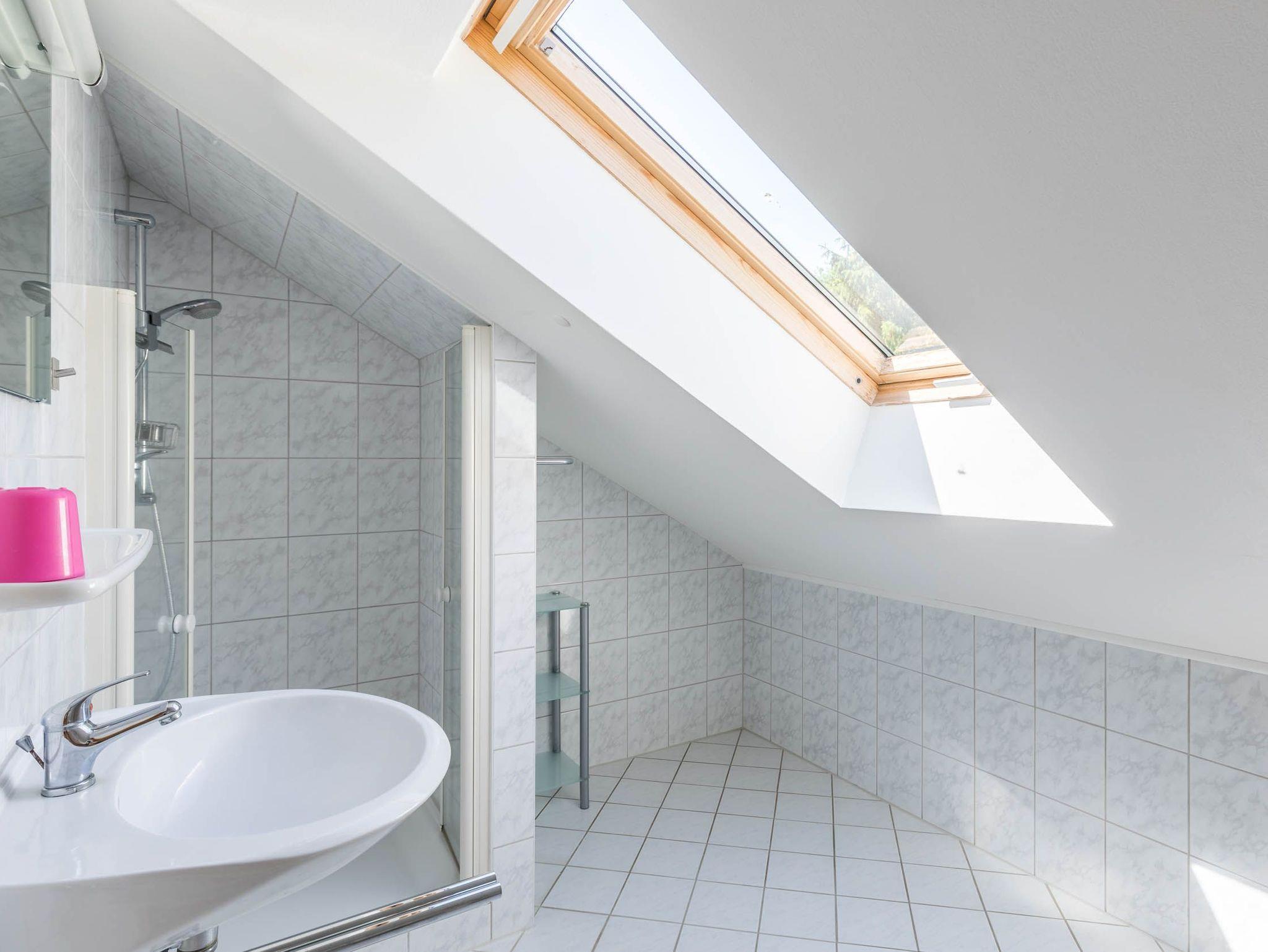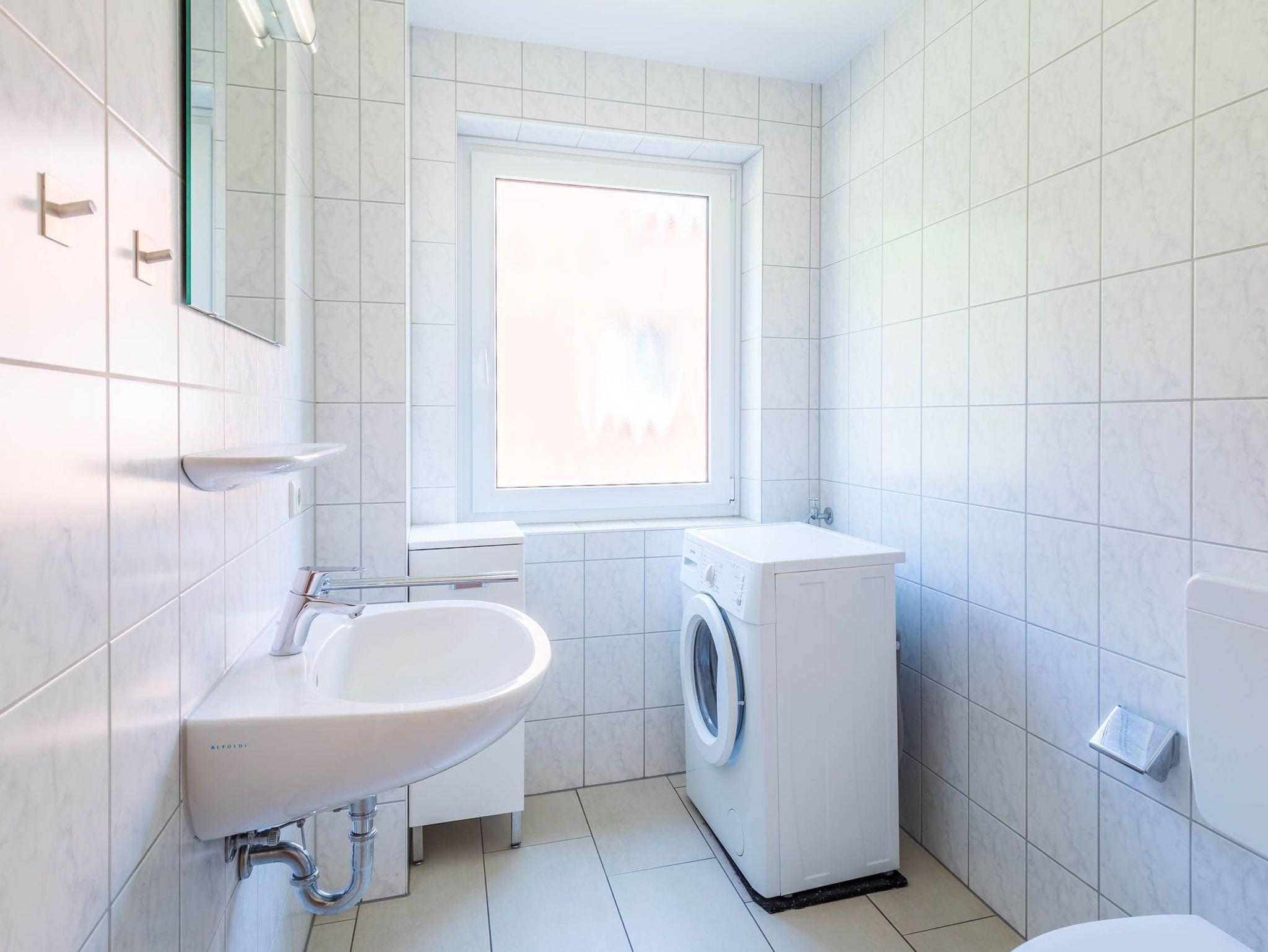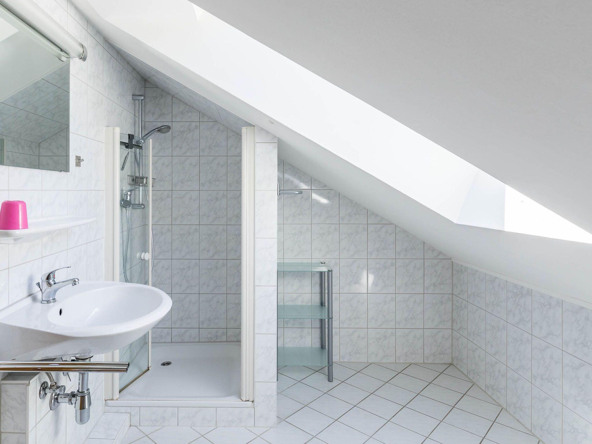 Auch das helle Badezimmer mit Fenster finden Sie auf der unteren Etage. Es ist mit Dusche, WC und auch einer gebührenfreien Waschmaschine ausgestattet.