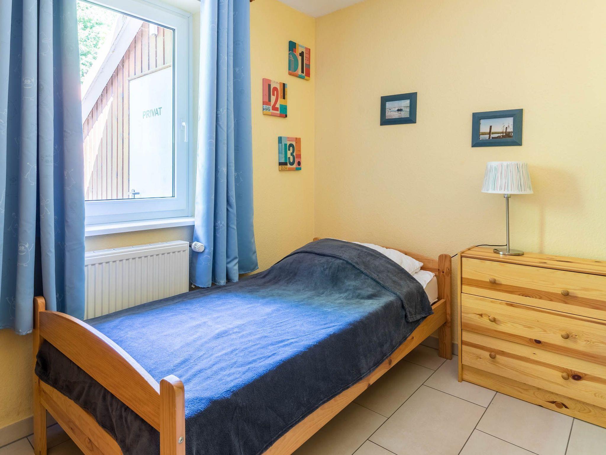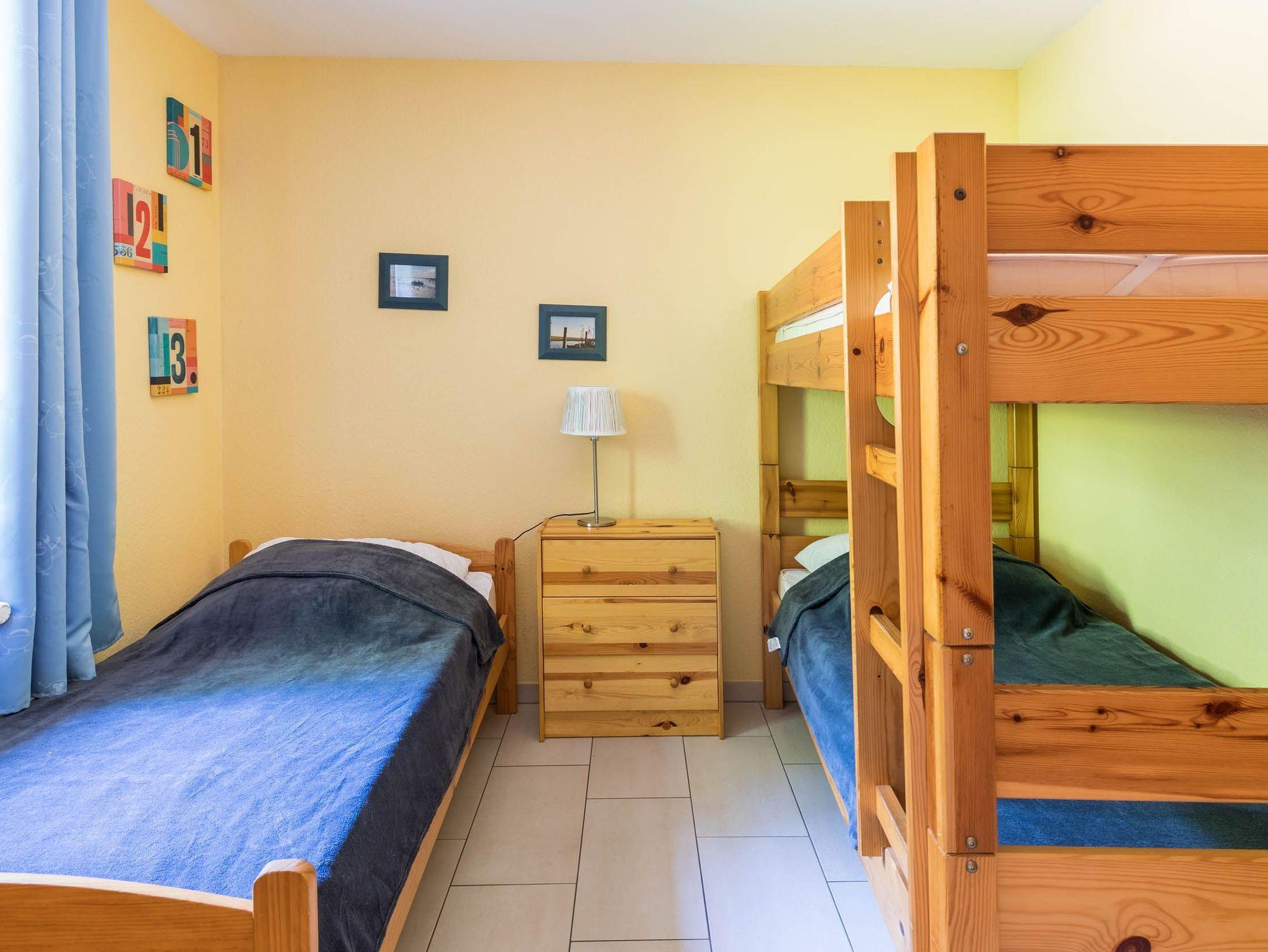 Das Gäste-/ Kinderzimmer auf selbiger Ebene bietet ein Einzelbett und ein Etagenbett. In dem 2türigen Kleiderschrank kann gern die Urlaubsgarderobe abgelegt werden.