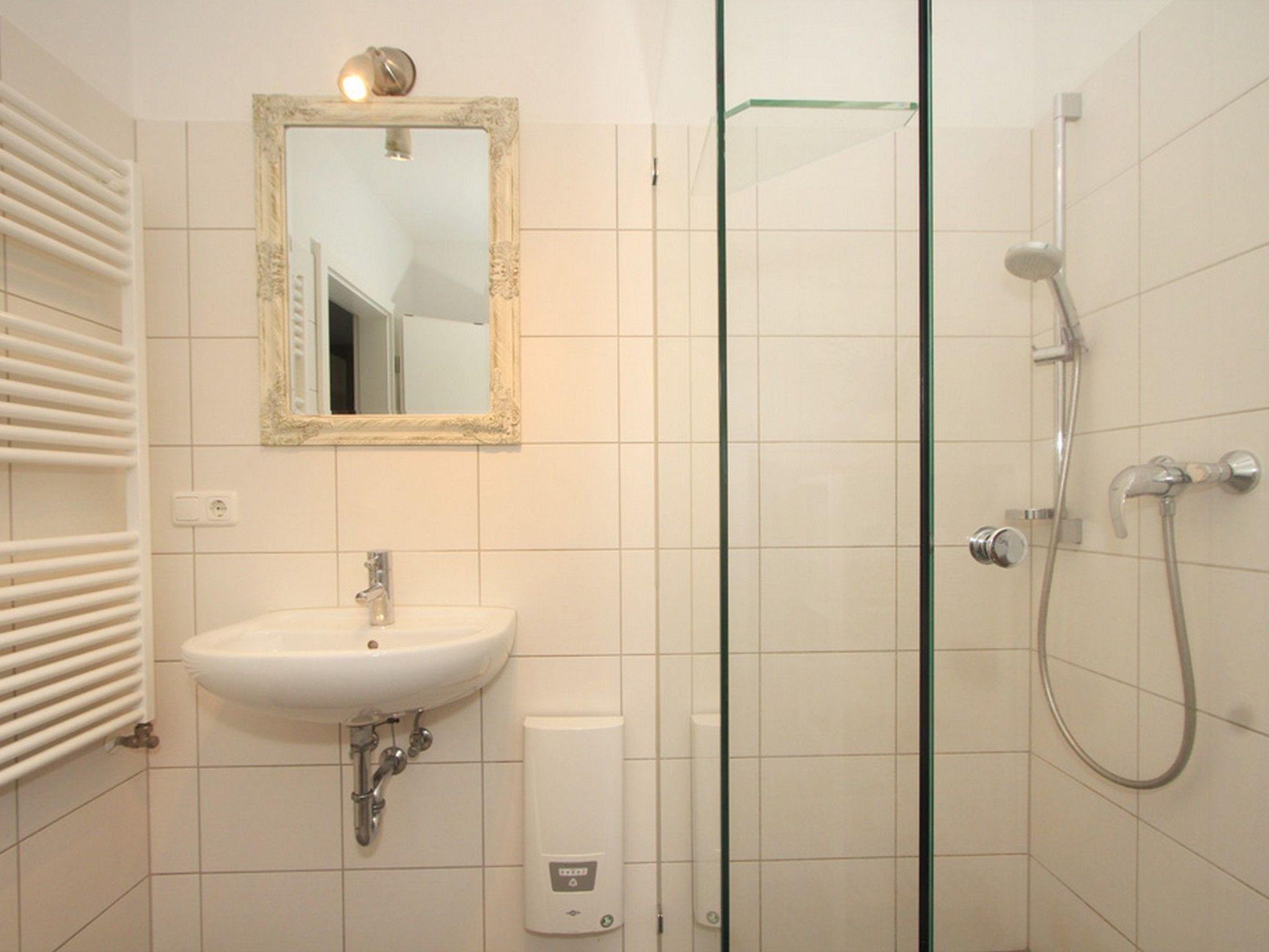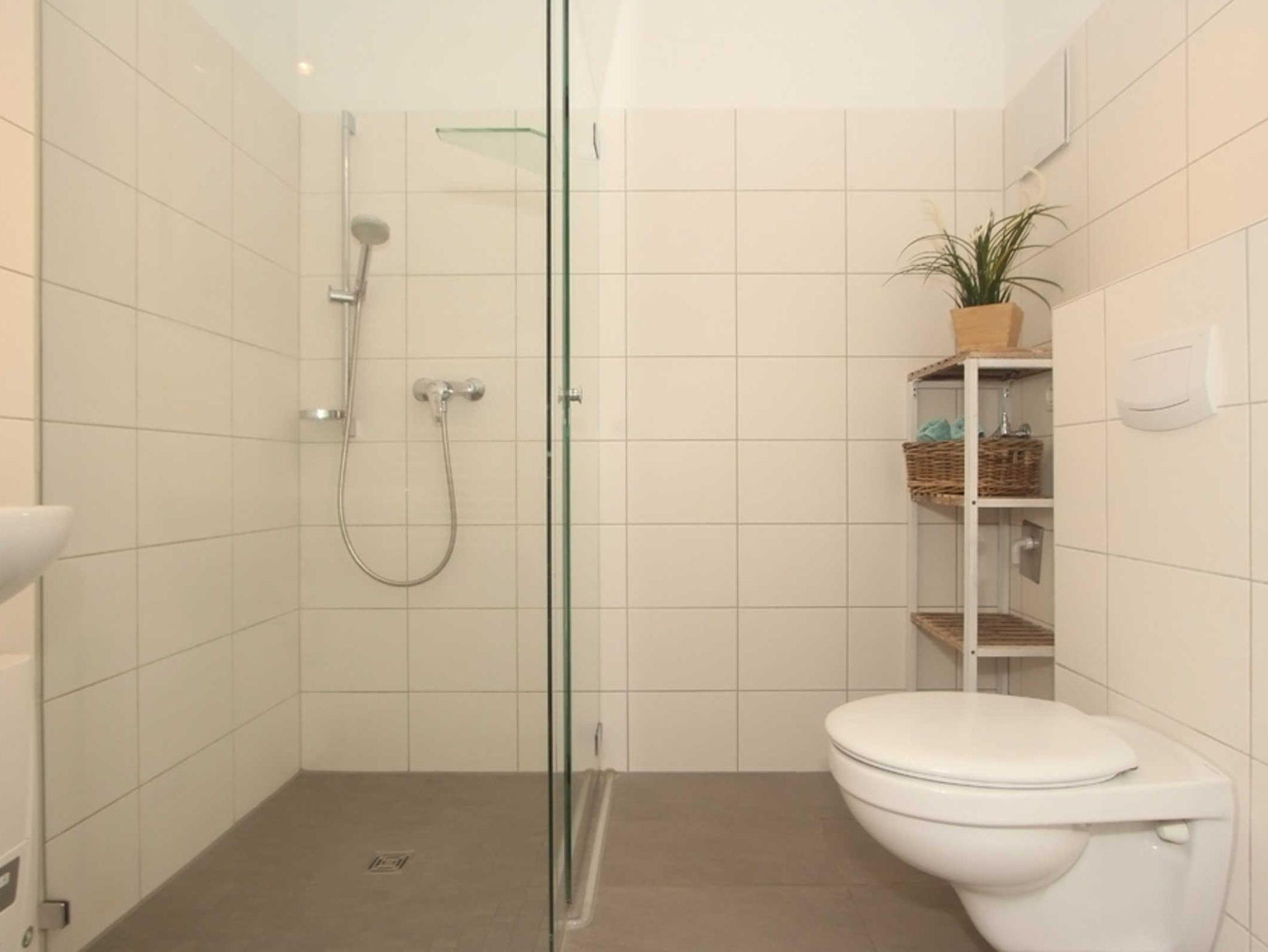 Im Badezimmer gibt es neben einem Waschtisch, einem WC und einer ebenerdigen Dusche zusätzlich einen praktischen Handtuchtrockner.