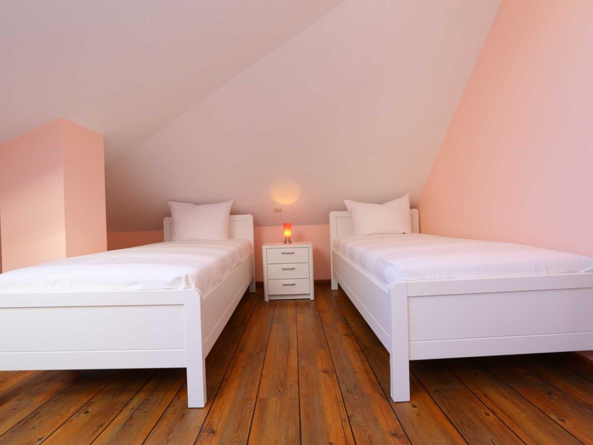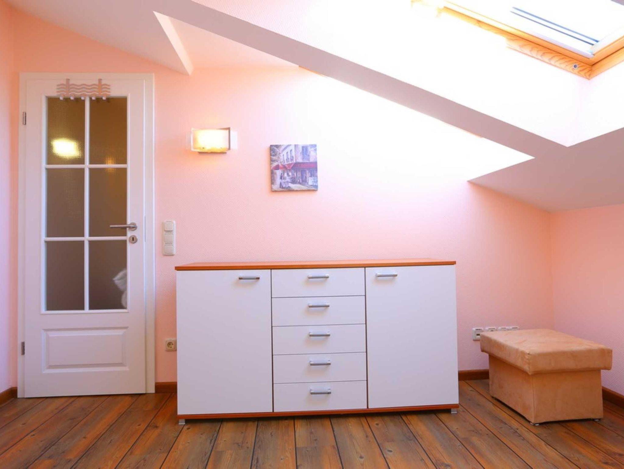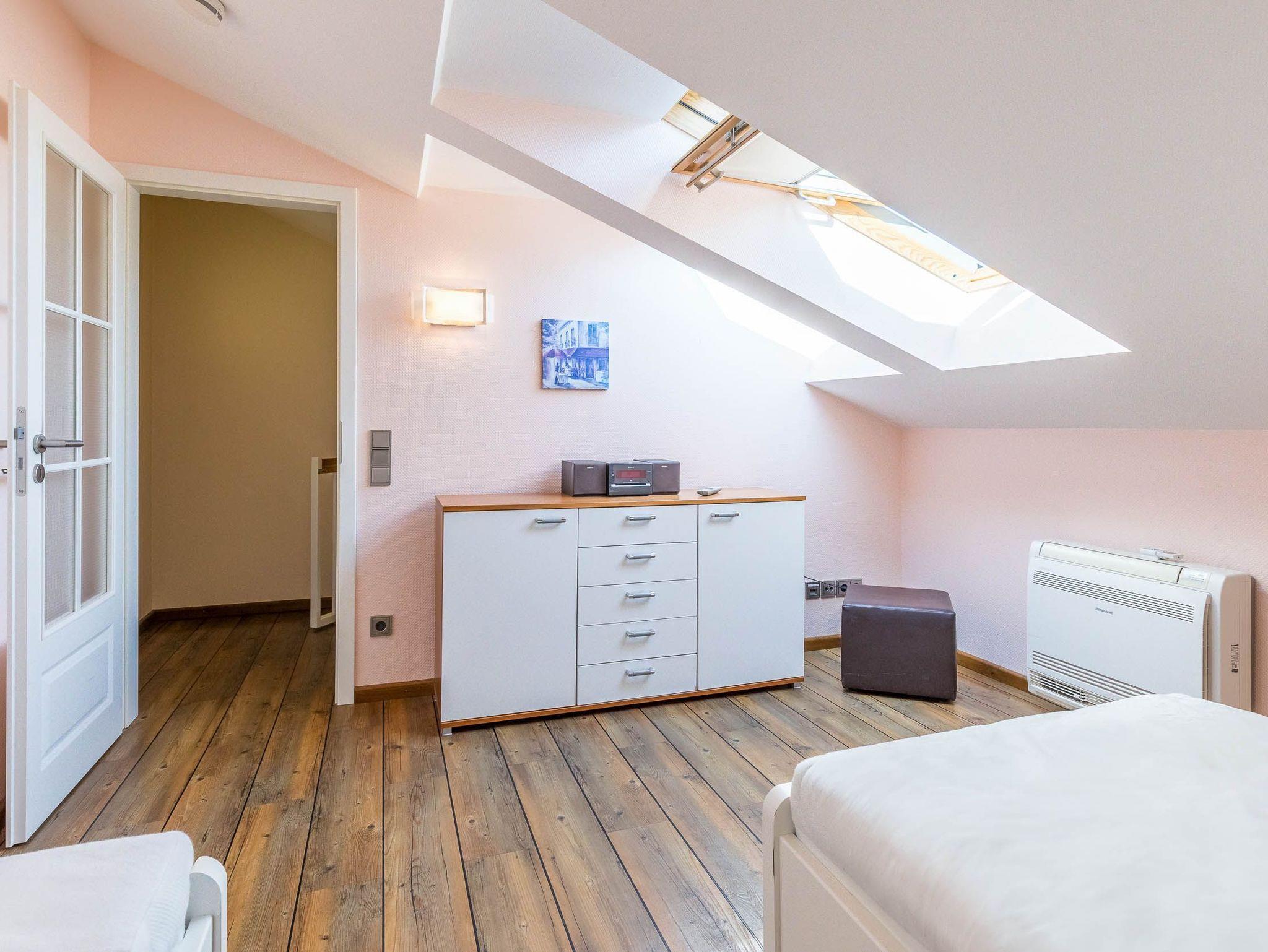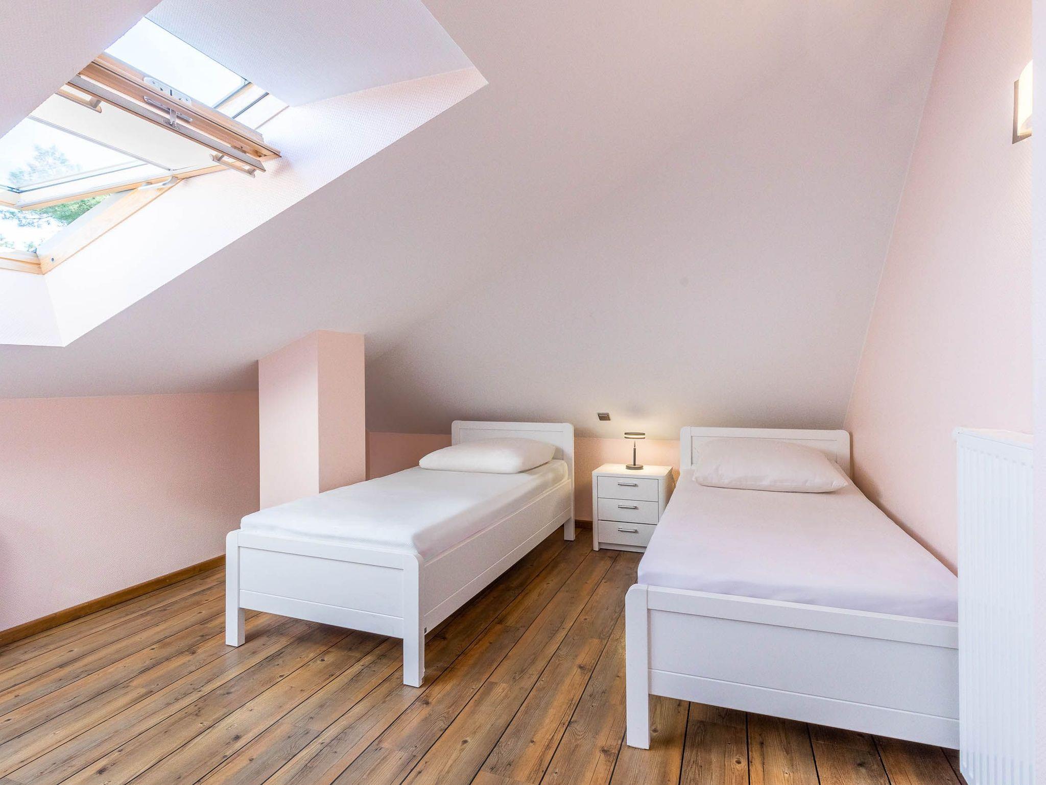 Das Kinder-/ Gästezimmer ist in der zweiten Wohnebene, im DG einrichtet. Hier finden Sie 2 Einzelbetten, ein Nachttischchen und eine Kommode für die Ablage.