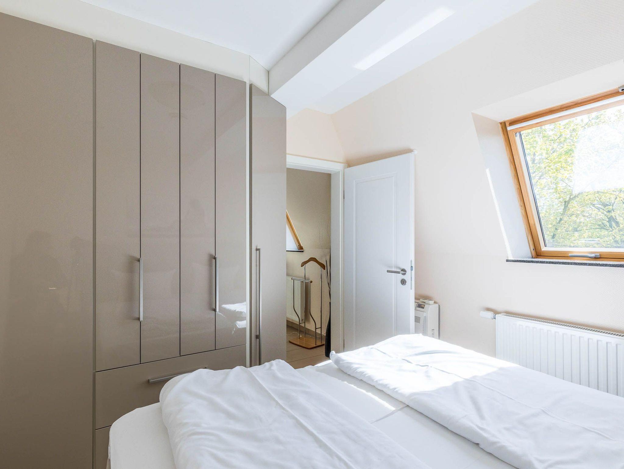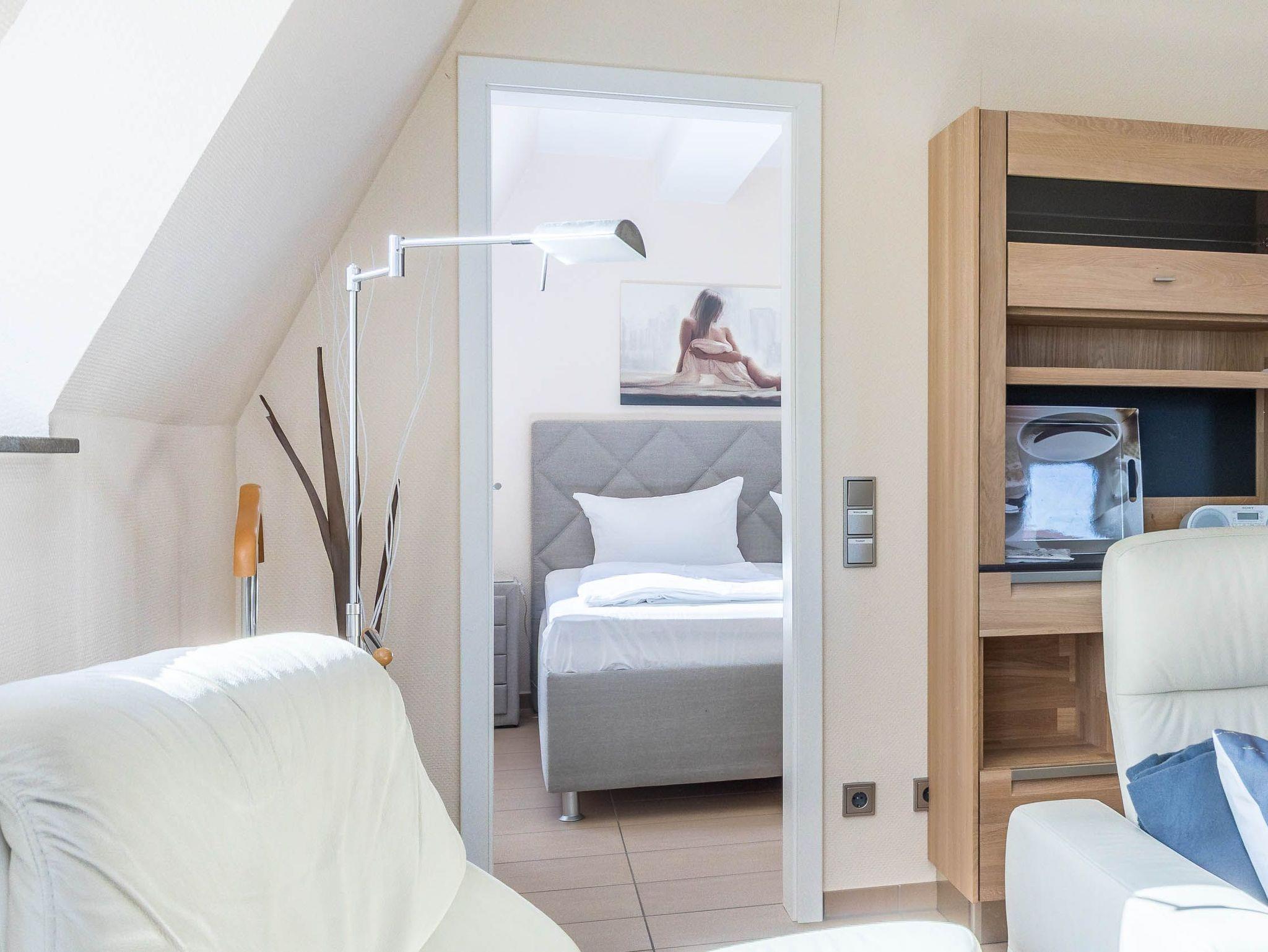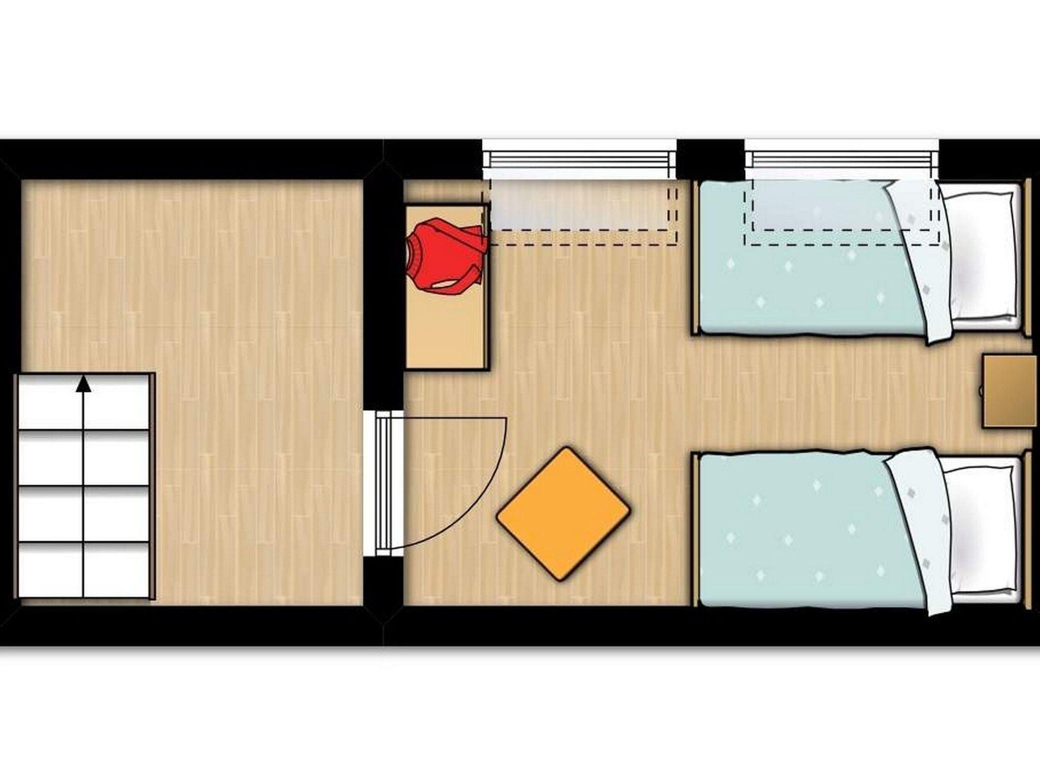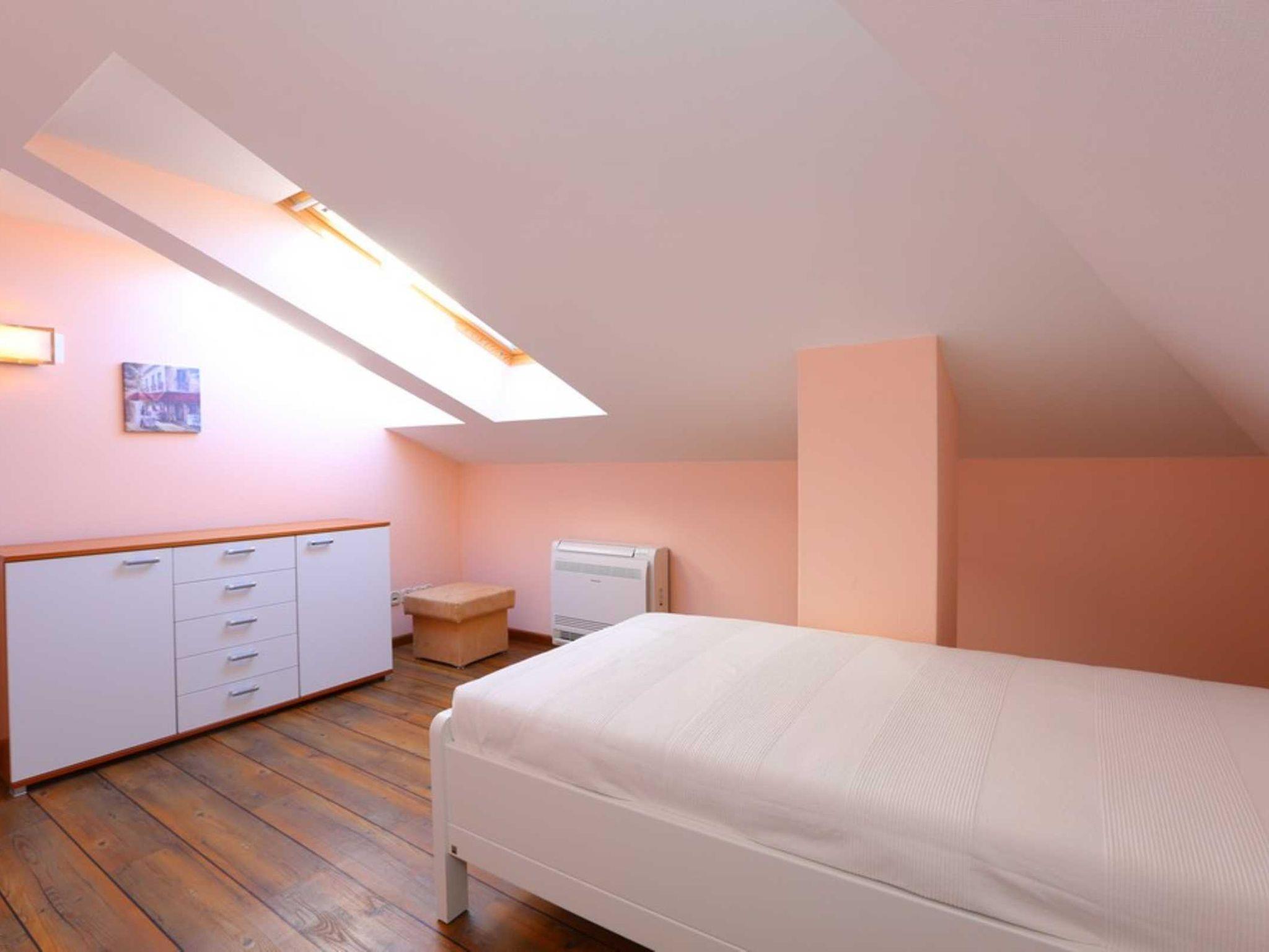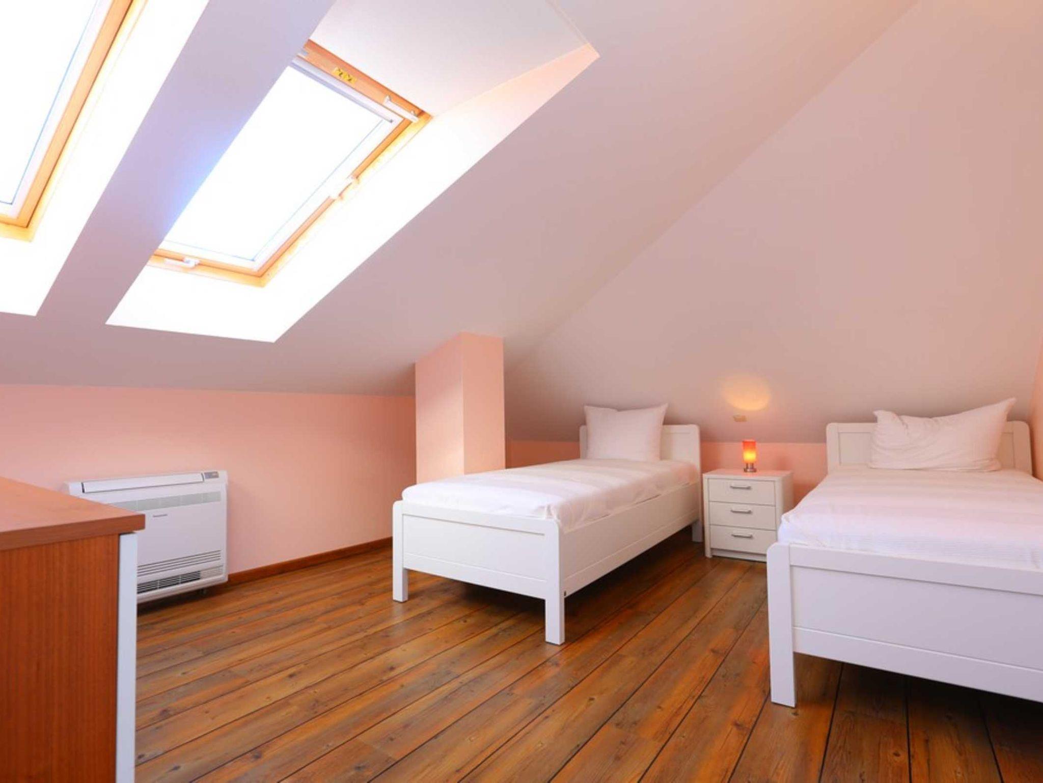Das Kinder-/ Gästezimmer ist in der zweiten Wohnebene, im DG einrichtet. Hier finden Sie 2 Einzelbetten, ein Nachttischchen und eine Kommode für die Ablage.