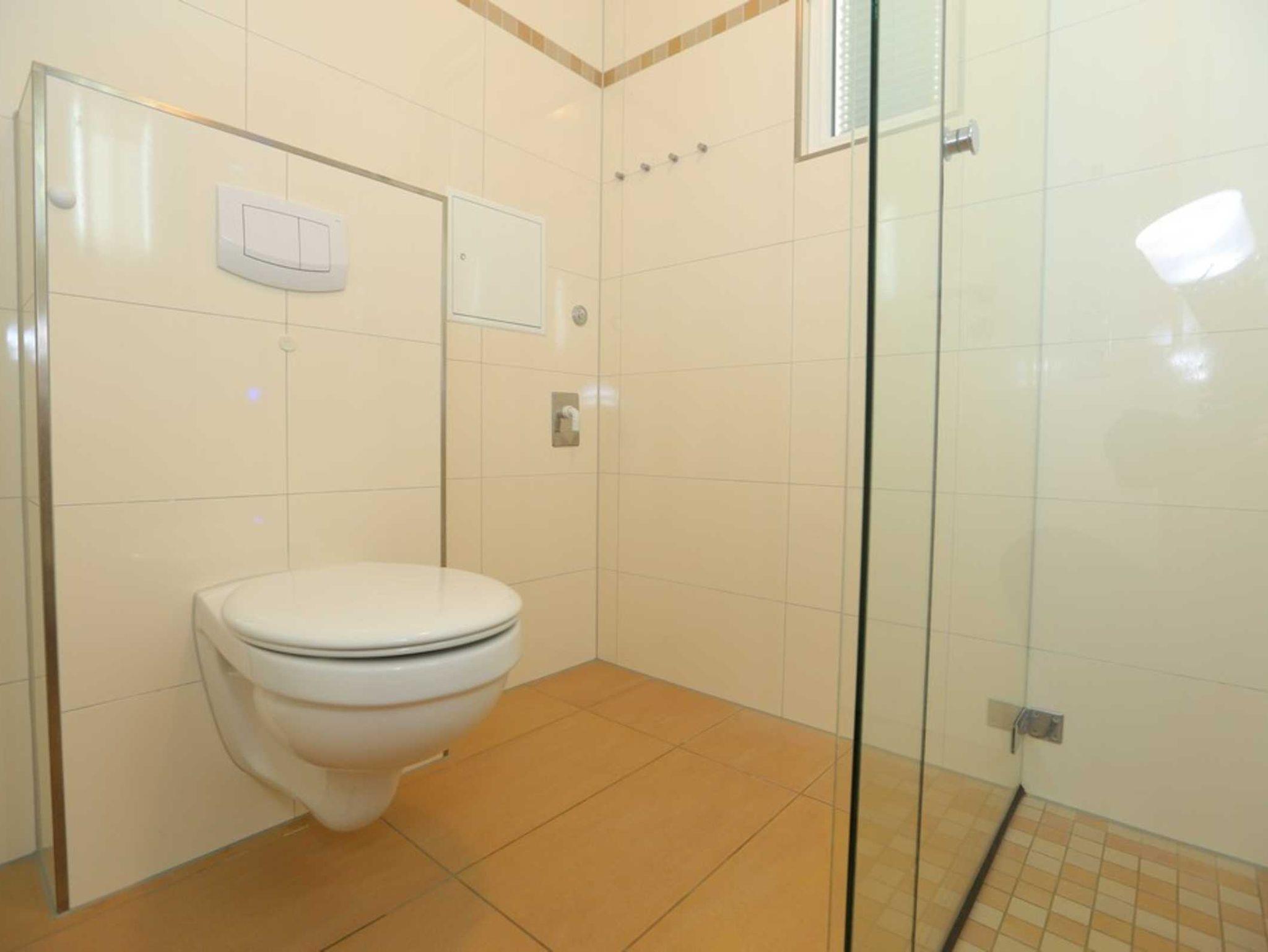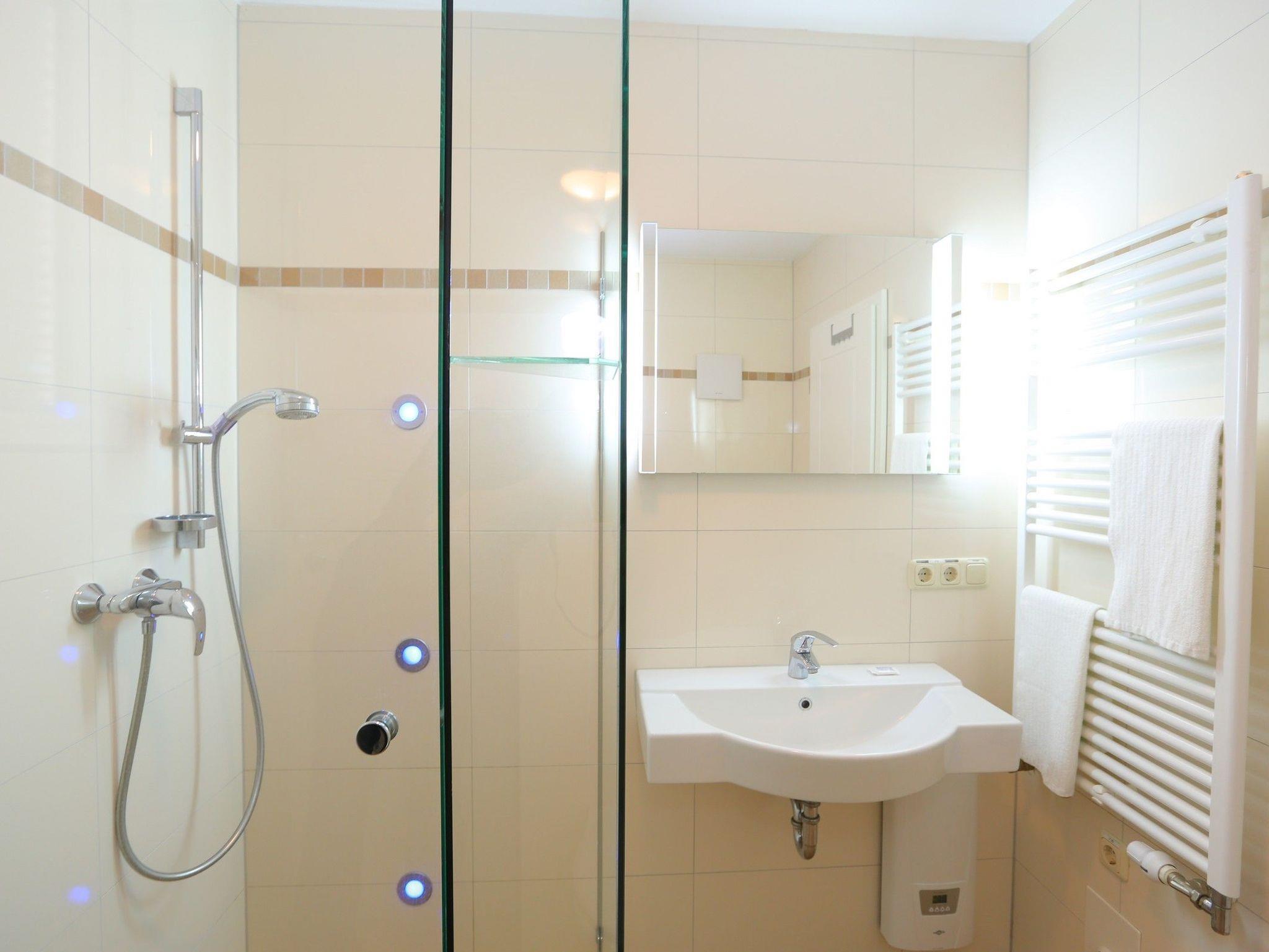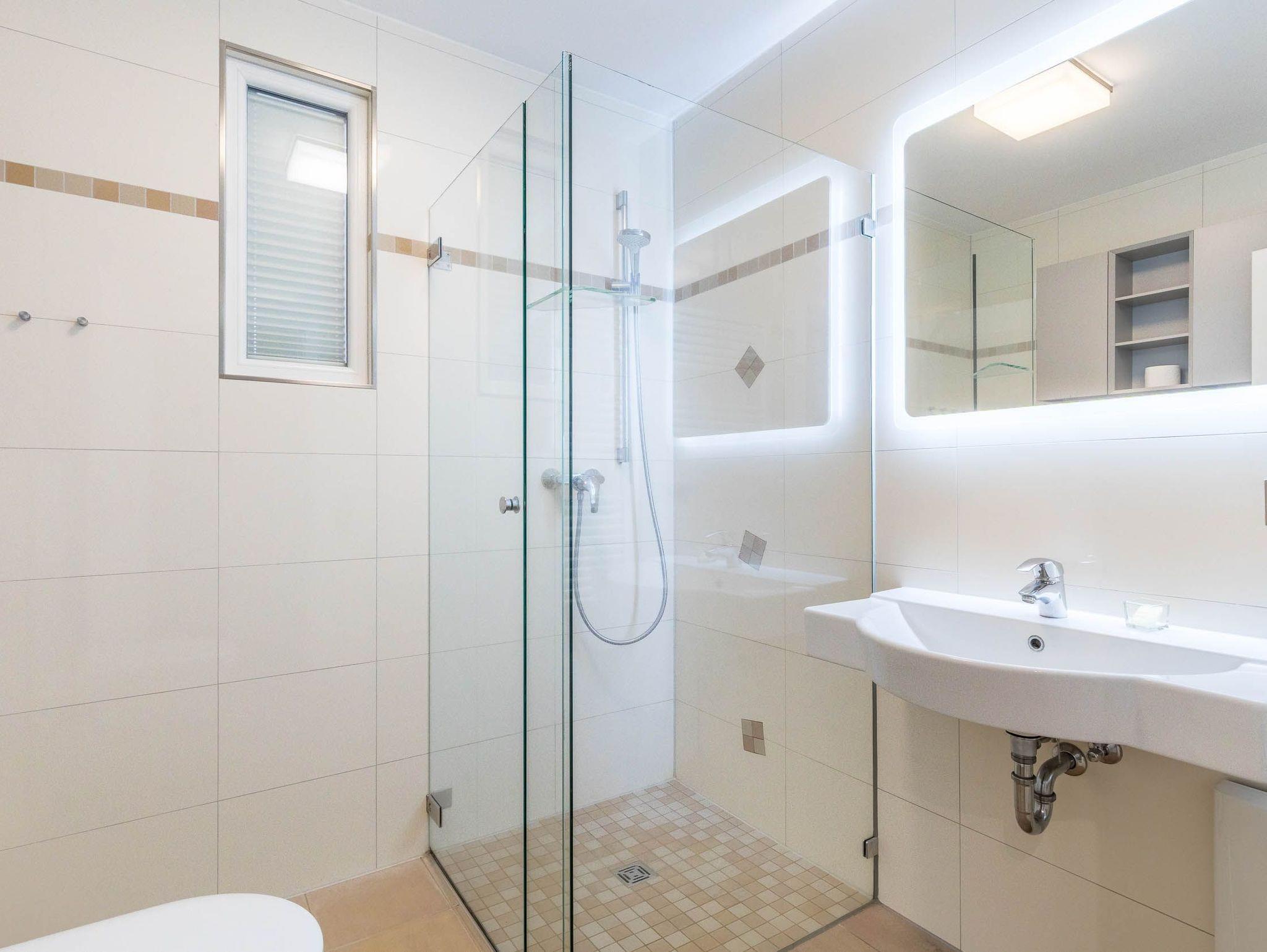 Das Bad, welches sich ebenfalls im unteren Bereich der Wohnung befindet, ist mit WC, ebenerdiger Dusche mit Beleuchtung und Handtuchtrockner ausgestattet.