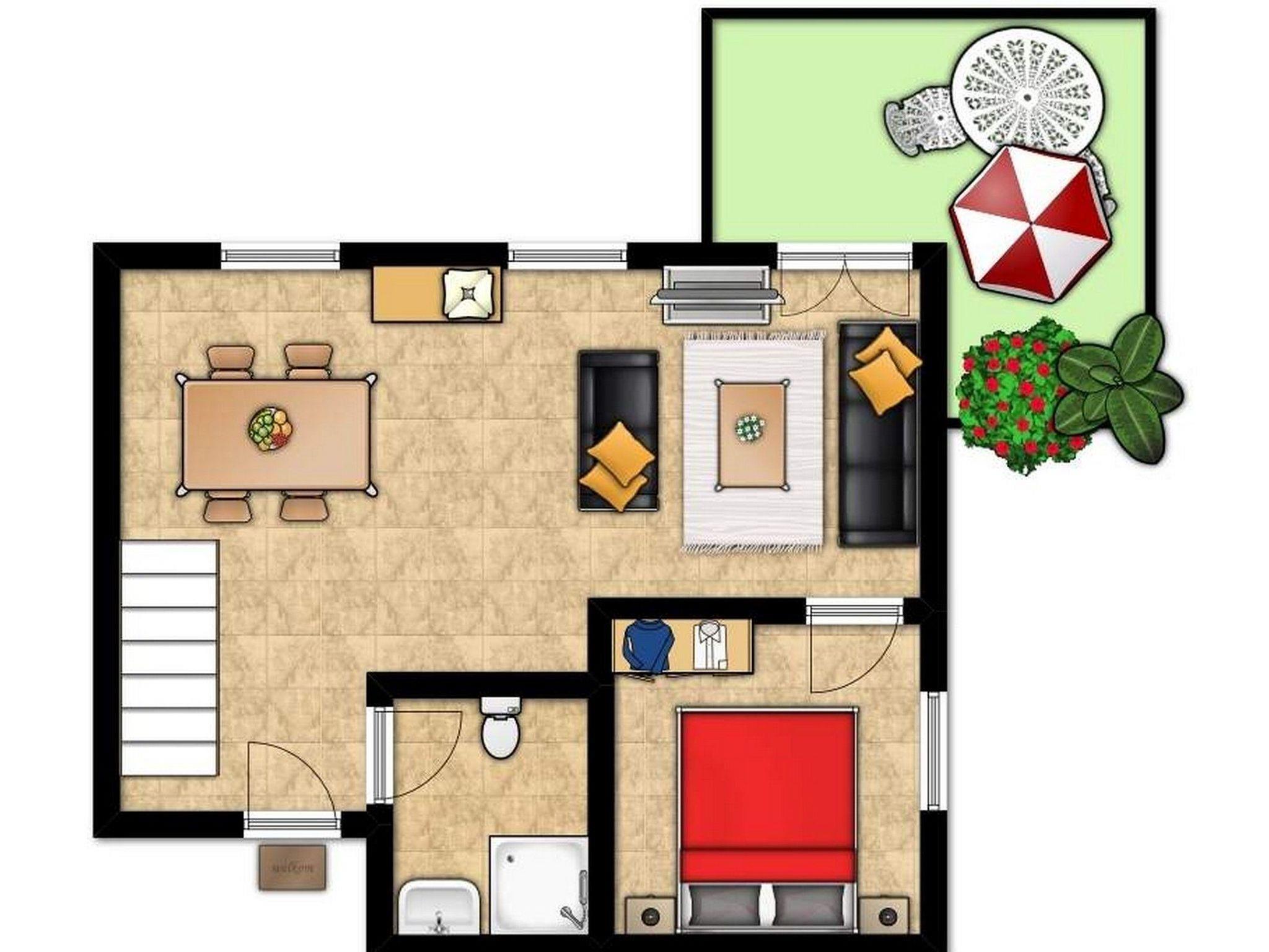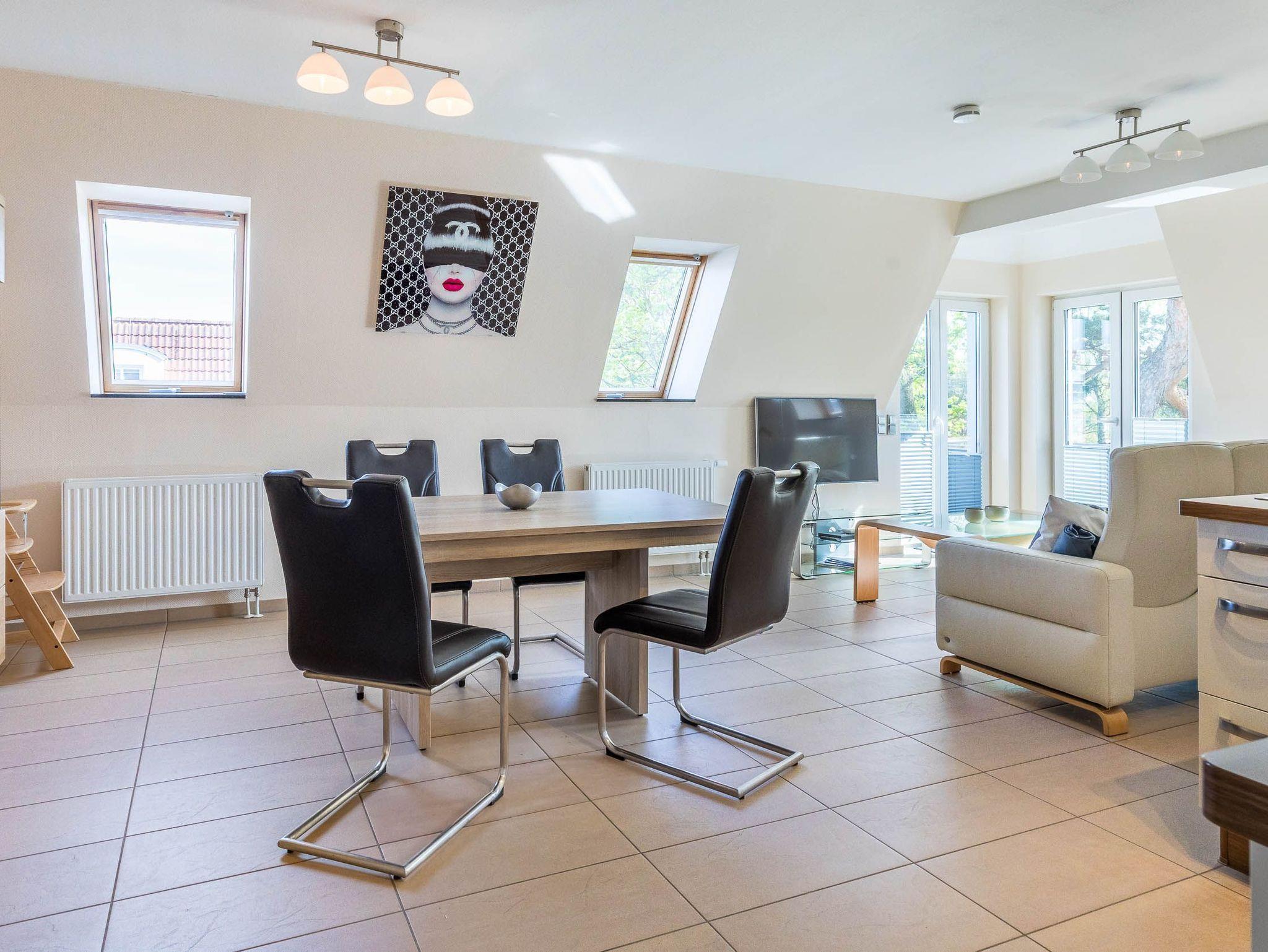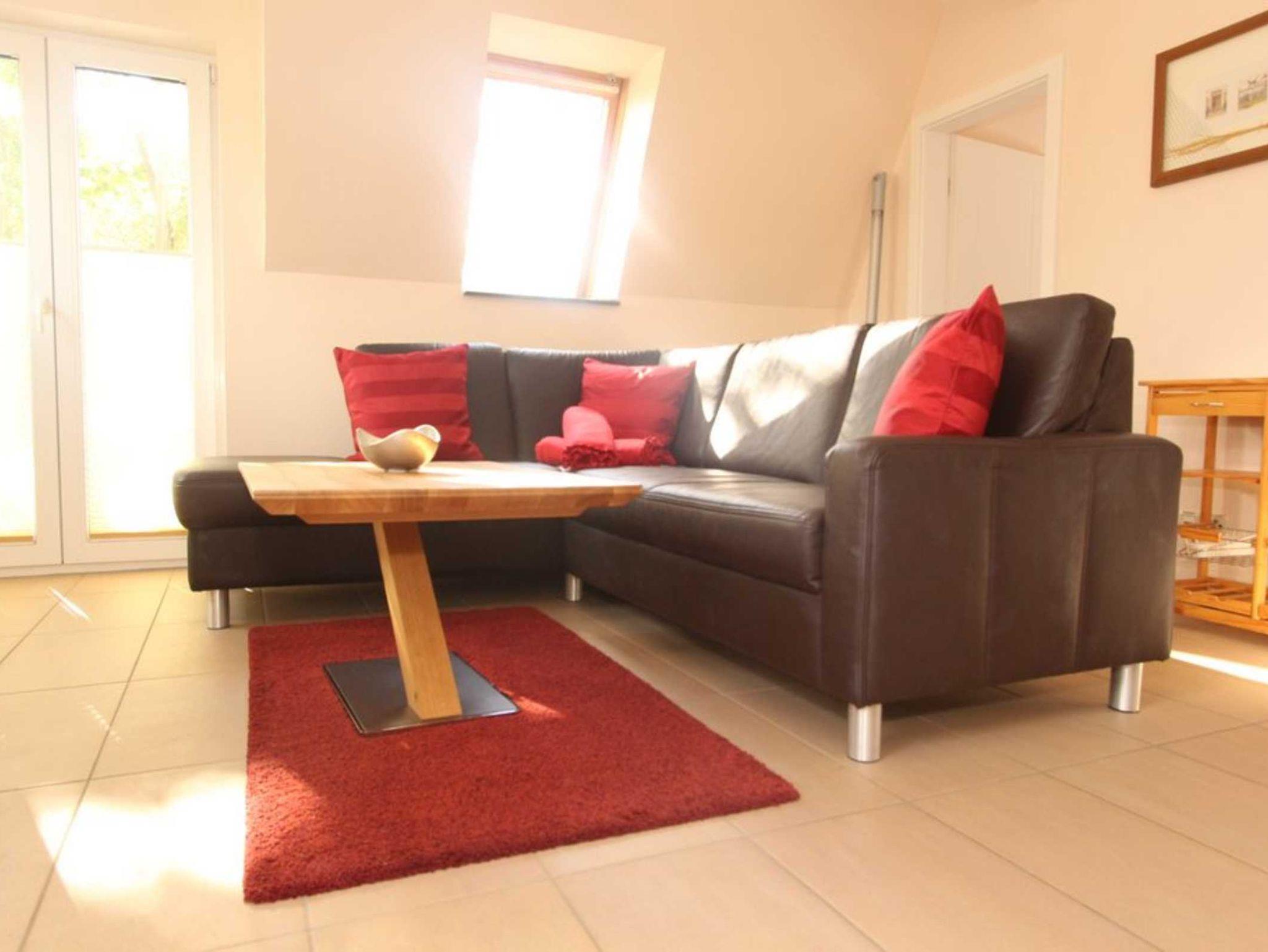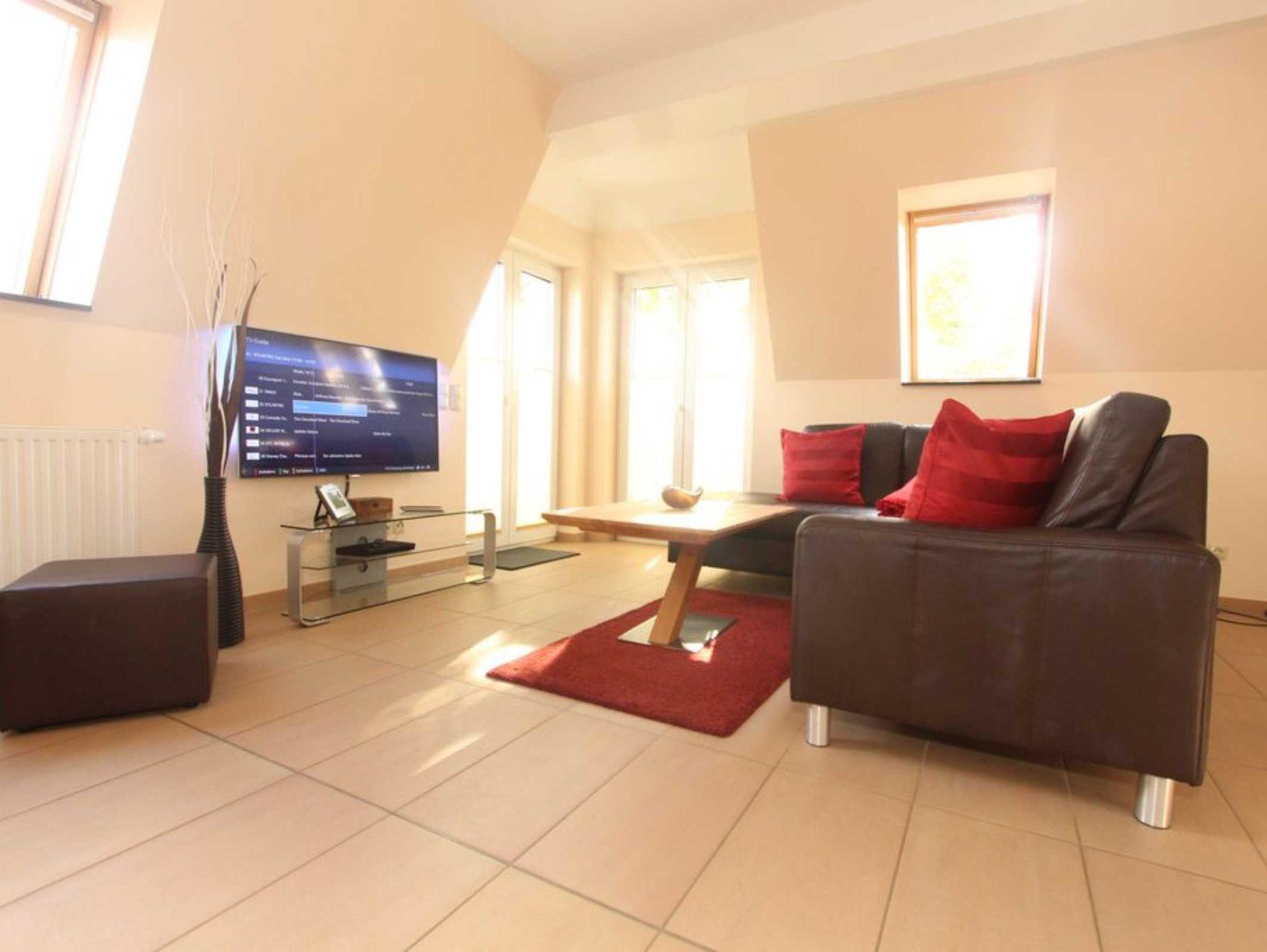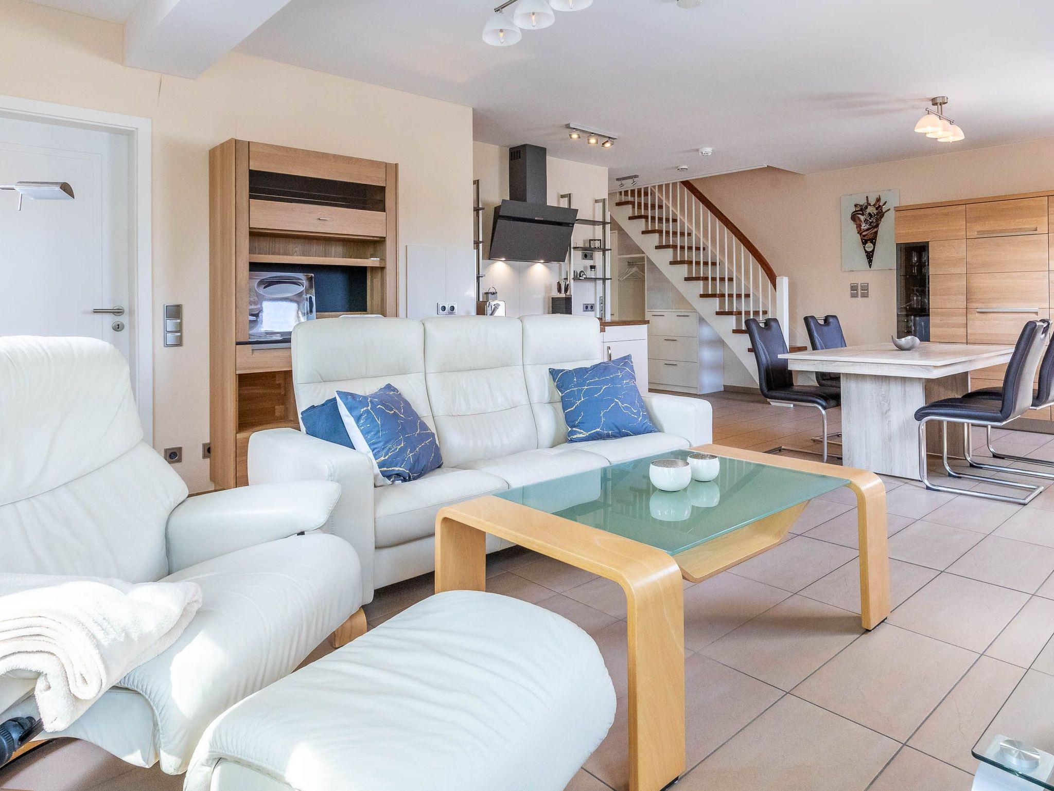 Im Wohn- und Essbereich in der ersten Wohnebene gibt es neben der Essecke auch ein Ecksofa mit einem Flachbildfernseher, DVD-Player und CD-Player für die Unterhaltung. Auf dem Eckbalkon mit Südost-/Südwestausrichtung, welchen Sie vom Wohnzimmer aus begehen können, stehen Sonnenschirm und Gartenmöbel bereit.