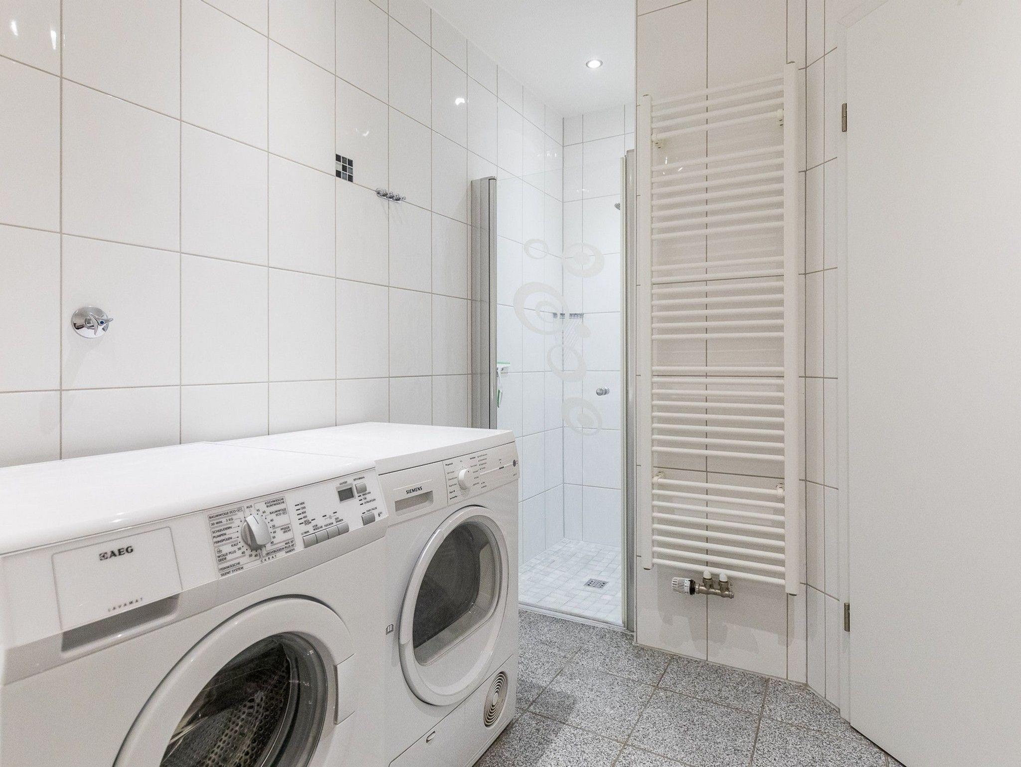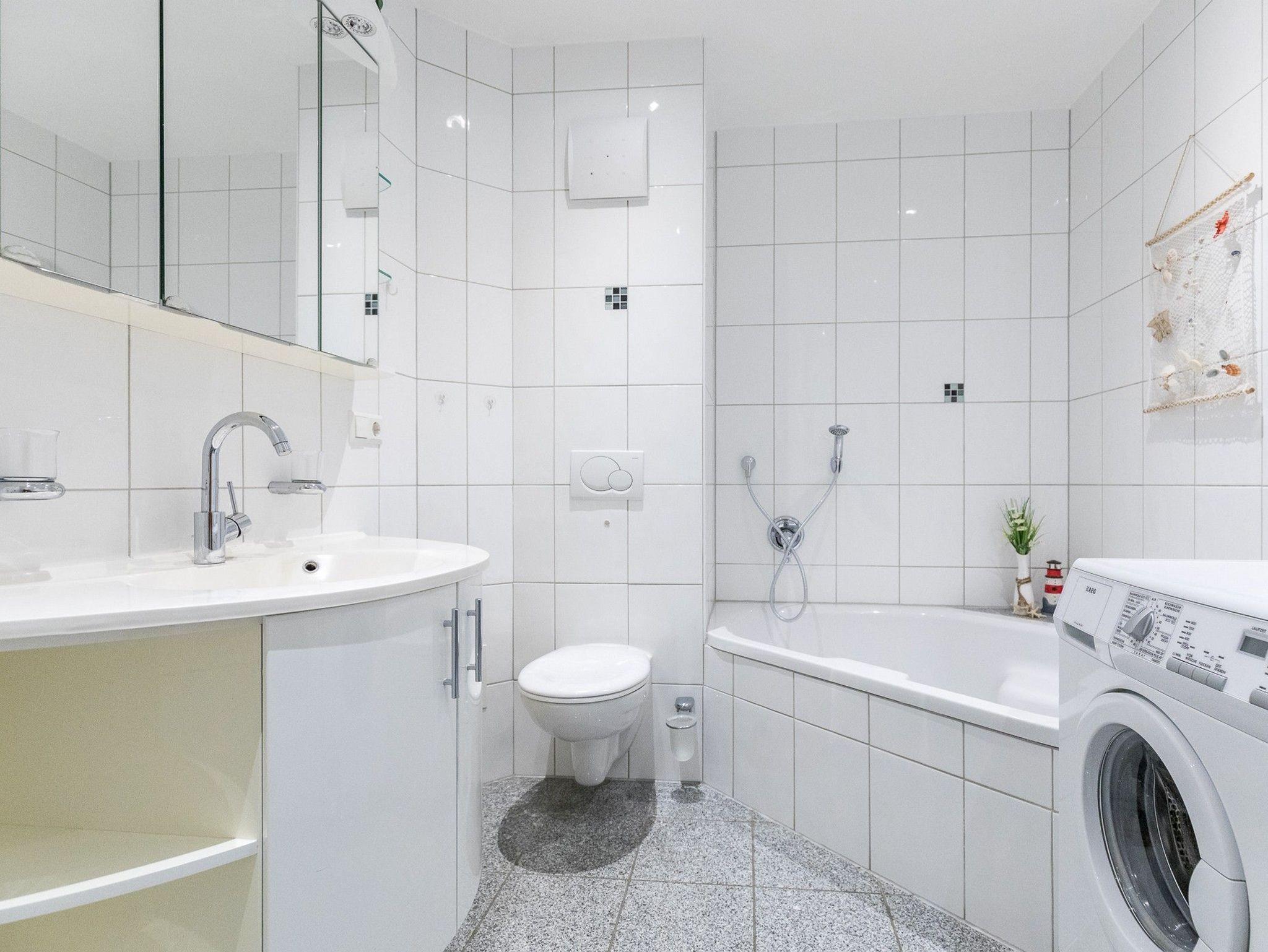 Das Bad ist sehr umfangreich eingerichtet. Sie finden hier neben der ebenerdigen Dusche und dem WC auch eine Eckbadewanne, einen großen Waschtisch, eine Waschmaschine und einen Trockner.