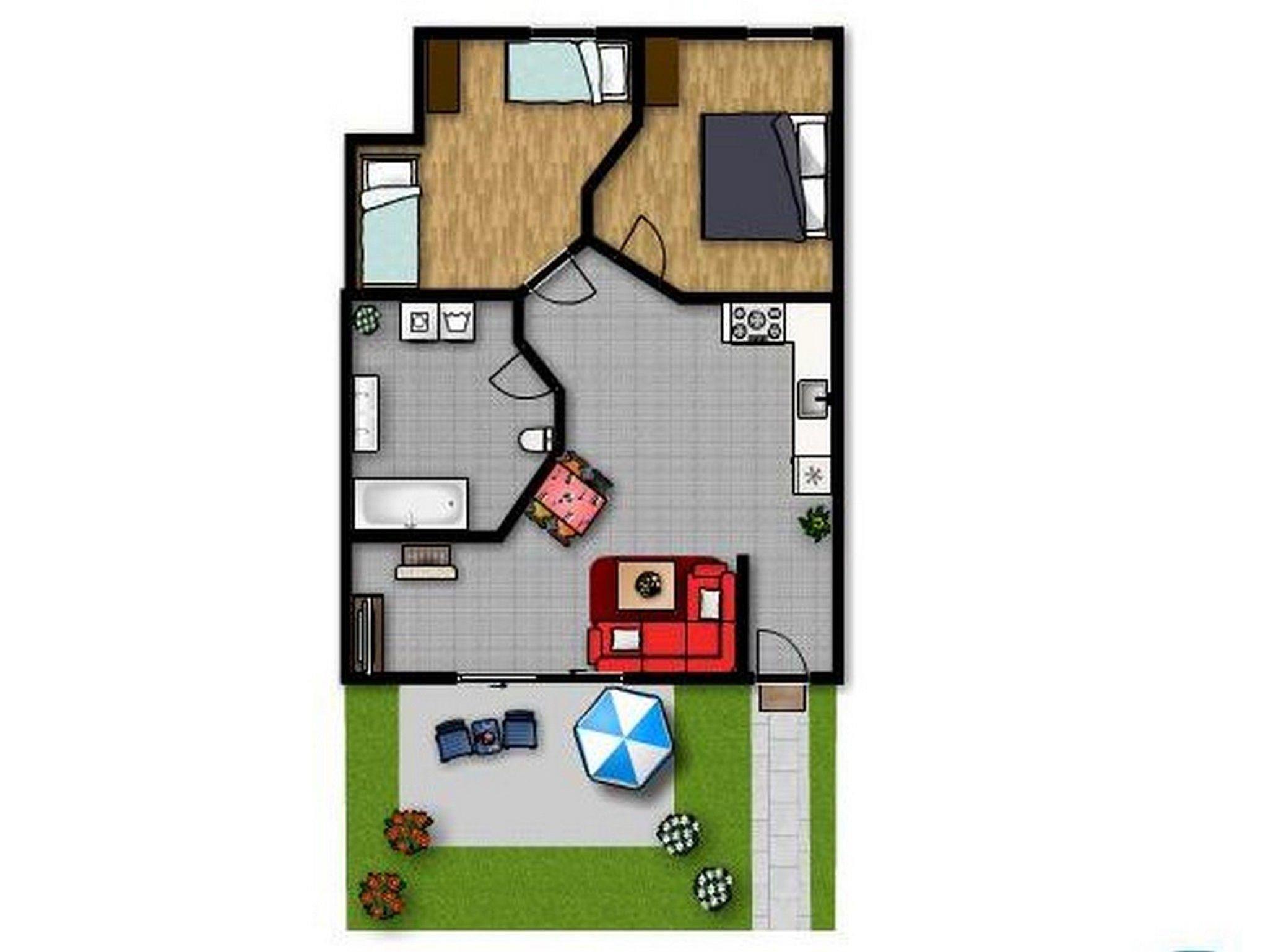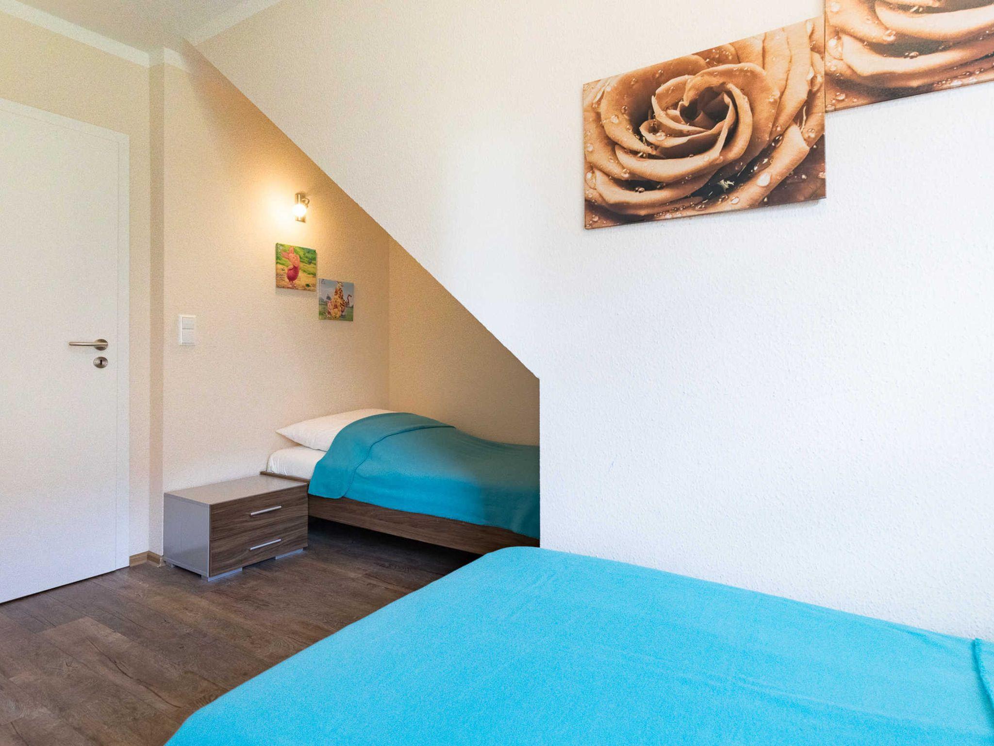 Praktisch sind auch die zwei Schlafzimmer, von denen eines mit einem gemütlichen Doppelbett und einem Kleiderschrank und das andere mit zwei Einzelbetten ausgestattet ist.