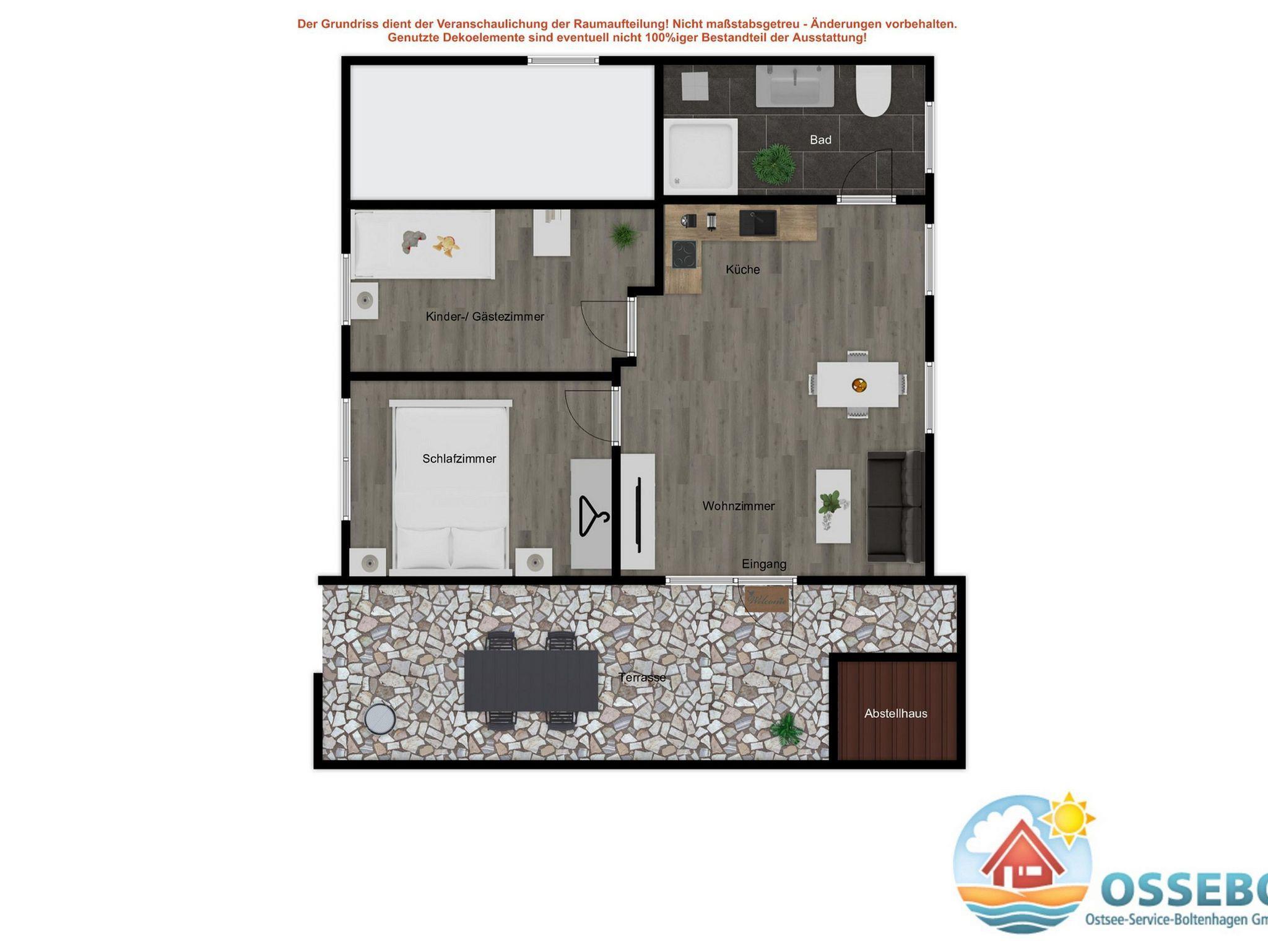 Auf der möblierten Terrasse können Sie die frische Ostseeluft genießen. Das große Rasengrundstück grenzt direkt an das Grundstück. Der Bungalow ist auch für Senioren geeignet, da er sich im Erdgeschoss befindet und einen komfortablen Zugang bietet. Der Strand ist nur 250 Meter entfernt und leicht zu Fuß erreichbar. Rauchen ist nur auf der Terrasse gestattet.