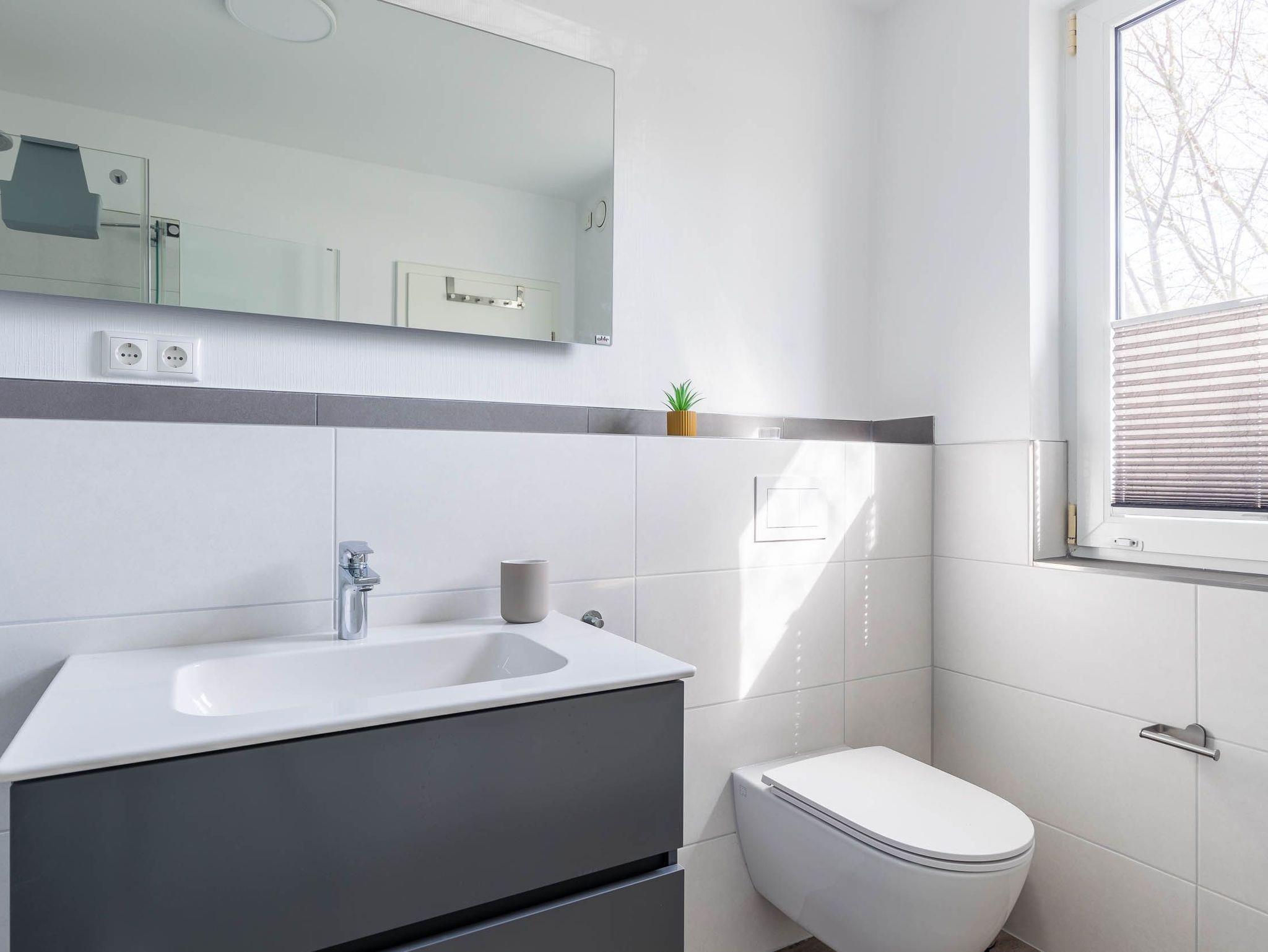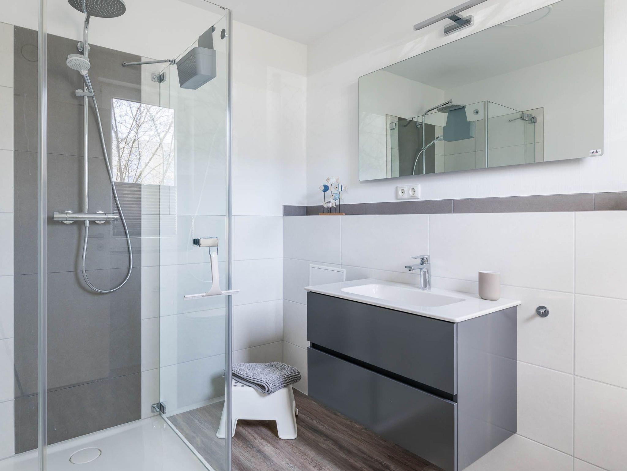 Das geflieste Badezimmer verfügt über eine bodentiefe Dusche, die nicht nur für Senioren geeignet ist. Ein kleines Fenster sorgt für Tageslicht und erleichtert das Lüften nach dem Duschen.