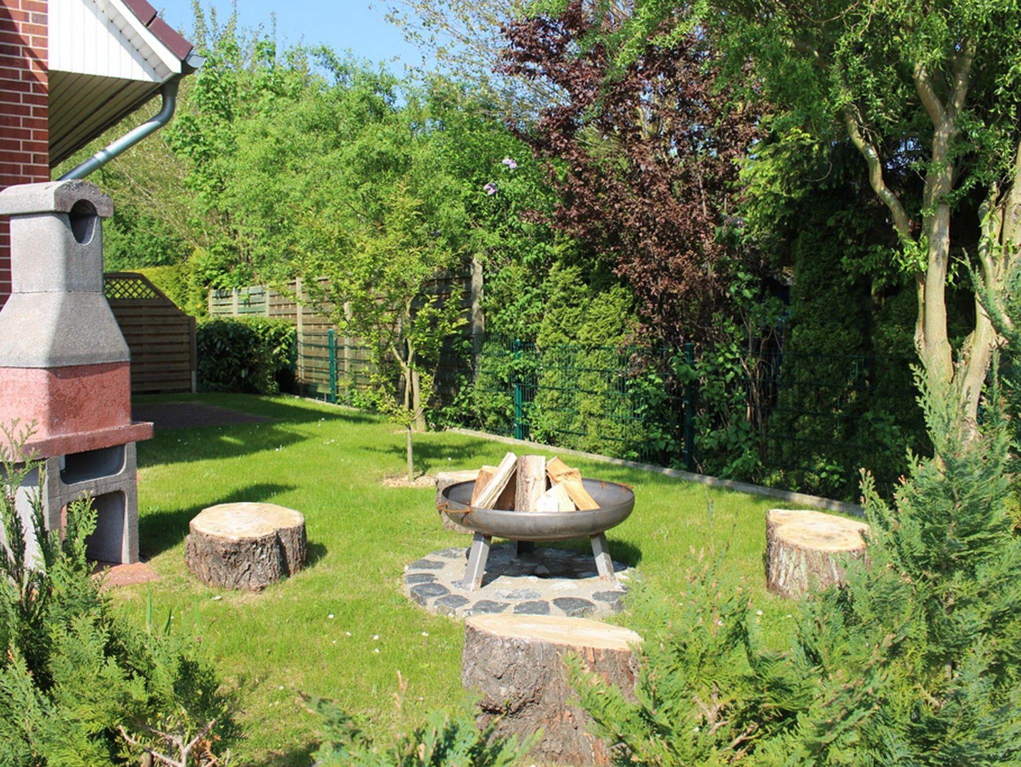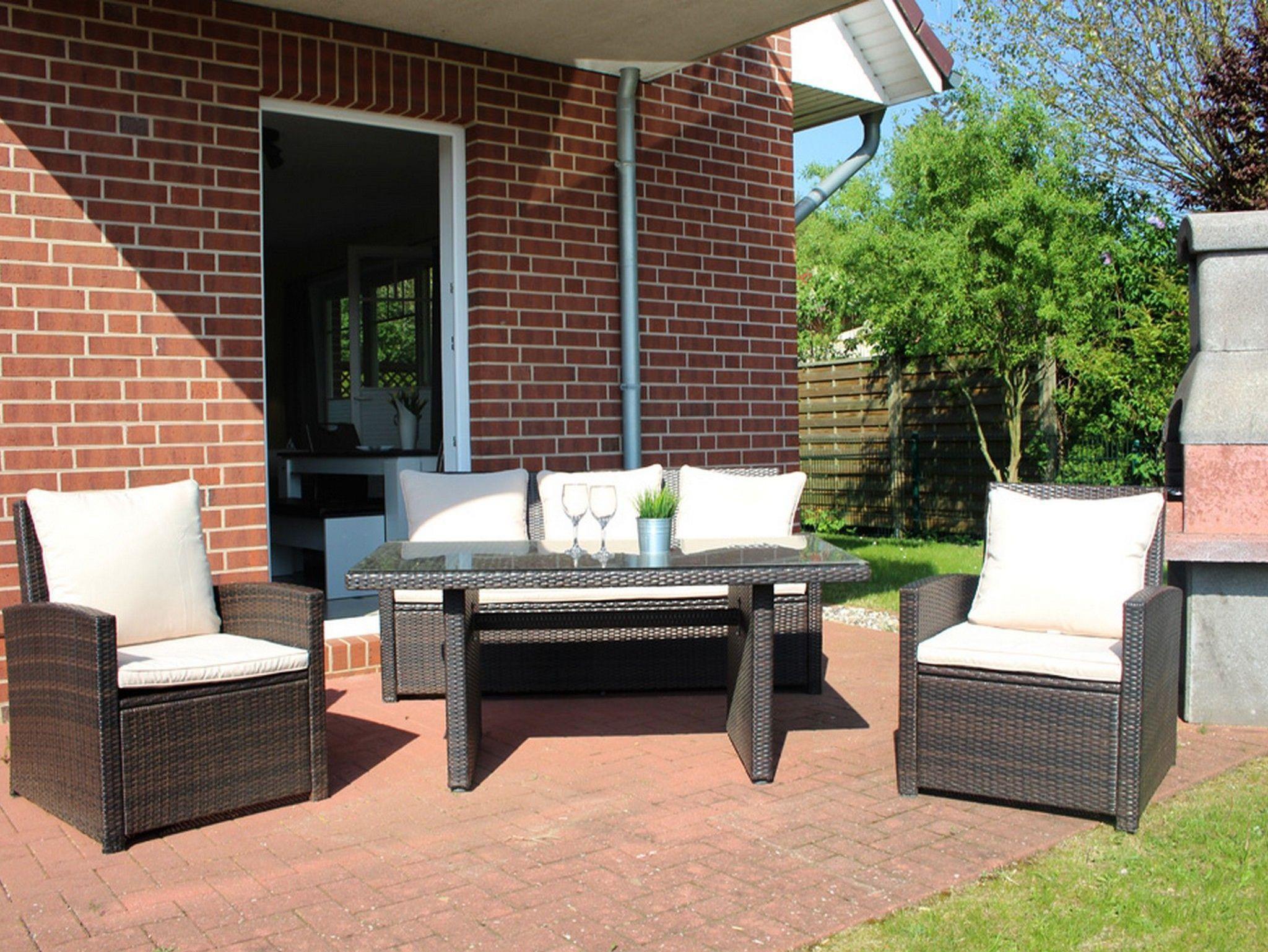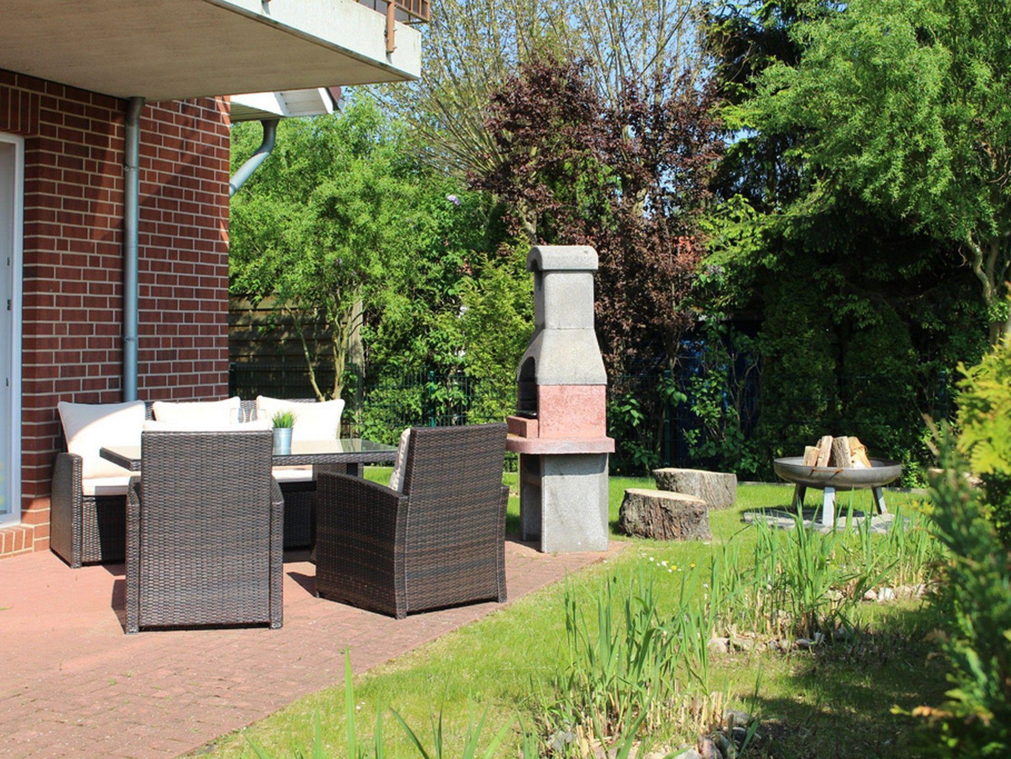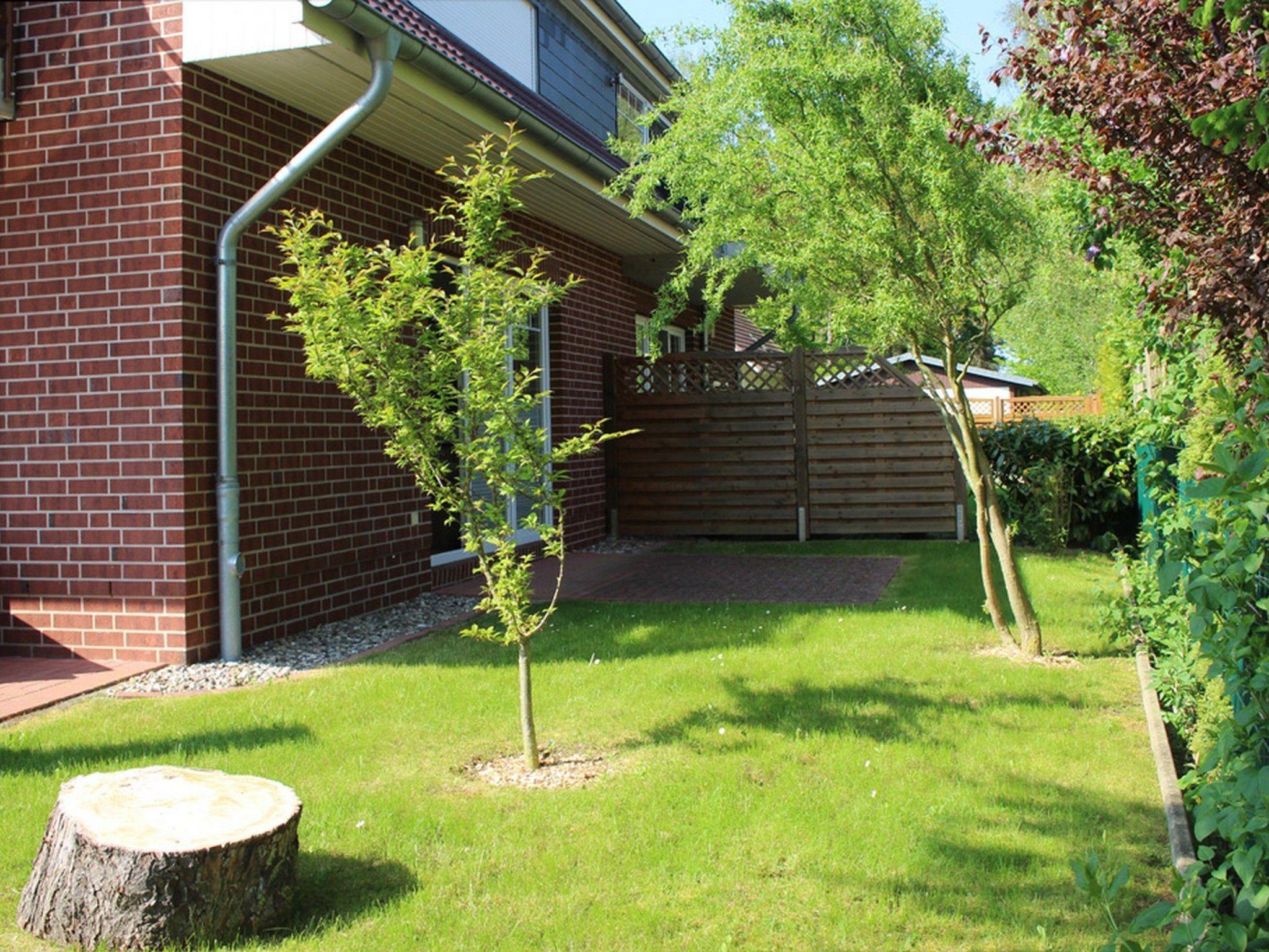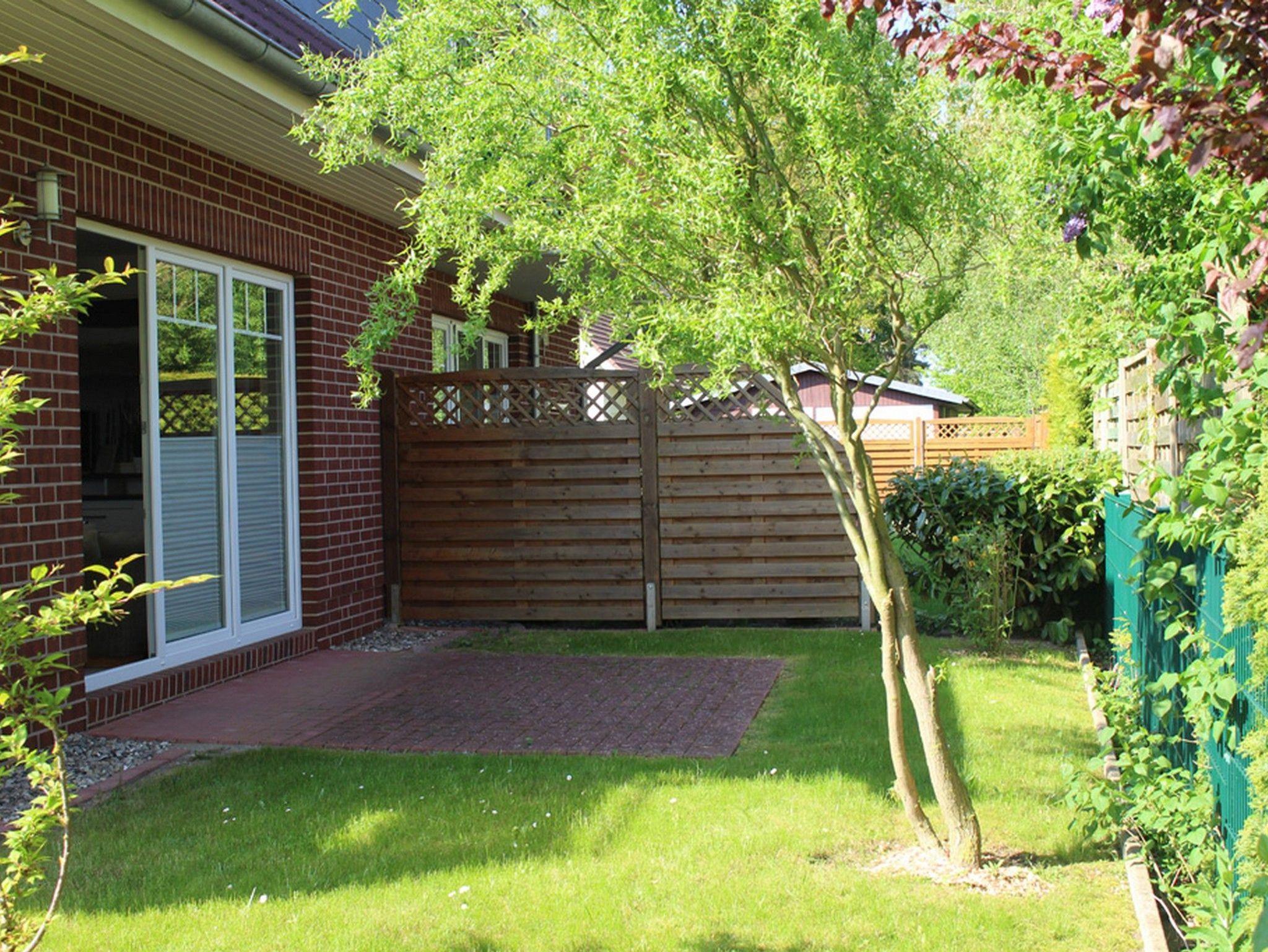 Die möblierte Süd-Terrasse lädt zu einem gemütlichen Grillabend ein. Das begrünte Grundstück ist zum Teil von Hecke umgeben und somit etwas sichtgeschützt.
