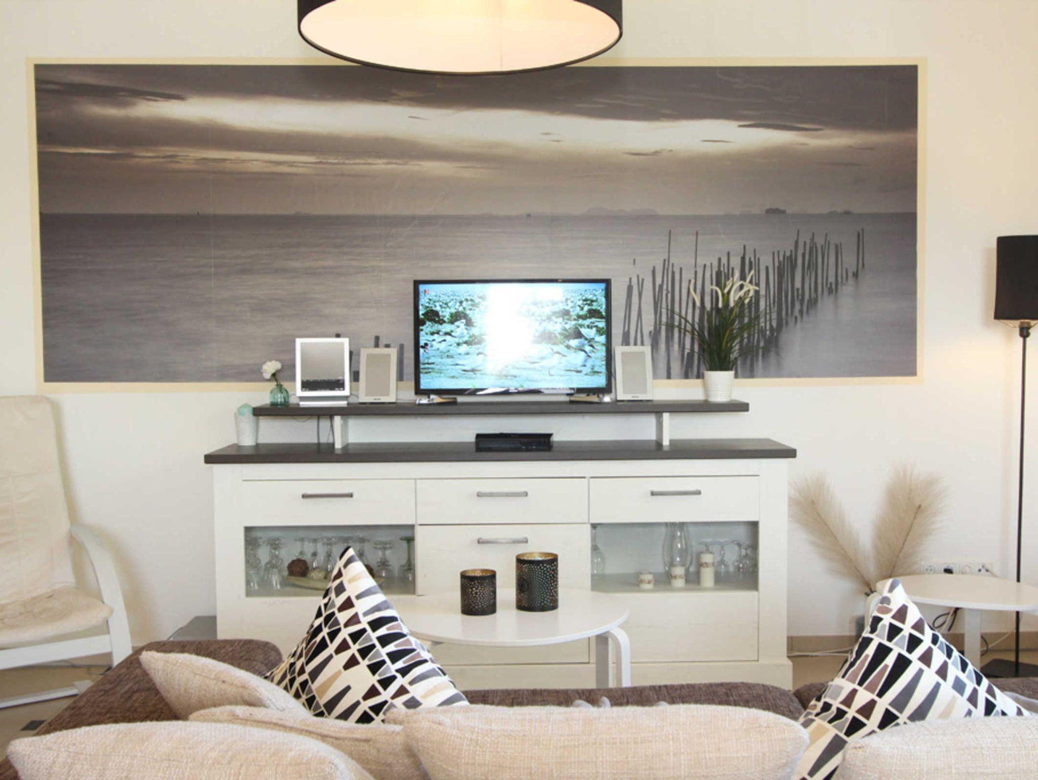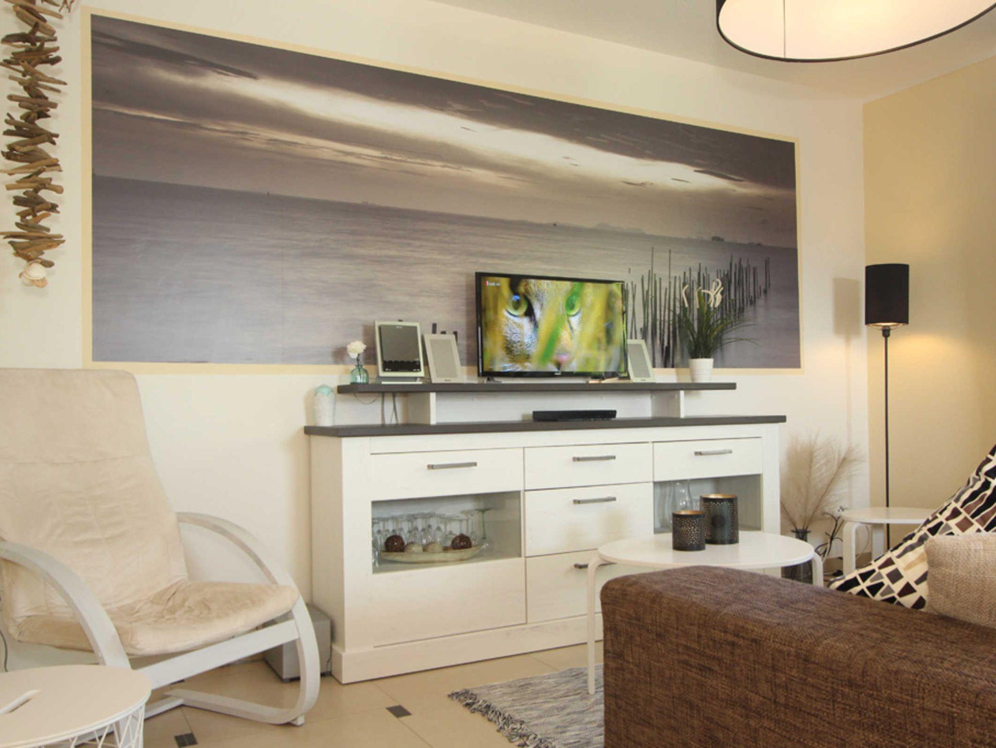 Sie verfügt über einen hellen Wohnbereich mit großem Wohlfühlsofa (Schlafmöglichkeit für die 3. Person) in schönem Design, SAT-TV (Flatscreen)/ DVD-Player und Radio mit CD-Player.