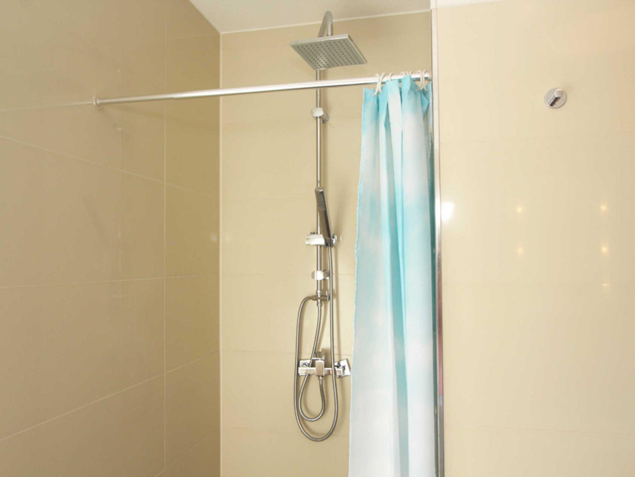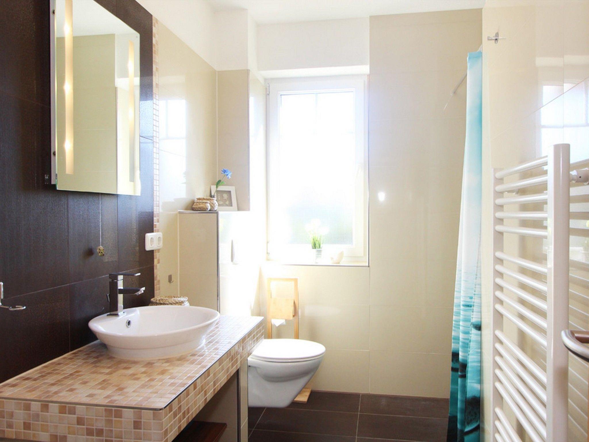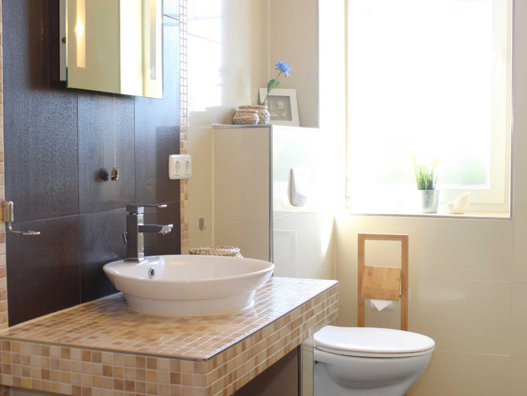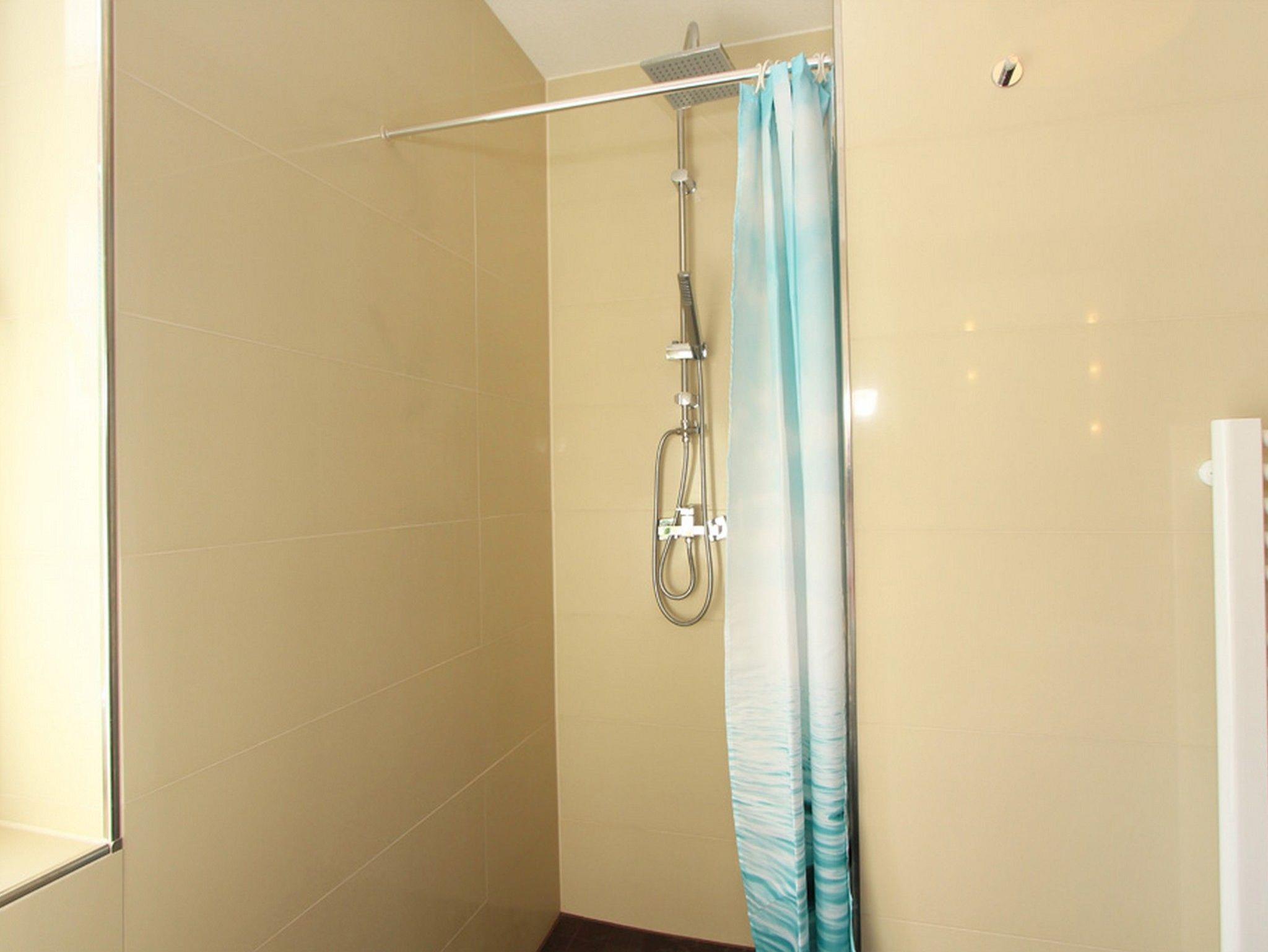 Das geflieste Bad bietet eine bodengleiche Dusche, WC, Fußbodenheizung und einen Handtuchtrockner.