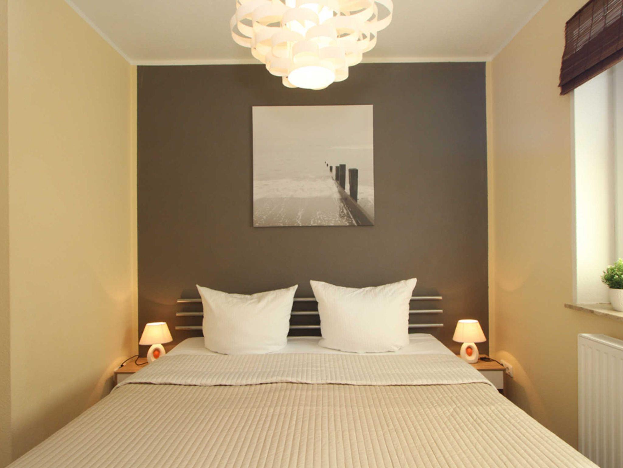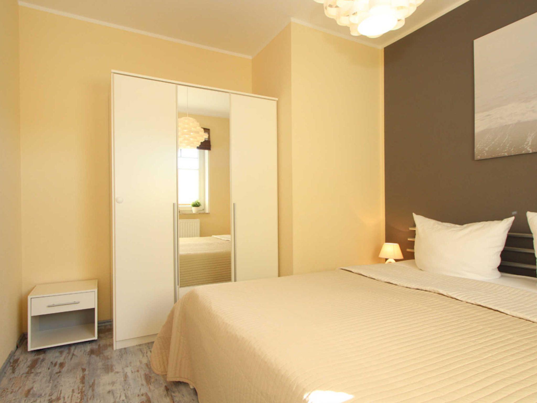 Das Schlafzimmer ist mit einem bequemen Doppelbett und geräumigem Kleiderschrank für Ihre Urlaubsgarderobe ausgestattet.