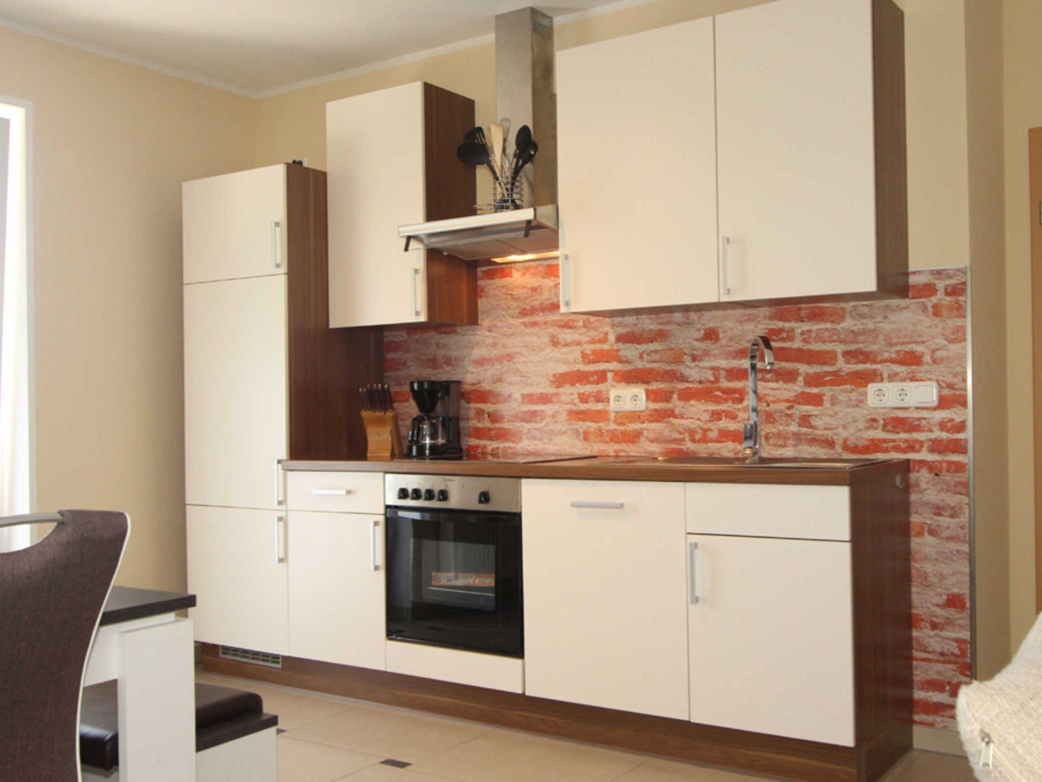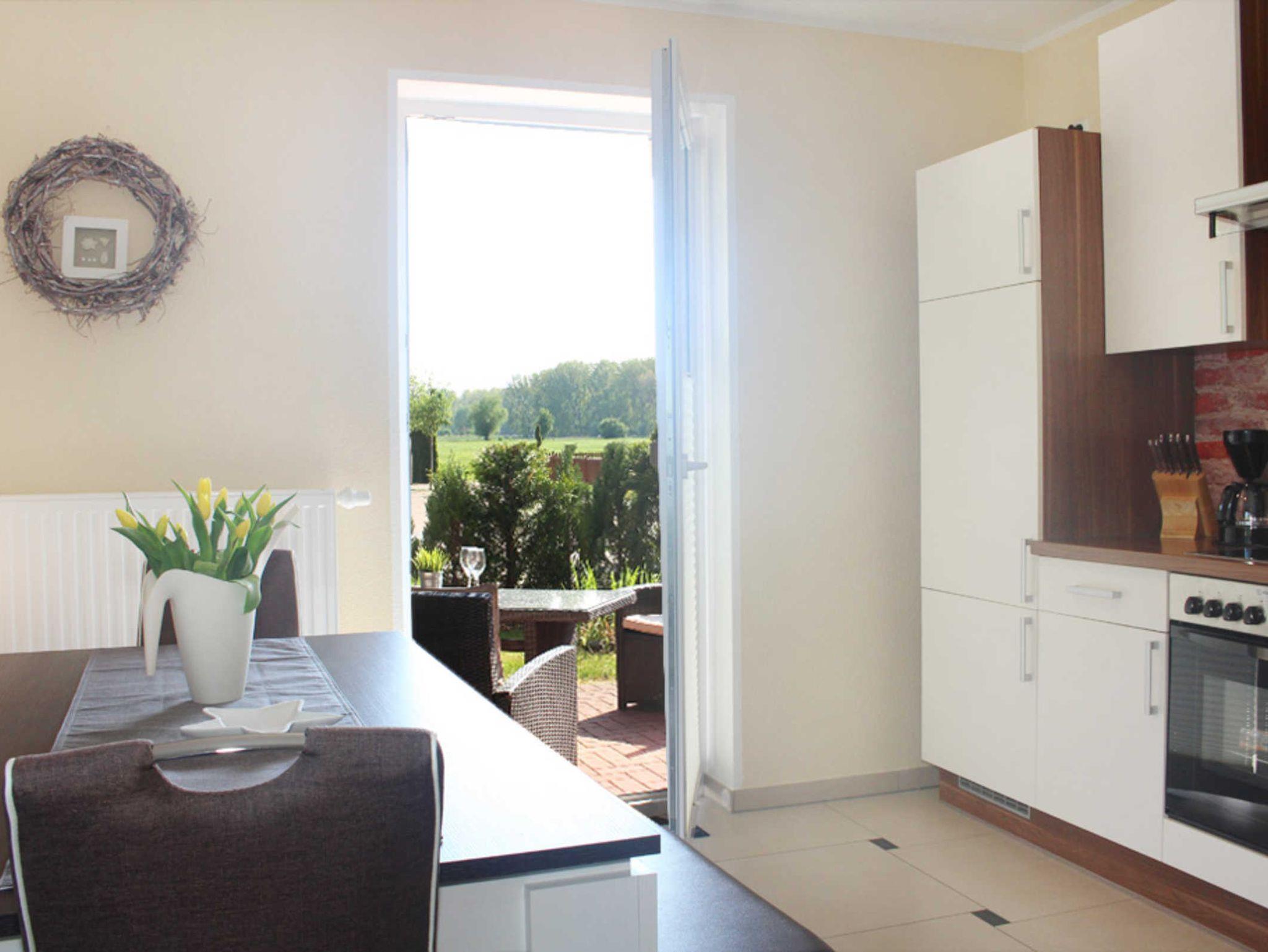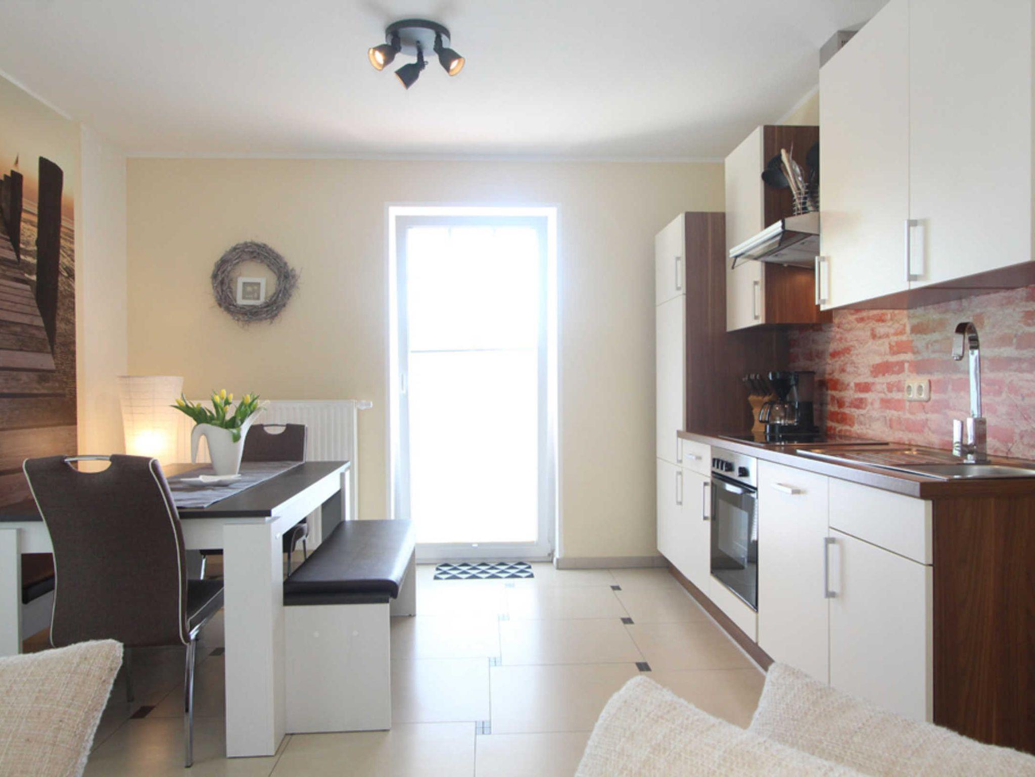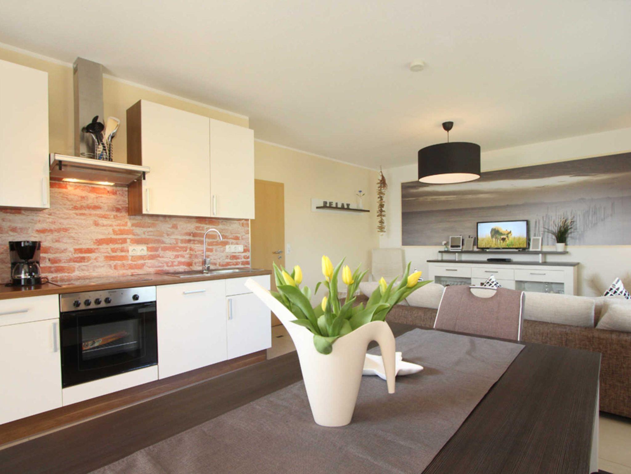 Die offene Küche bietet u.a. Backofen, Herd mit Cerankochfeld, Spülmaschine, Kaffeemaschine, Toaster, Kühlschrank mit Gefrierfach sowie eine Mikrowelle. An der gemütlichen Essecke können Sie gemeinsam Ihre Mahlzeiten einnehmen.