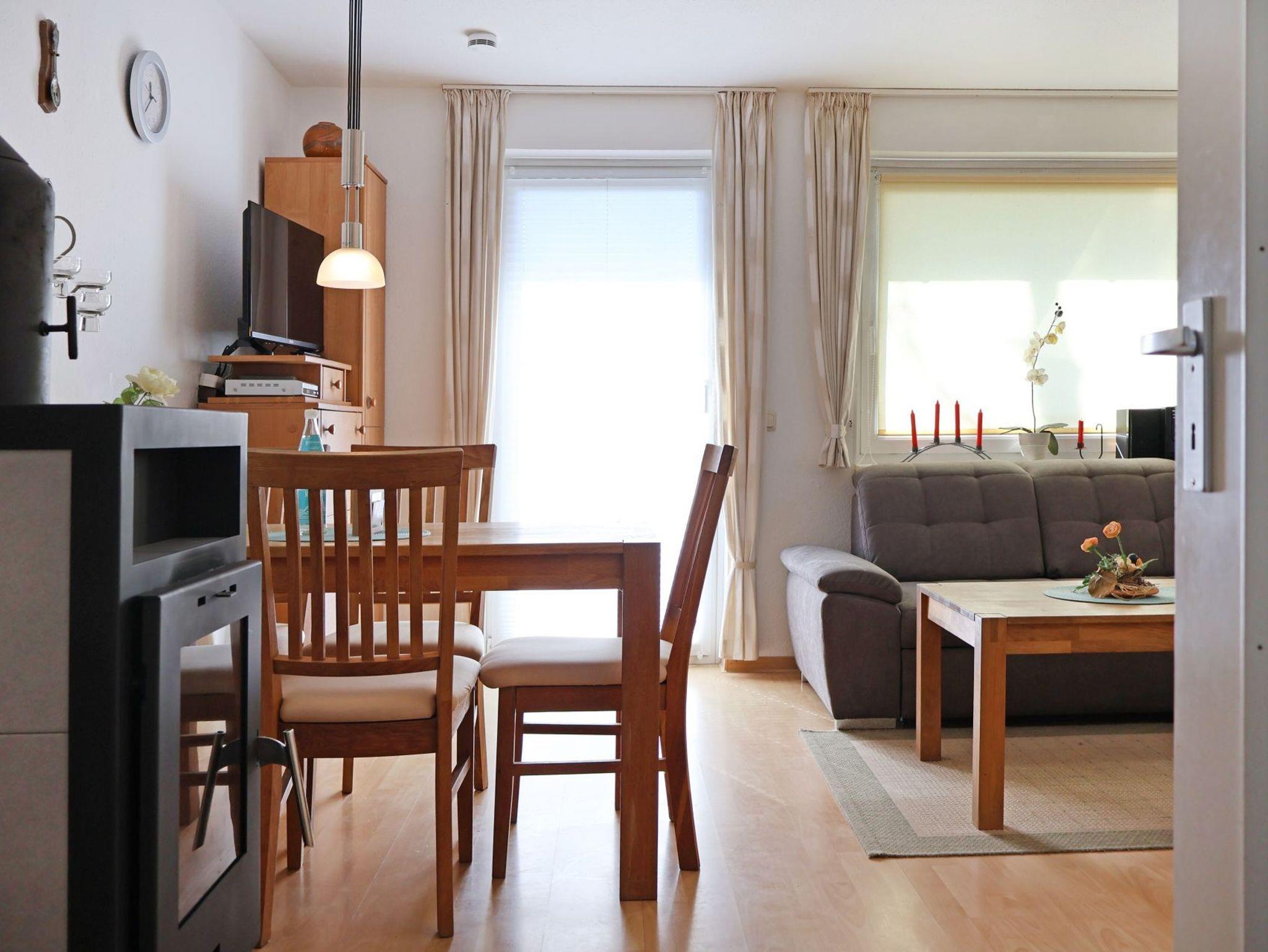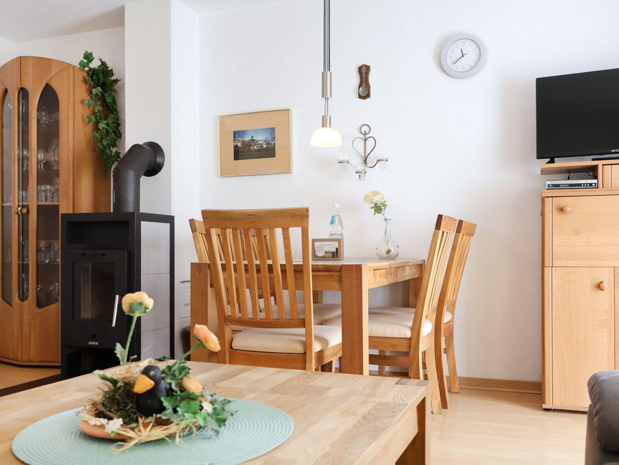 Das Ferienreihenhaus - Urlauberdorf 30D - mit Südterrasse bietet auf 60qm familienfreundliches Wohnen zum Wohlfühlen. Der gemütliche Wohn- und Essbereich ist mit einem Sofa, Kaminofen, Fernseher, Musikanlage, WLAN und einem Esstisch ausgestattet ? ideal für entspannte Stunden mit der Familie. Drei separate Schlafzimmer sowie ein Duschbad und ein Gäste-WC sorgen für Komfort und Privatsphäre. Die integrierte Küchenzeile ist voll ausgestattet mit Herd, Backofen, Geschirrspüler, Mikrowelle, Kaffeemaschine, Wasserkocher, Toaster u.v.m. Erholung finden Sie auf der saisonal möblierten Süd Terrasse. Im Erdgeschoss befinden sich ein Schlafzimmer mit zwei Einzelbetten und Kleiderschrank sowie ein Tageslicht Duschbad mit WC und kostenfreier Waschmaschinen Nutzung. Über eine Treppe gelangen Sie ins Obergeschoss mit zwei weiteren Schlafzimmern. Eines mit Doppelbett, Kleiderschrank, 2. Fernseher. Dieses zweite Schlafzimmer ist ein Durchgangszimmer zum 3. Schlafzimmer mit Einzelbett. Zudem ist ein Gäste-WC vorhanden. Ein Kinderhochstuhl steht bereit.