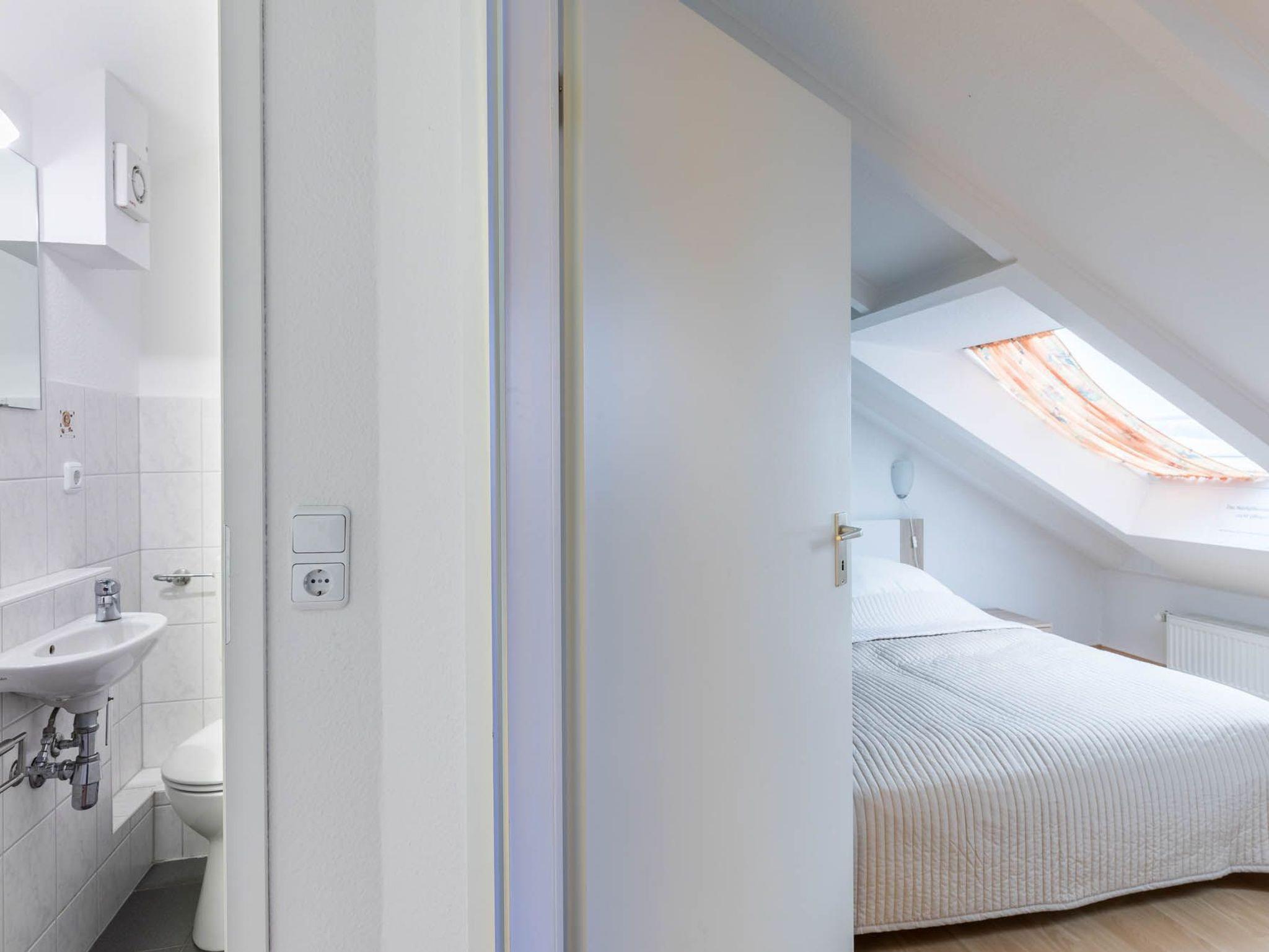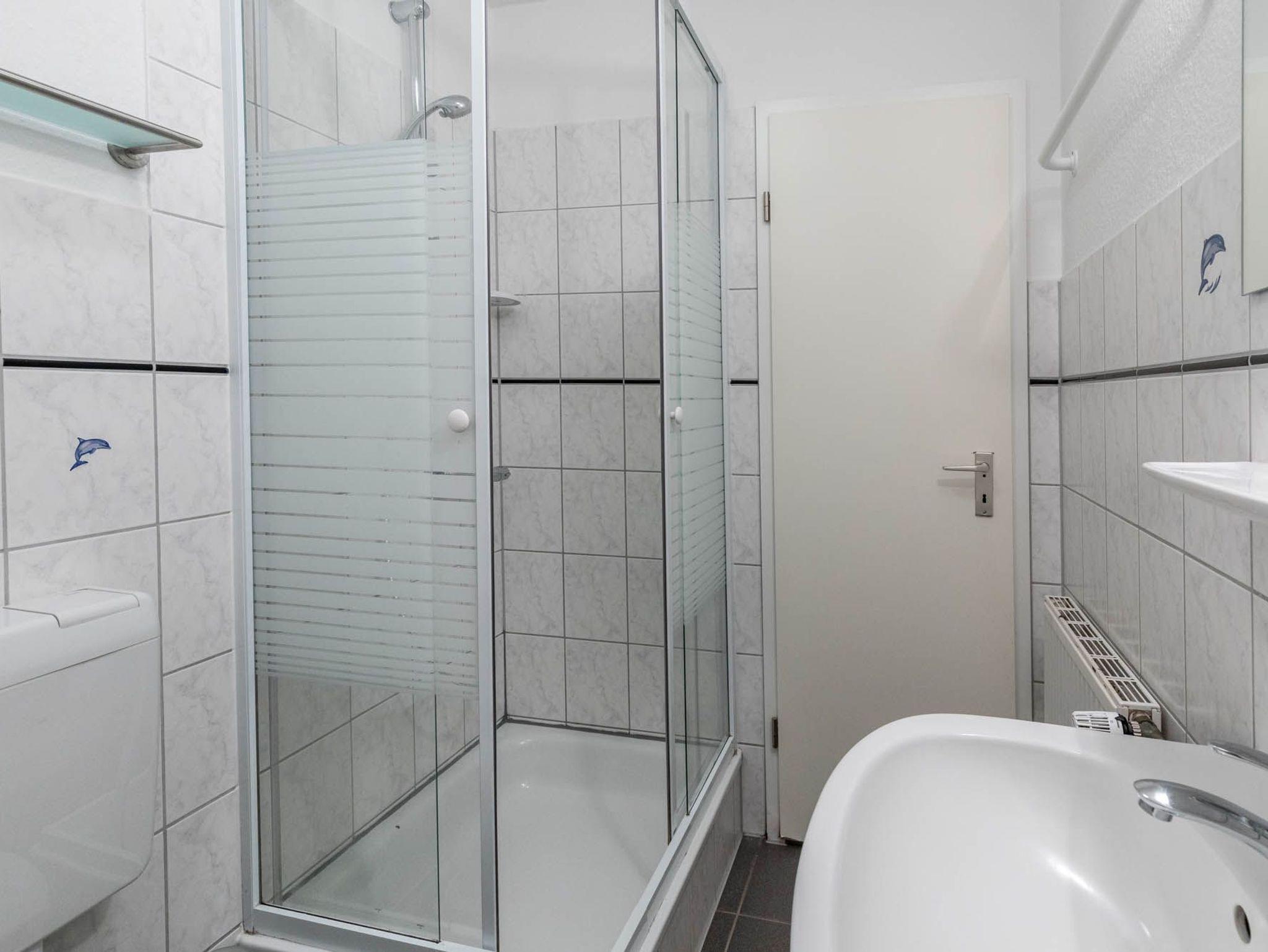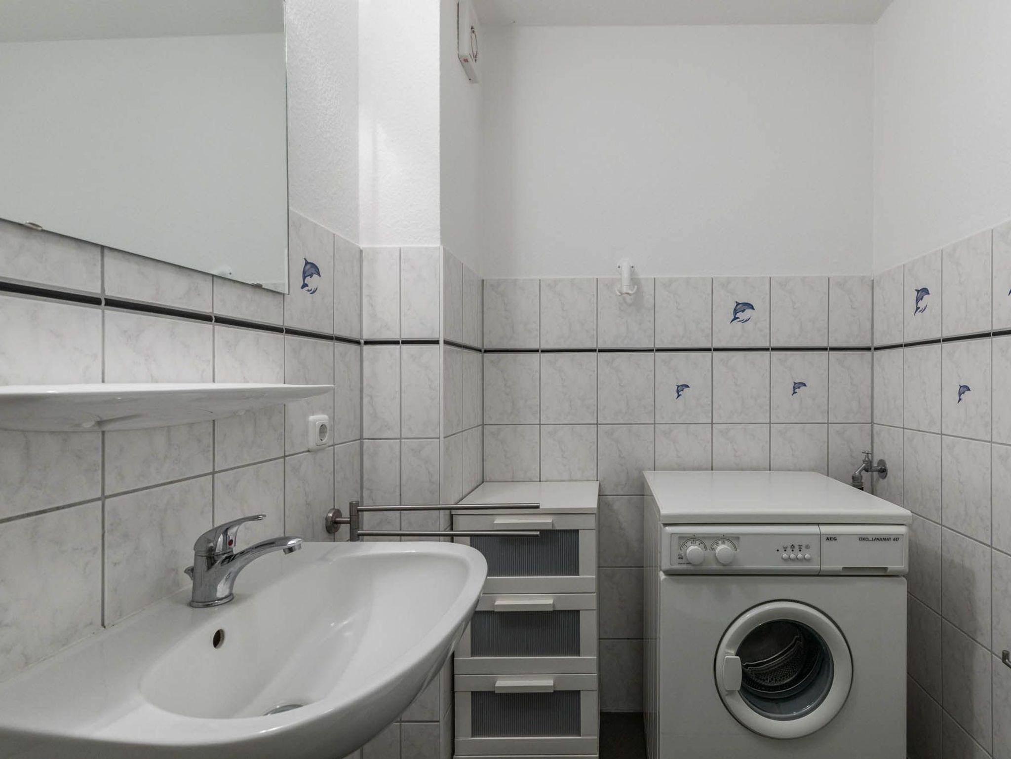 Das Badezimmer auf selbiger Etage ist mit Dusche und WC ausgestattet, auch eine Waschmaschine ist hier installiert und kann kostenfrei genutzt werden.