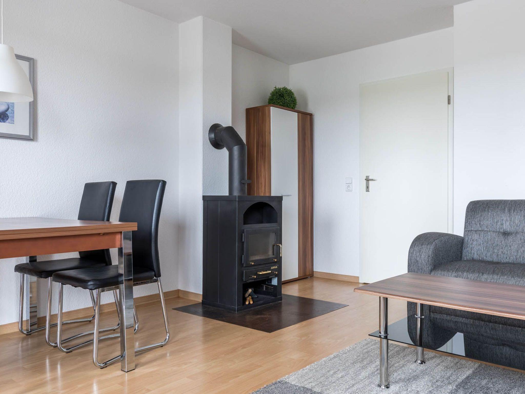 Vom gut ausgestatteten Wohnzimmer mit Kamin im Erdgeschoss gelangen Sie direkt auf die Süd-Terrasse mit Gartenmöbeln. Der schöne Blick auf ein Feld lässt Sie Ihren Ostseeurlaub genießen.