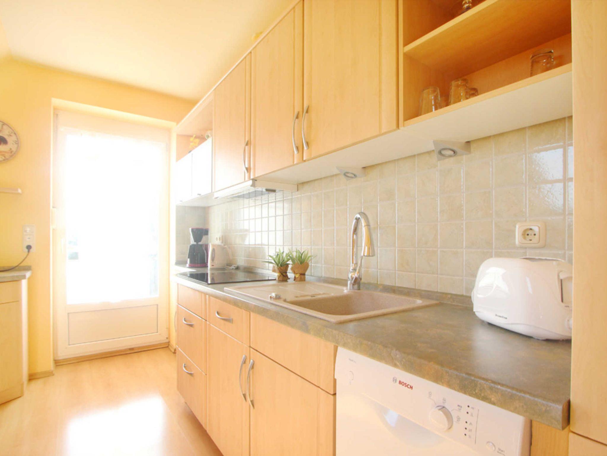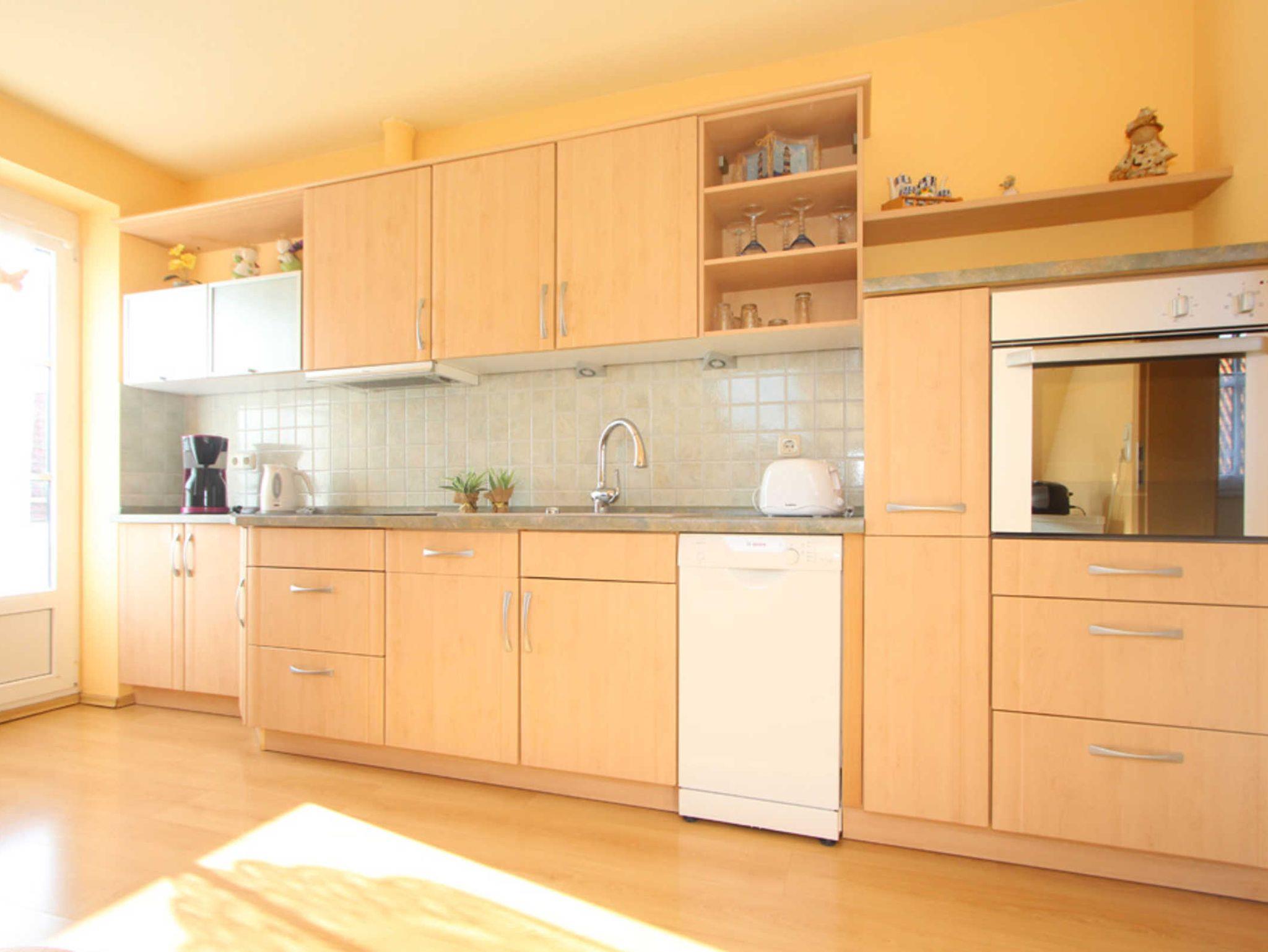 In der offenen Wohnküche steht jeglicher technischer Komfort bereit: Geschirrspüler, Mikrowelle, Kühlschrank mit Gefrierfach, Kaffeemaschine, Herd bzw. Backofen. Sie beinhaltet ebenfalls einen einladenden Essbereich.
