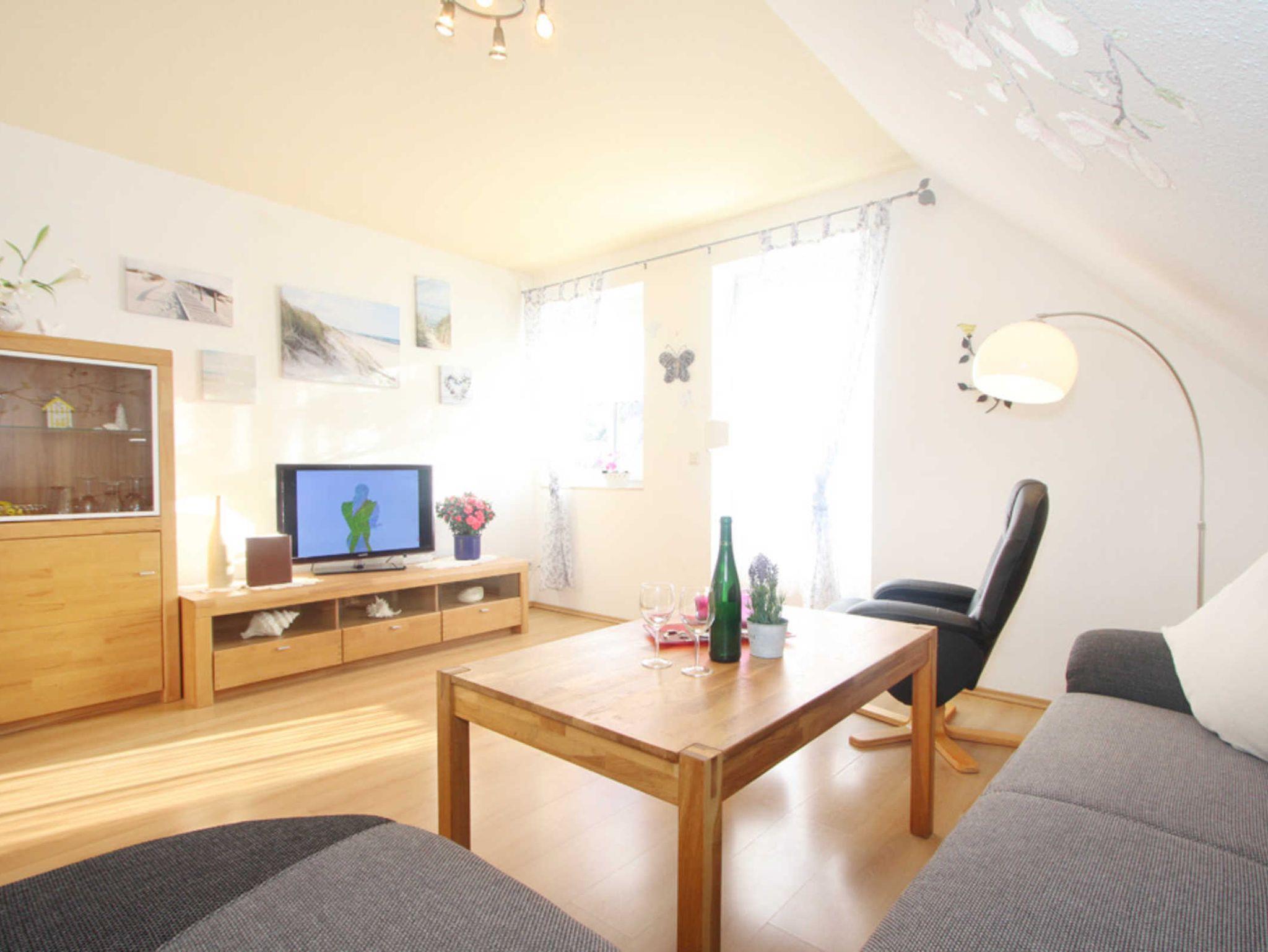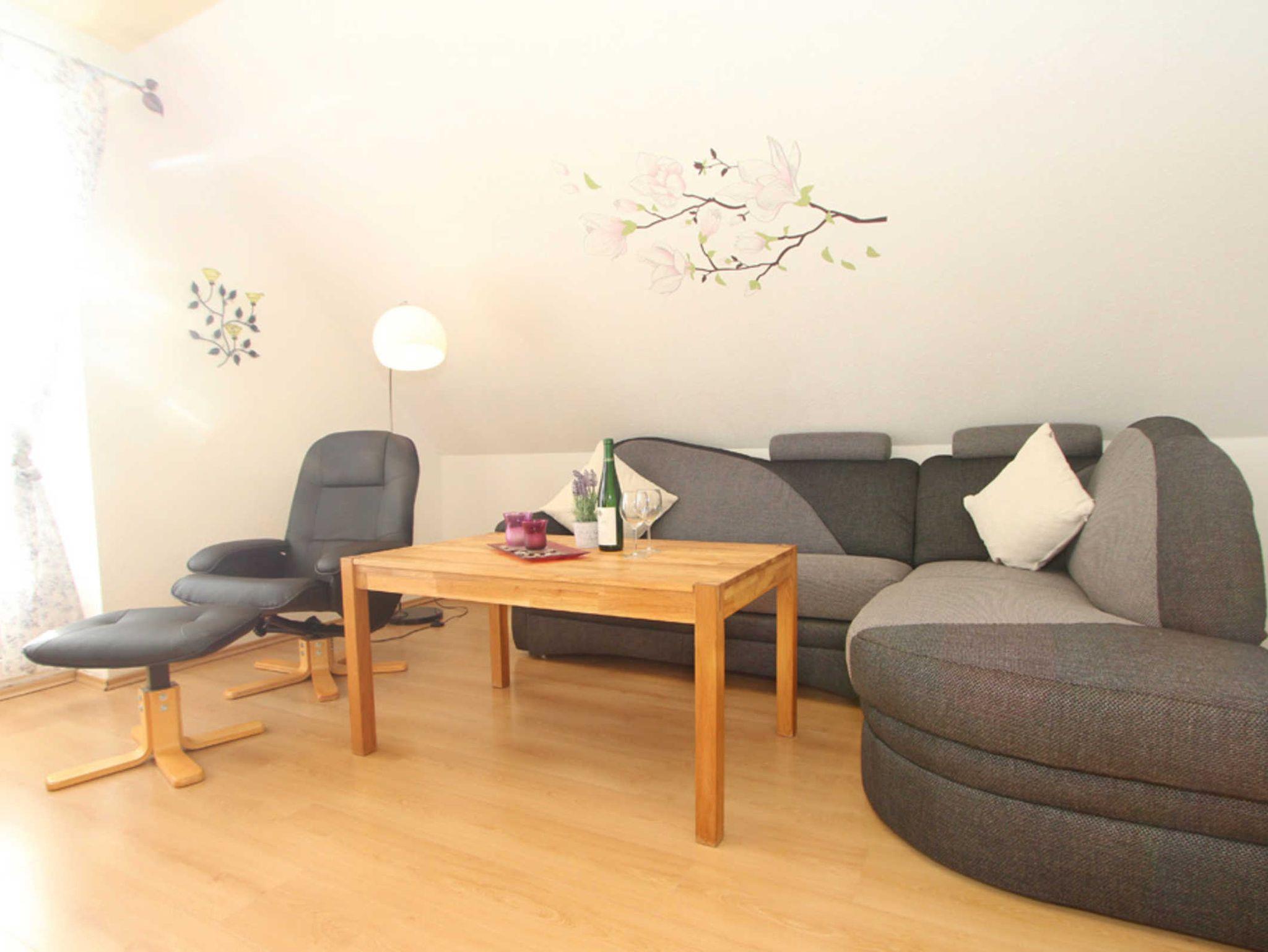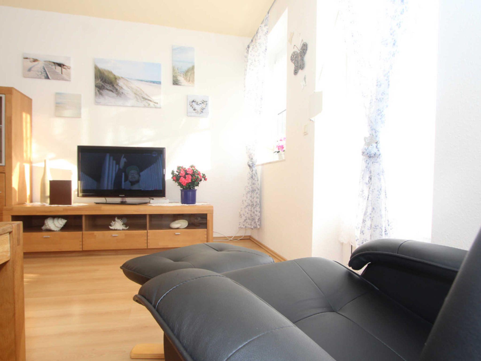 Im Wohnzimmer finden Sie eine gemütliche Sofaecke und Flatscreen-TV (Sat). An den Wohnbereich schließt sich ein möblierter Südbalkon an.