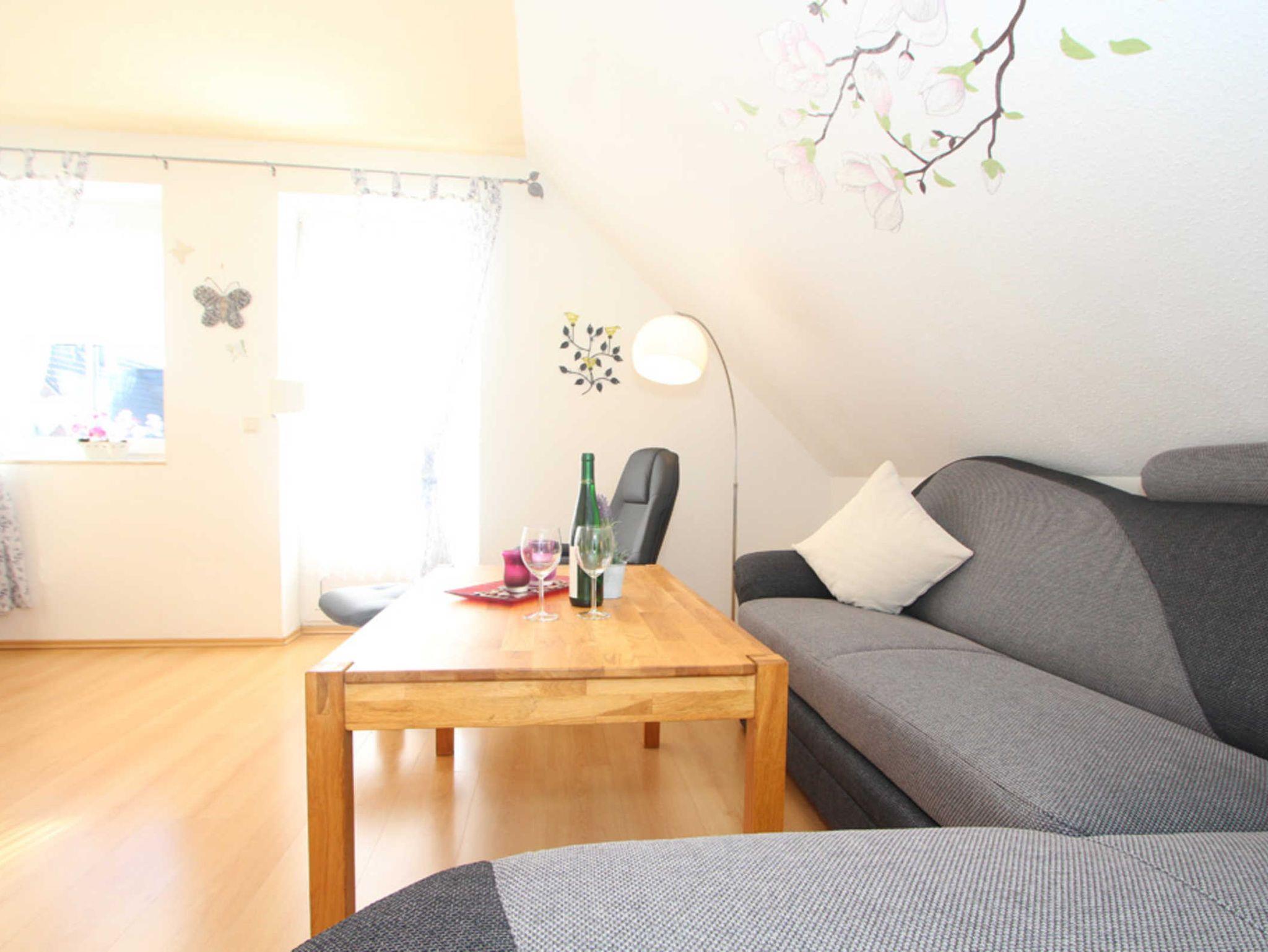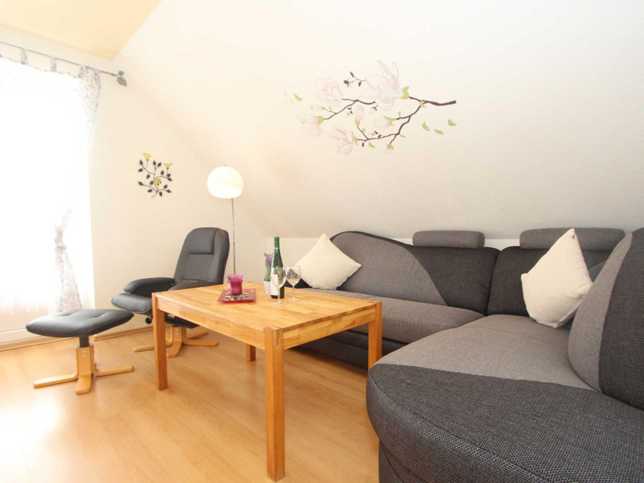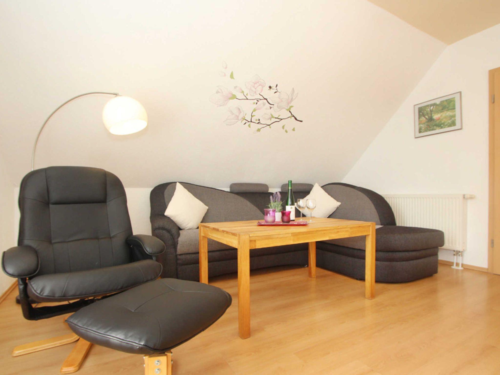 Im Wohnzimmer finden Sie eine gemütliche Sofaecke und Flatscreen-TV (Sat). An den Wohnbereich schließt sich ein möblierter Südbalkon an.