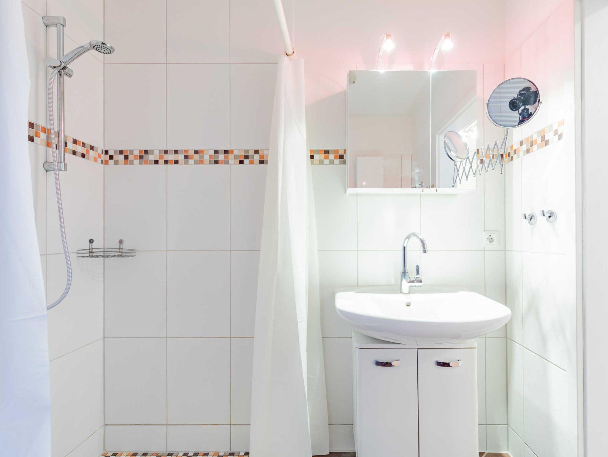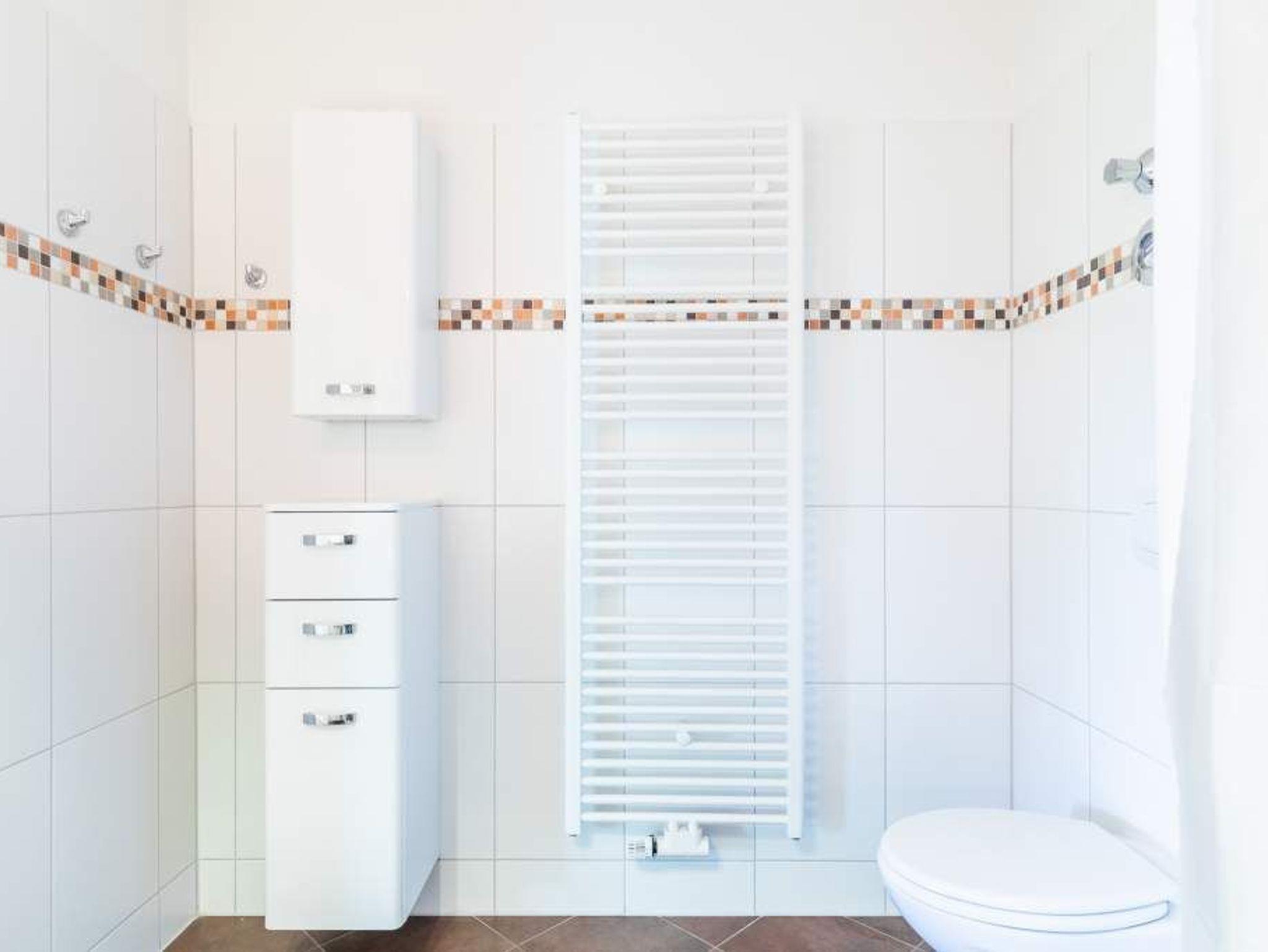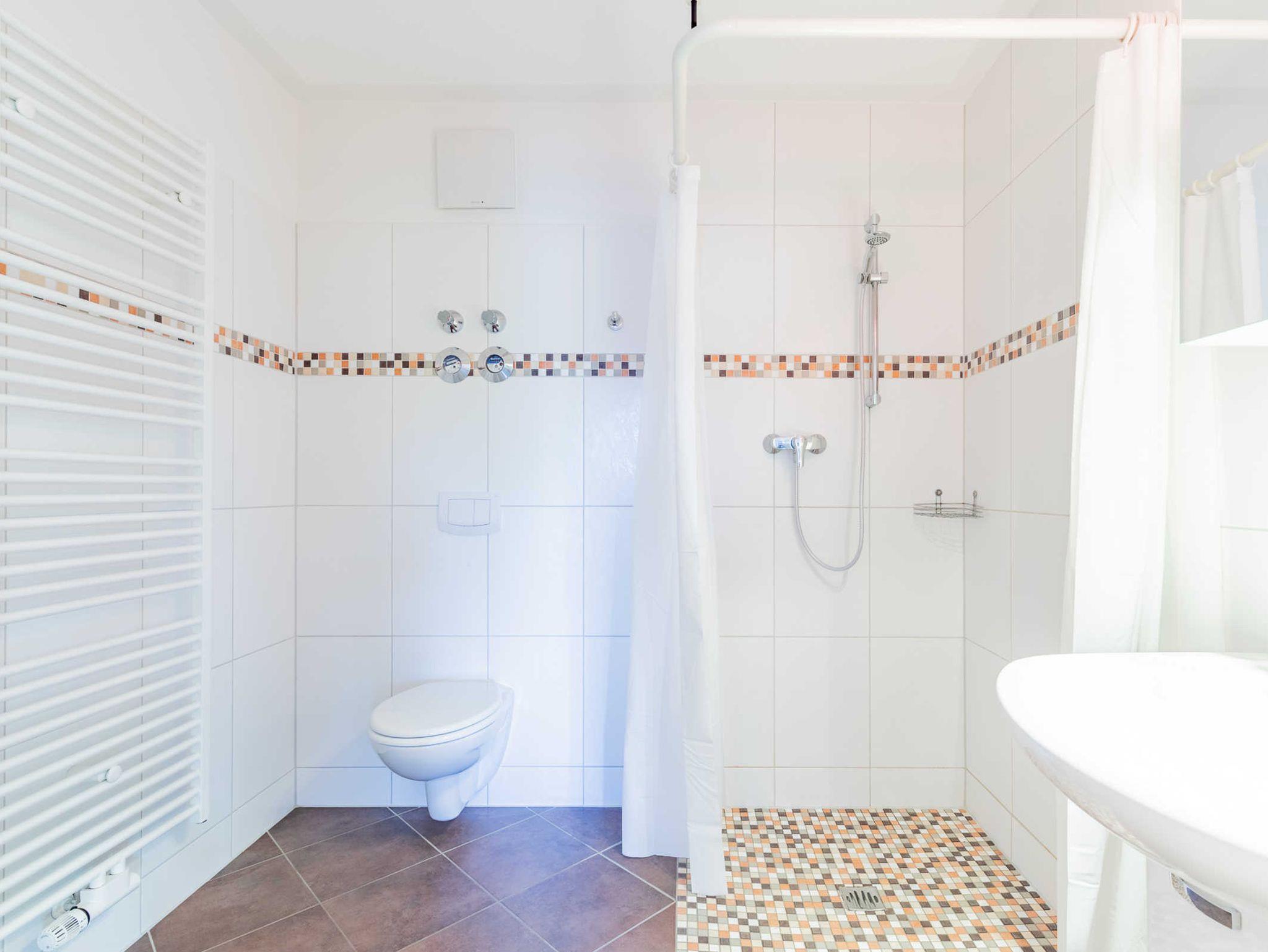 Das Bad ist mit einer barrierefreien Dusche und WC ausgestattet. Eine große Handtuchheizung sorgt für wohlige Wärme.