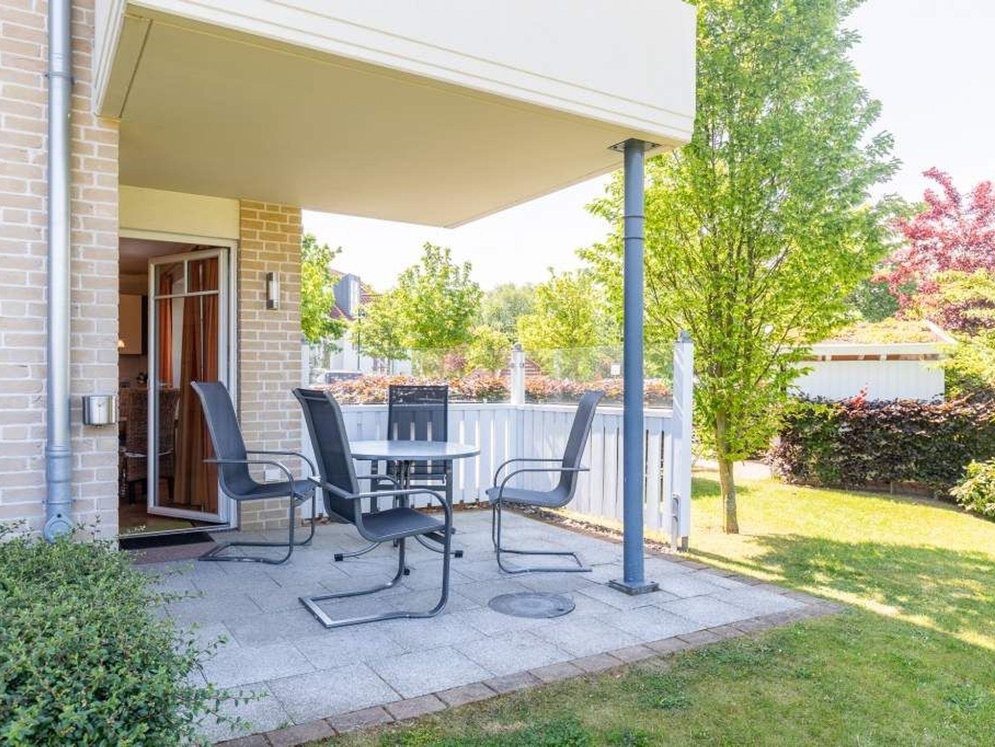 Vom Wohnzimmer aus begehen Sie die möblierte Nordwest-Terrasse mit Blick ins Grüne.