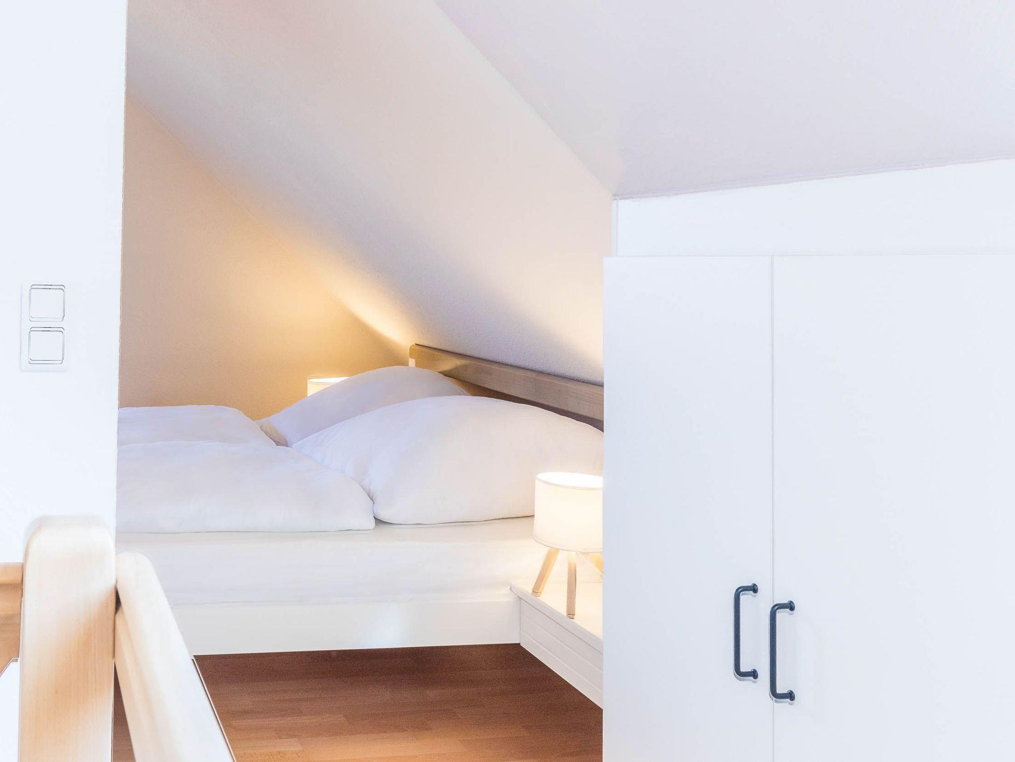 Die offene Galerie in der zweiten Wohnebene, im DG ist mit einem weiteren Doppelbett ( 180x200 ) sowie einer Kommode für die Ablage ausgestattet. Hier wäre auch Platz für ein Kinderreisebettchen.