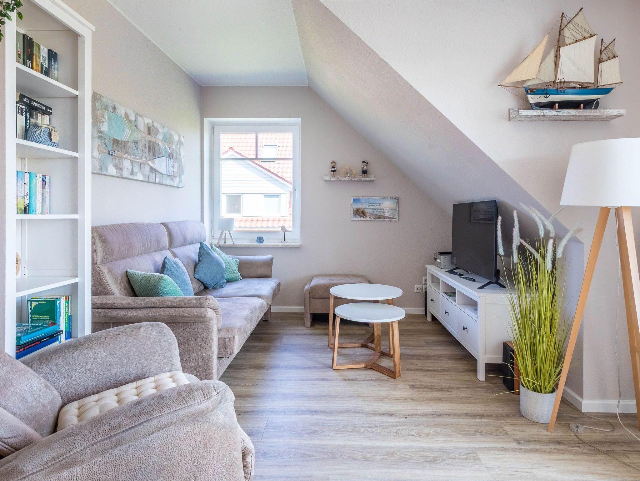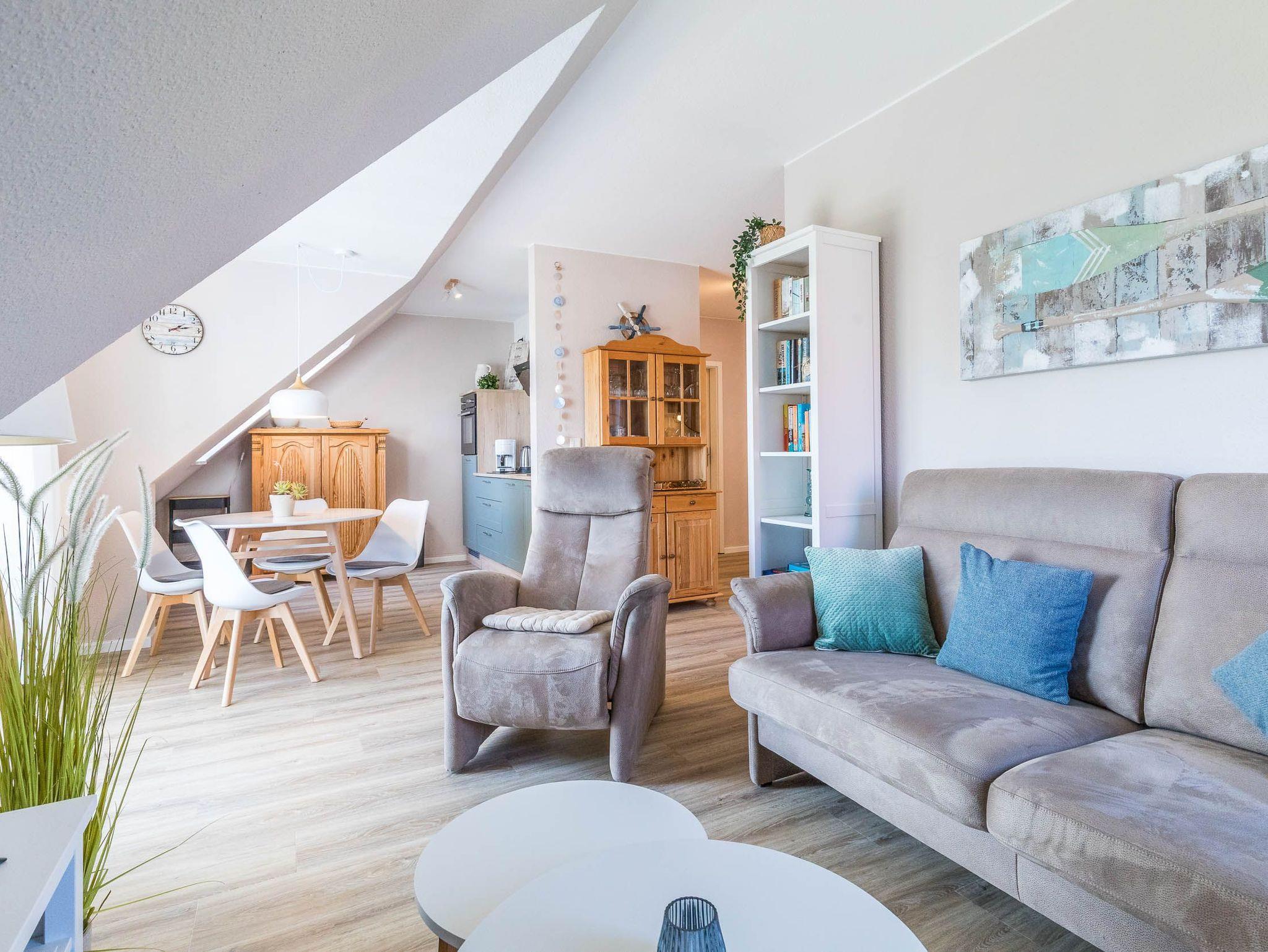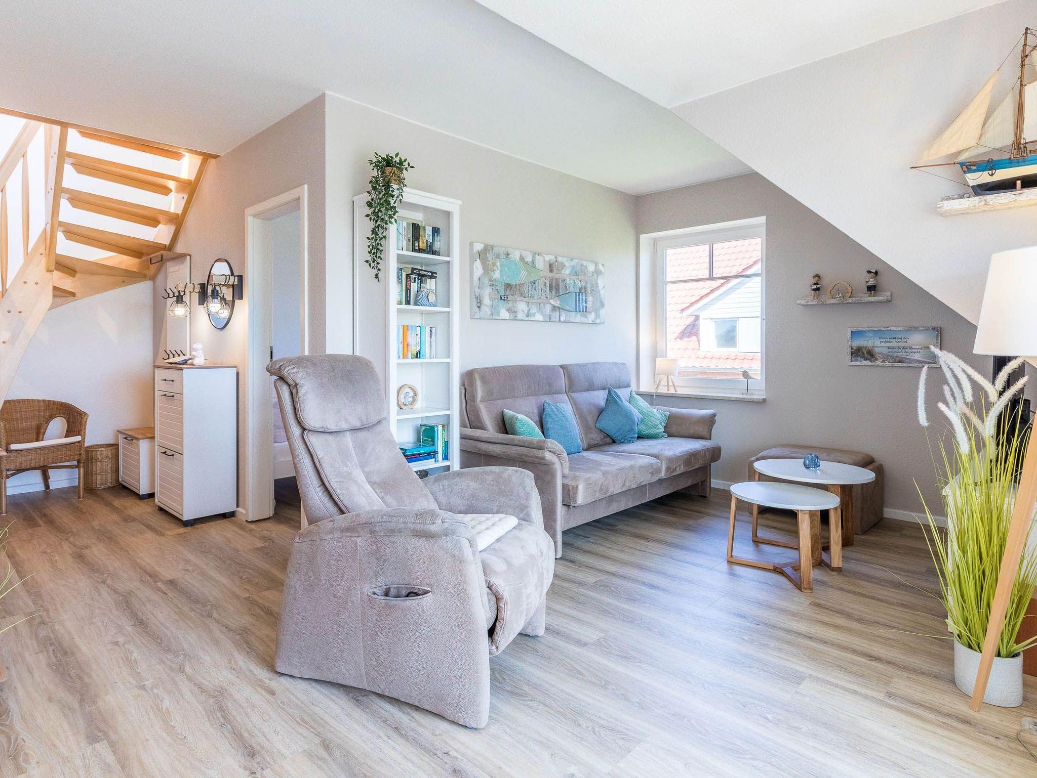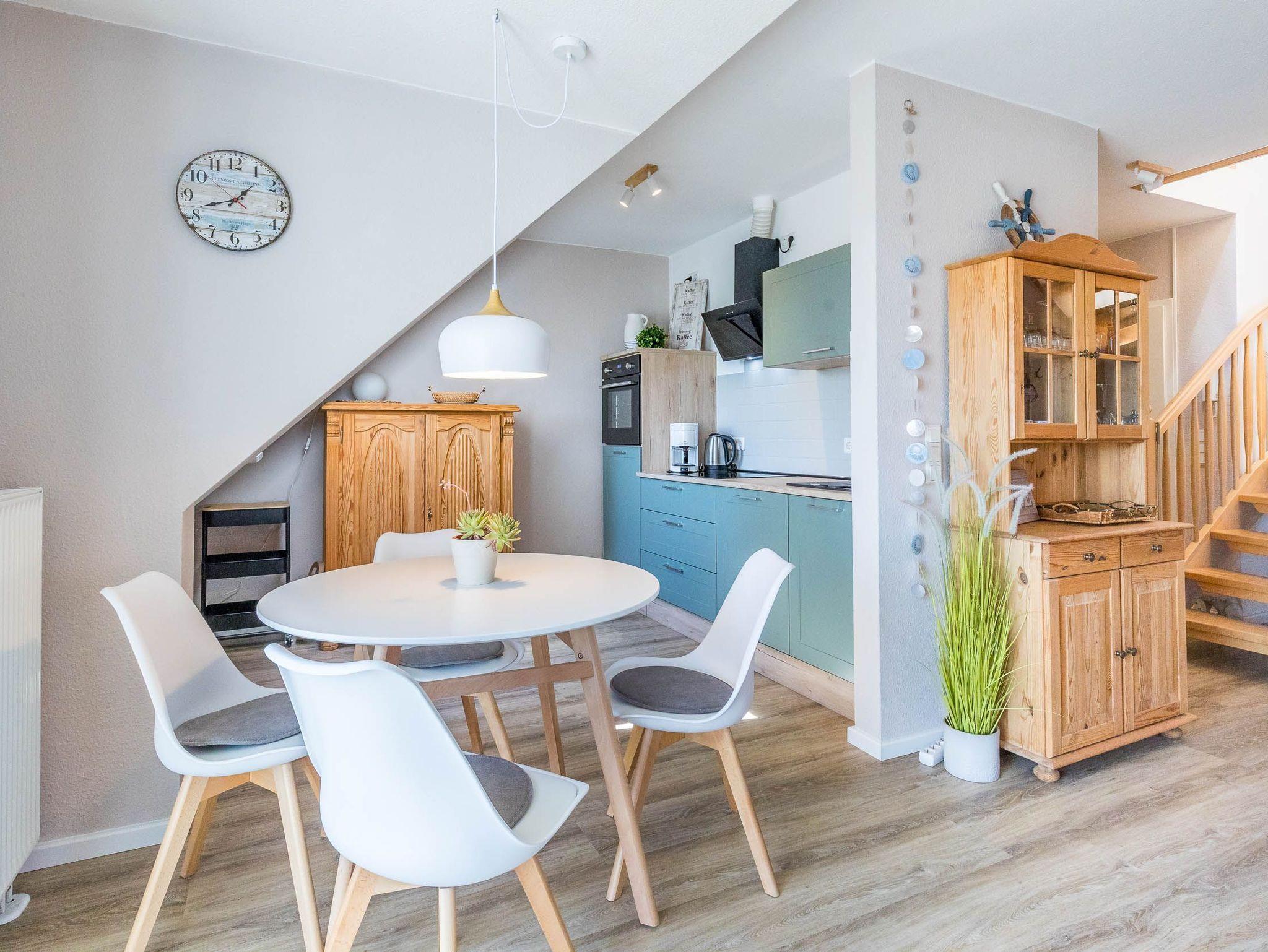 Diese geschmackvoll eingerichtete Wohnung begrüßt Sie in der unteren Wohnebene mit einem Wohnbereich mit maritimen Flair. So finden Sie Sie hier eine farblich abgestimmte Couchgarnitur mit SAT-TV auf der einen Seite des Raumes, während auf der anderen Seite eine sehr gut ausgestattete Wohnküche mit gemütlicher Essecke auf Sie wartet.