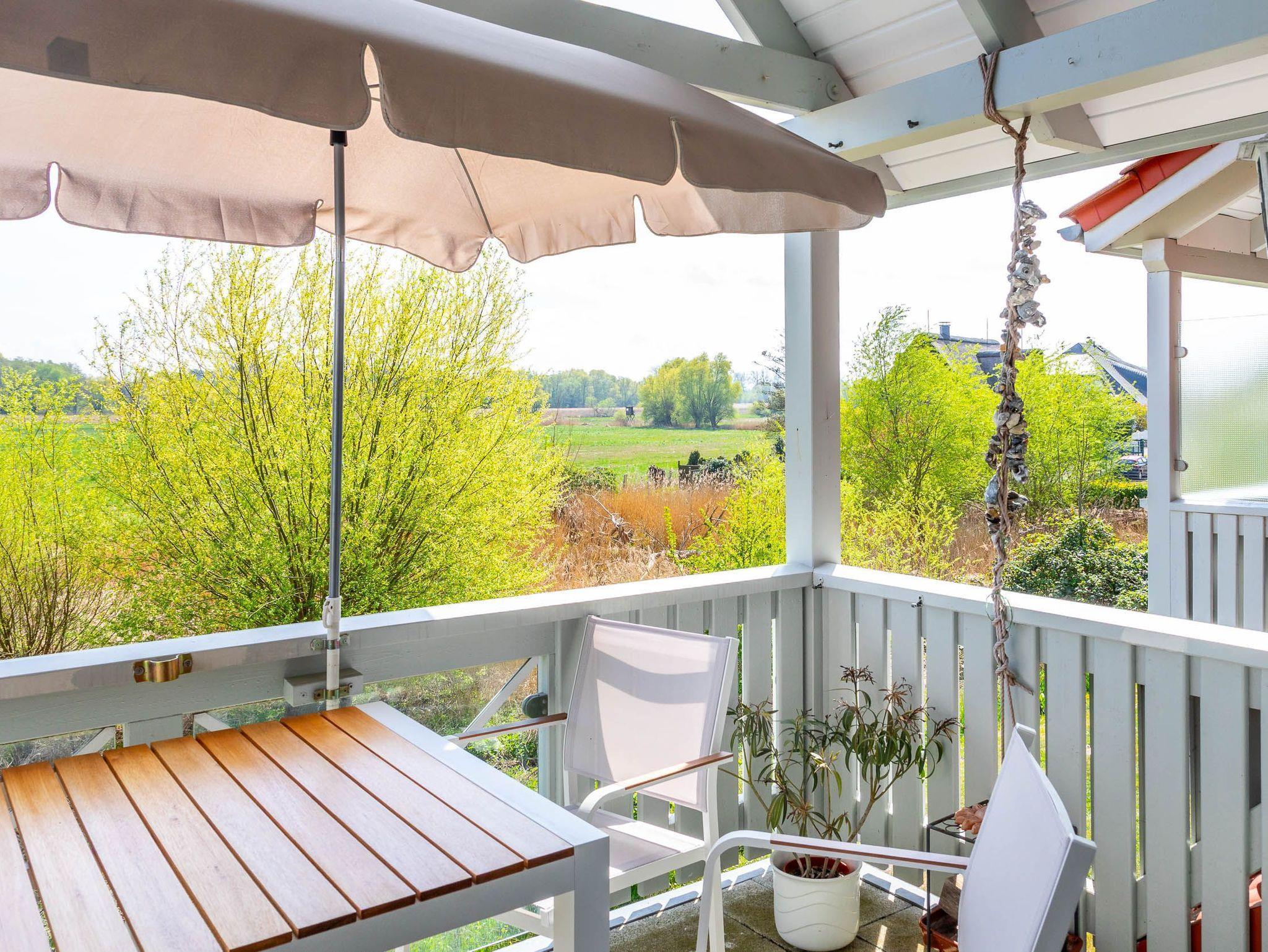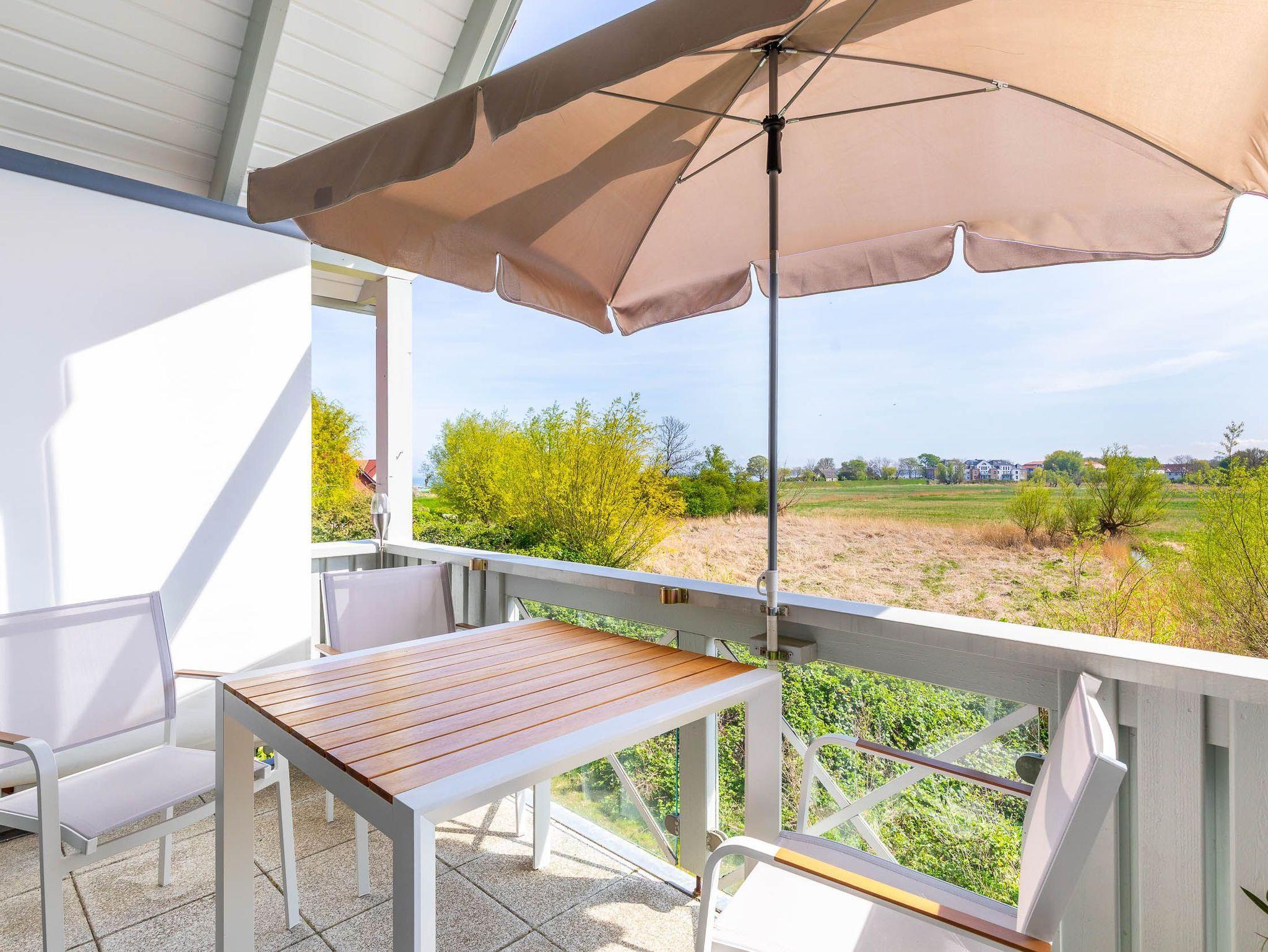 Der nach Süd-Ost ausgerichtete Balkon, welchen Sie vom Wohnbereich aus erreichen, ermöglicht einen herrlichen Blick auf das Haff. Seitlich können Sie vom Balkon aus sogar auf die Ostsee schauen.