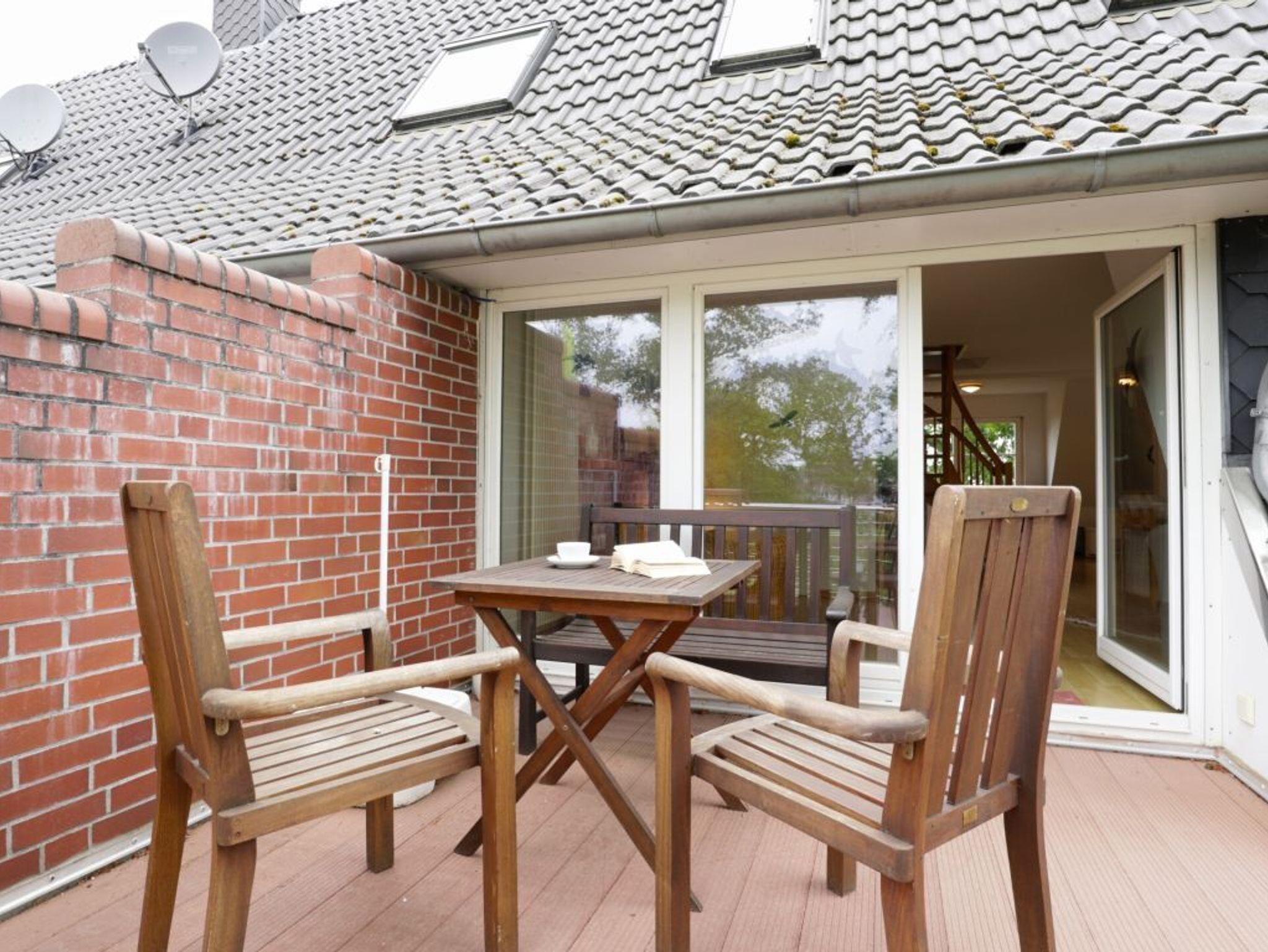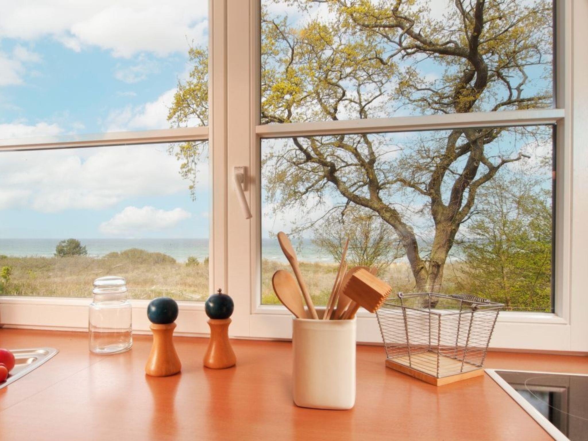 Die integrierte Wohnküche mit Ostseeblick bietet alles, was Sie für die Zubereitung Ihrer Lieblingsgerichte benötigen: Herd, Backofen, Mikrowelle, Kühlschrank mit separatem Gefrierfach, Kaffeemaschine, Wasserkocher, Toaster u. v. m. Ihre Mahlzeiten genießen Sie am Esstisch. In der warmen Jahreszeit lädt der nach Westen ausgerichtete, saisonal möblierte Balkon mit Blick ins Grüne zum Verweilen ein. Über eine Treppe gelangen Sie in die obere Ebene mit einem schönen Schlafzimmer (Doppelbett, Kleiderschrank) und einem Tageslicht-Duschbad mit Waschtisch und WC.