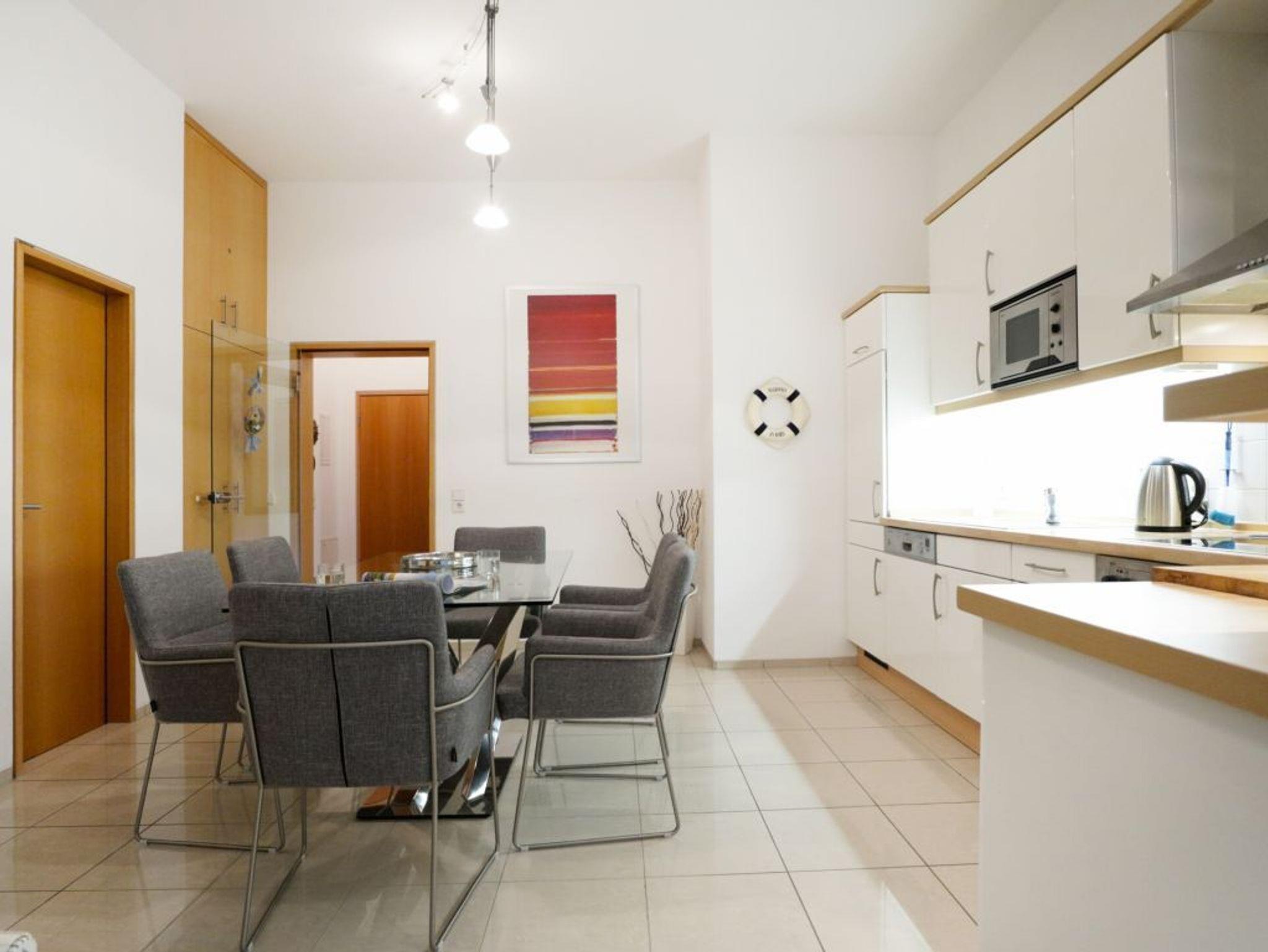 Es empfängt Sie ein sehr schönes 3-Zimmer Hochparterre Appartement mit zwei Schlafzimmern. Mit einer großzügigen Wohnfläche von 83qm bietet die Wohnung genügend Platz für bis zu 4 Personen. Im gemütlichen Wohnzimmer mit Sofa, Sessel, Fernseher, Musikanlage, WLAN, Telefon, FAX-Gerät, ist die Wohnküche integriert und mit Geschirrspüler, Mikrowelle, Backofen, Kühlschrank mit integr. Gefrierfach, Toaster, Wasserkocher und Kaffeemaschine ausgestattet. Somit ist eine bequeme Eigenversorgung auch während des Urlaubs möglich. Ein großer Esstisch lädt zu gemeinsamen Mahlzeiten ein. Erholung finden Sie auf einem der beiden saisonal möblierten Balkone in nord-ost, süd-west Ausrichtung. Die Schlafzimmer sind zum einen mit Doppelbett, Kleiderschrank und zum andren mit einer ausklappbaren Schlafcouch 1,40m x 1,90m eingerichtet. Ein Tageslicht Duschbad mit Waschtisch, WC ist zugehörig. Eine Waschmaschine steht gegen Gebühr zur Verfügung. Bitte beachten Sie, dass Haustiere ebenso wie Rauchen nicht gestattet sind.